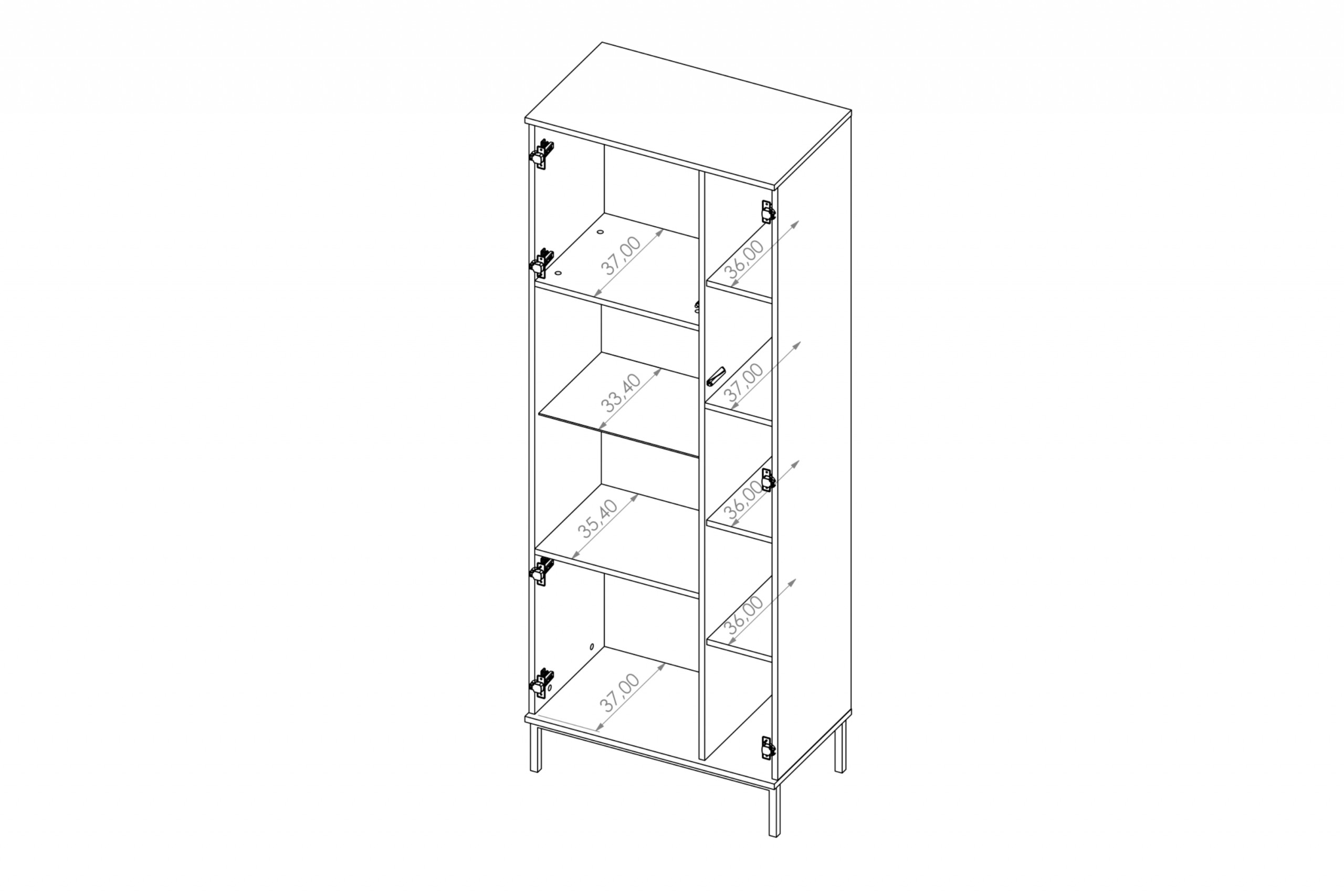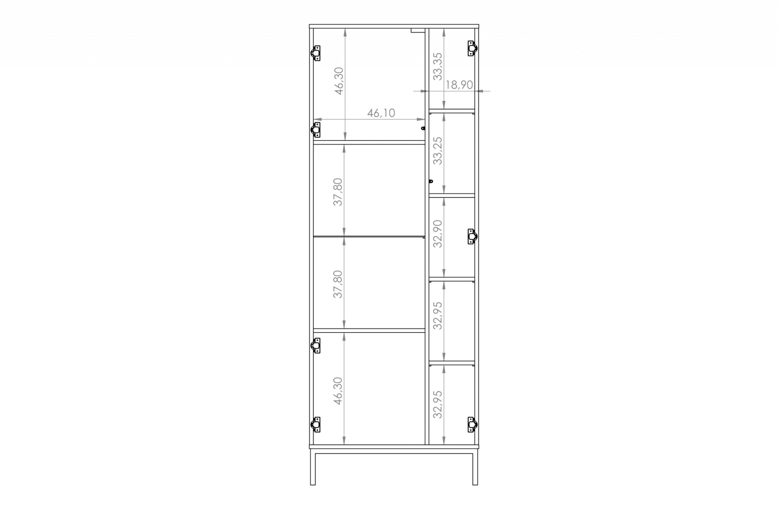Witryna została wykonana z płyty wiórowej, gwarantując stabilność i wytrzymałość na lata, a tylna ściana z płyty HDF. Posiada dwie pary drzwi, za większymi znajdują się trzy półki, z czego jedna jest szklana z możliwością podświetlenia. Pozwala wyeksponować przedmioty, które chcemy aby było widoczne w pomieszczeniu jak np. ramki ze zdjęciami. Za drugimi drzwiami są mniejsze półki, które również pomagają w organizacji i przechowywaniu.
