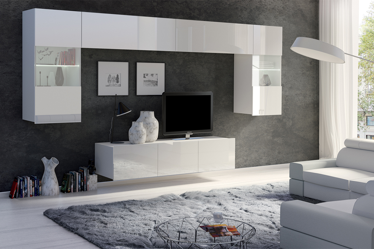 Witryna wisząca biały połysk z podświetleniem PAVO - kolor biały połysk/biały matowy