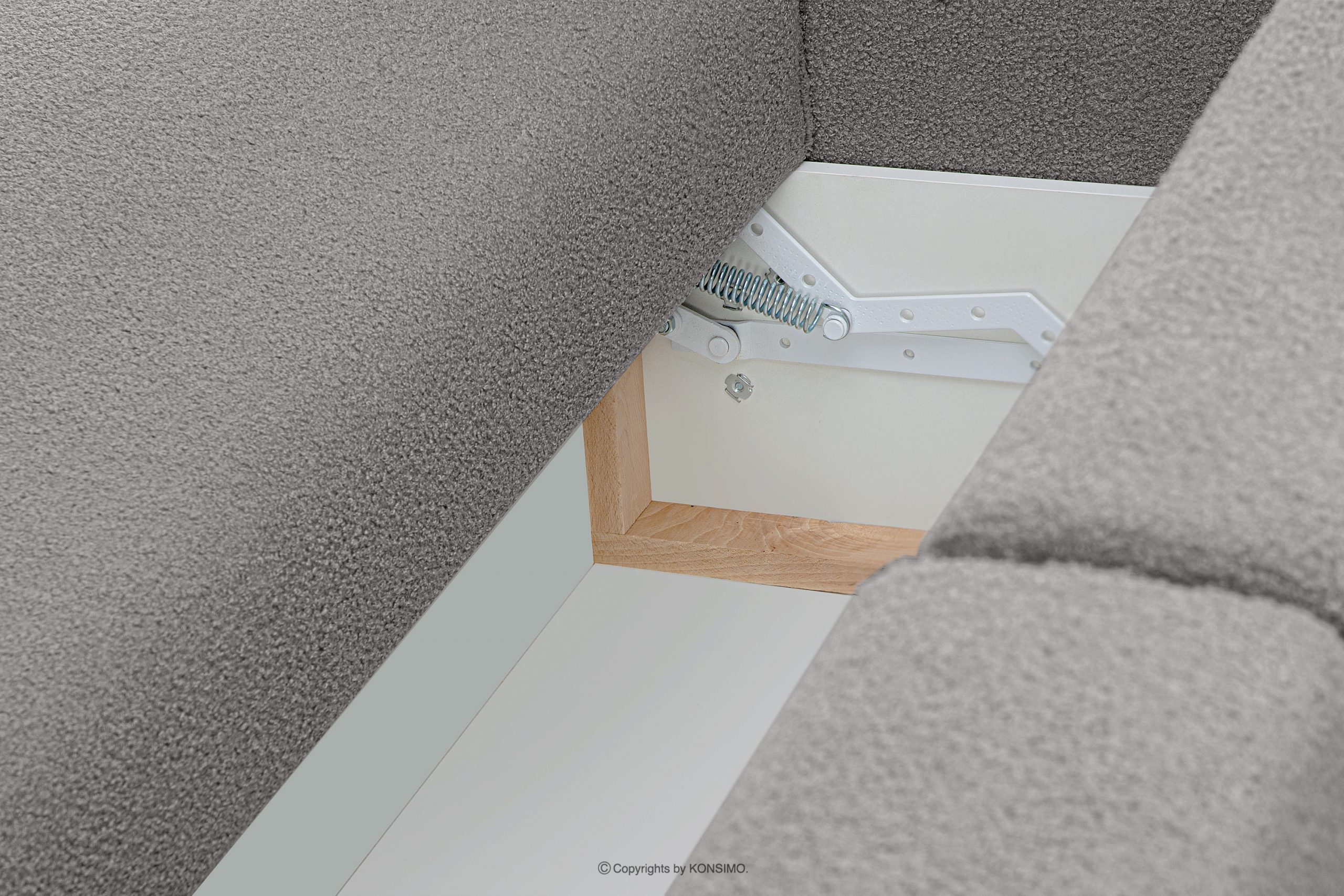 Obicie to przyjemna w dotyku tkanina boucle, która jest łatwa w utrzymaniu czystości oraz długo utrzymuje niezmienny wygląd.
