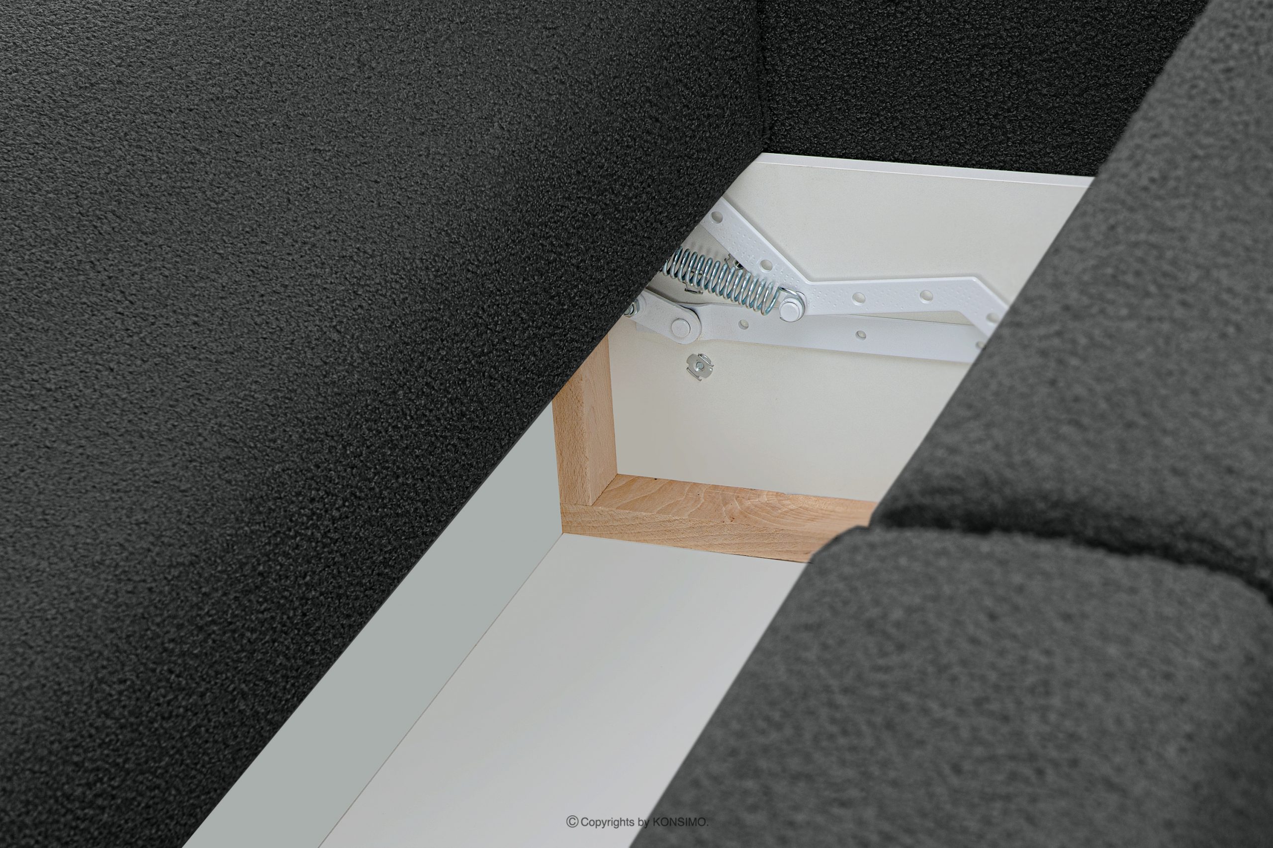 Obicie to przyjemna w dotyku tkanina boucle, która jest łatwa w utrzymaniu czystości oraz długo utrzymuje niezmienny wygląd.