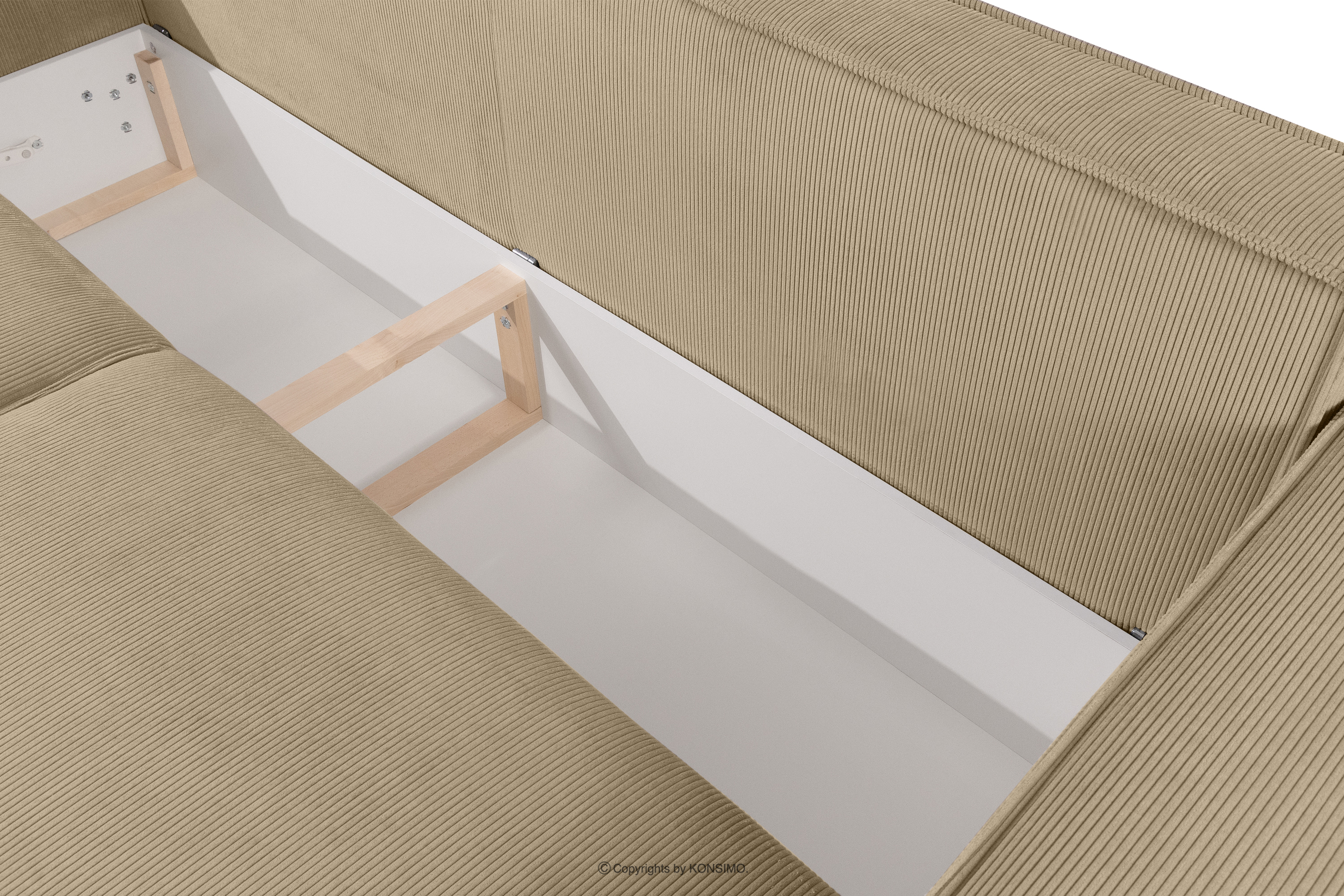 Nasza sofa NAPI to nie tylko wyjątkowy wygląd, to także solidna konstrukcja. Siedzisko wypełnione jest pianką T30/45 80 oraz znajduje się w nim sprężyna falista, co zapewnia długotrwałą wygodę i sprężystość. Dzięki temu połączeniu sofa także jest wysoce odporna na odkształcenia. To mebel, który zachowa swoją formę na długie lata. Wypoczynek wyposażony jest w pojemnik na pościel, w którym jest dużo miejsca, aby przechowywać dodatkowe komplety pościeli, kocy, czy poduszek. Funkcja spania to zdecydowanie jeden z największych atutów tej sofy. Zastosowany system DL polega na lekkim podniesieniu siedziska do góry i przesunięcia do przodu, by w wolną przestrzeń położyć oparcie.