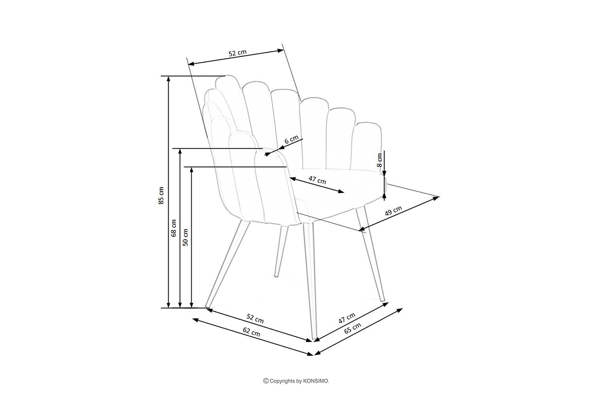Wyjątkowe krzesło tapicerowane o oryginalnym kształcie przypominającym muszelkę, które natychmiast przyciąga wzrok. Nowoczesna konstrukcja oparta na smukłym, metalowym stelażu malowanym proszkowo gwarantuje zarówno stabilność, jak i lekki, designerski wygląd. Welurowa tapicerka jest niezwykle przyjemna w dotyku i łatwa w utrzymaniu czystości Staranne pikowanie nie tylko podkreśla unikatowy kształt siedziska, ale również dodaje meblowi ekskluzywnego charakteru.