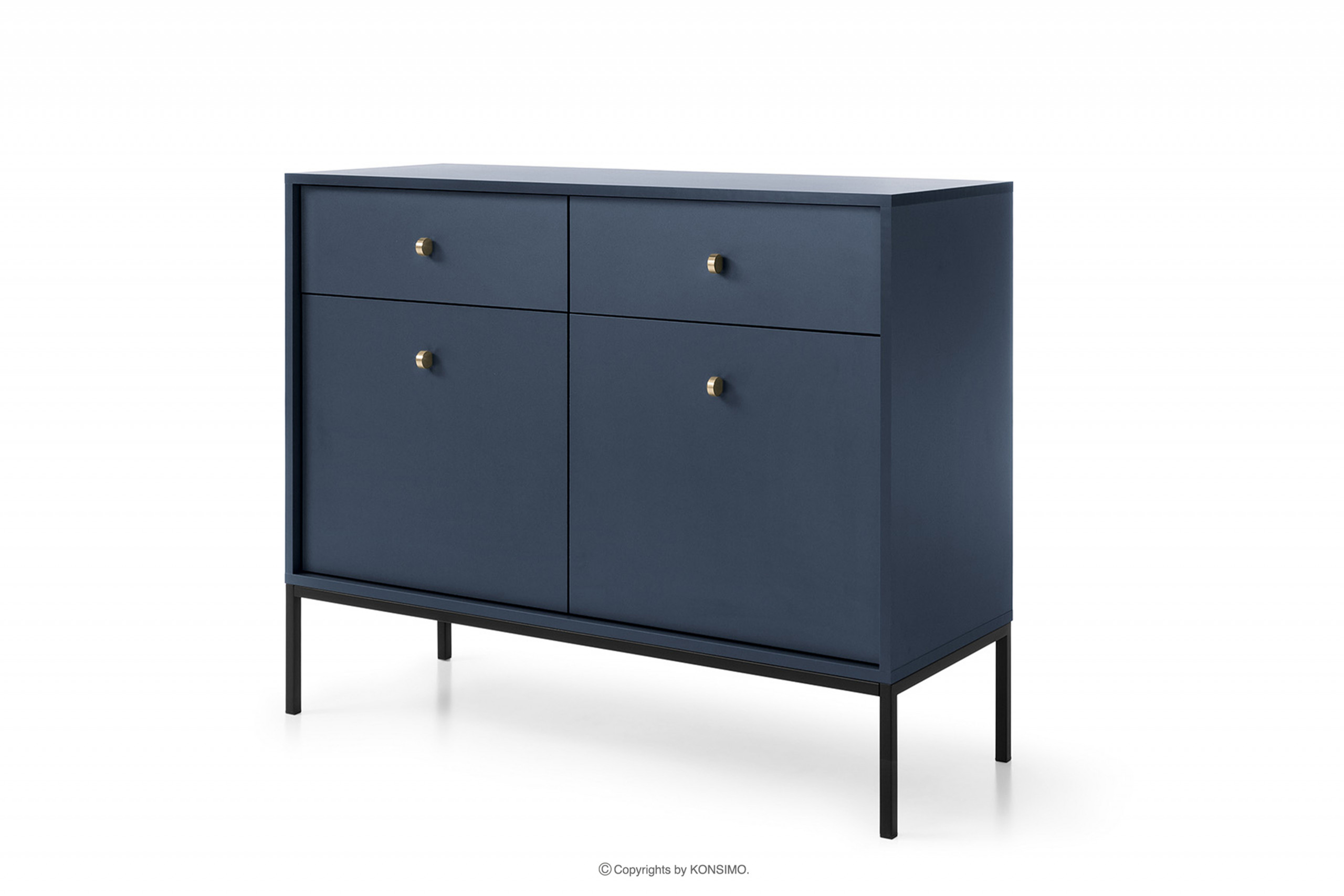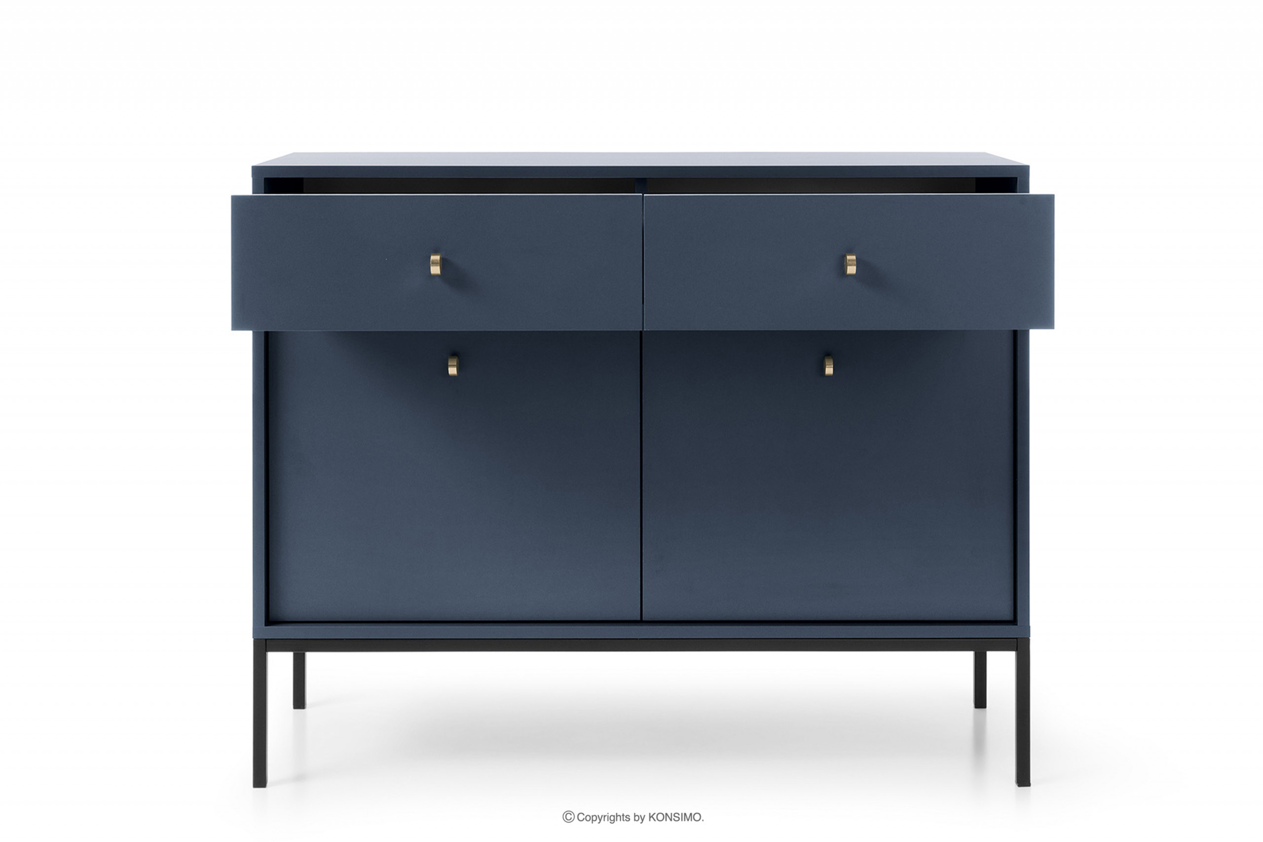 Komoda z kolekcji GEMMA to produkt, który został zaprojektowany oraz wykonany w Polsce. Komoda mierzy 104 cm szerokości, 83 cm wysokości, 39 cm głębokości, a same nóżki mają 18 cm wysokości. Komoda została wykonana z płyty wiórowej 16 mm w kolorze niebieskim, co wyróżnia tę kolekcję, ponieważ płyty wiórowe są są doskonałym materiałem do produkcji mebli twardych, a nasze płyty charakteryzują się klasą higieniczności E1 i są przyjazne dla środowiska i ludzi. Tylna ściana jest z płyty HDF. Szuflady zamontowane zostały prowadnicach kulkowych 300 mm. Komoda posiada uchwyty metalowe w kolorze złotym. Całkowita waga mebla to 35 kg.