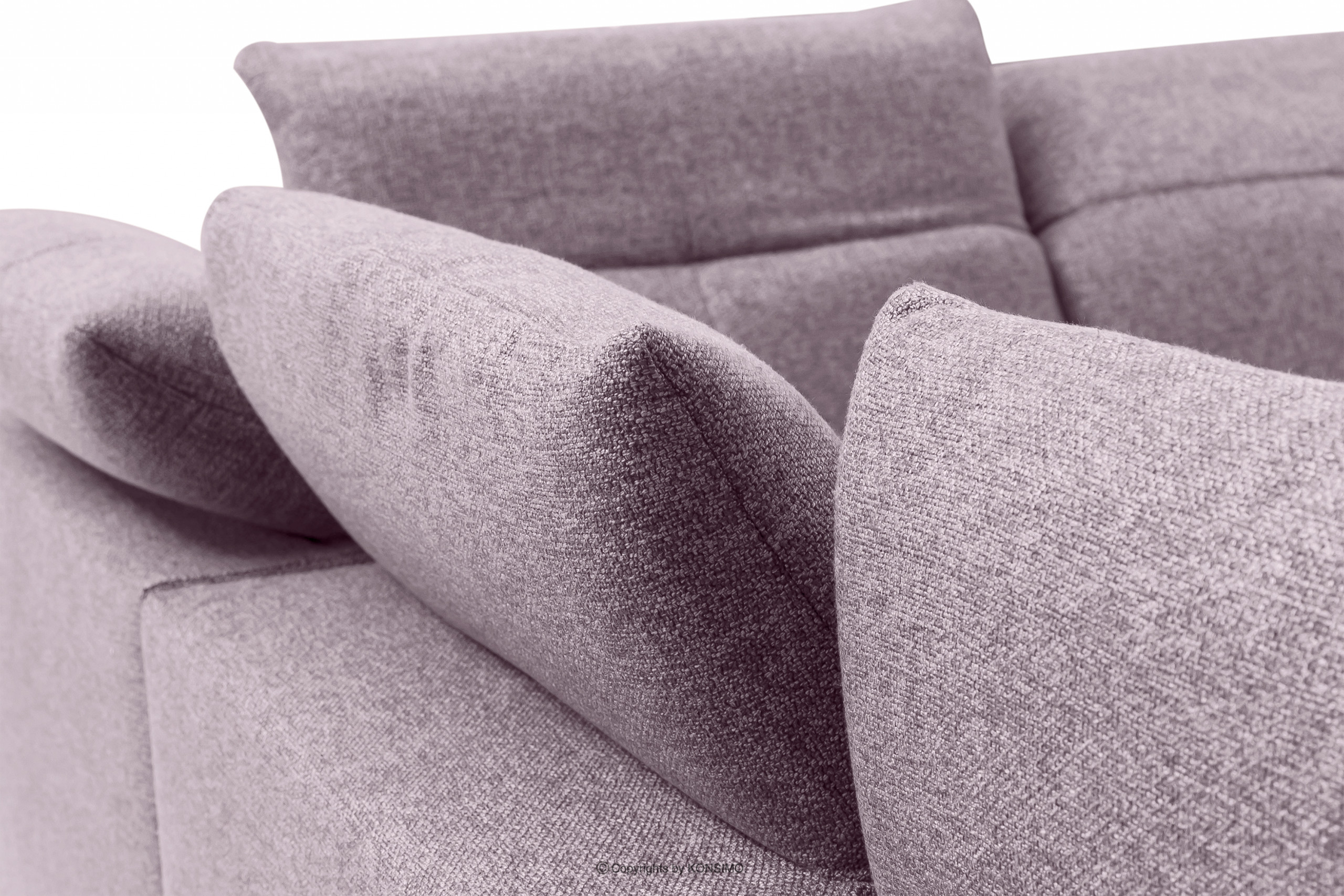 Narożnik z funkcją relax różowy lewy jest idealnym rozwiązaniem do dużych salonów. Obity jest wysokiej jakości tkaniną plecioną, która cechuje się łatwością w utrzymaniu czystości. Całość postawiona jest na wysokich nóżkach w nowoczesnym stylu. Wykonane są z metalu oraz malowane na czarno. Idealnie podkreślają nowoczesność narożnika. Dodatkowo posiada funkcję relax, która umożliwia elektryczne regulowanie zagłówków w pięciu płaszczyznach oraz siedziska.