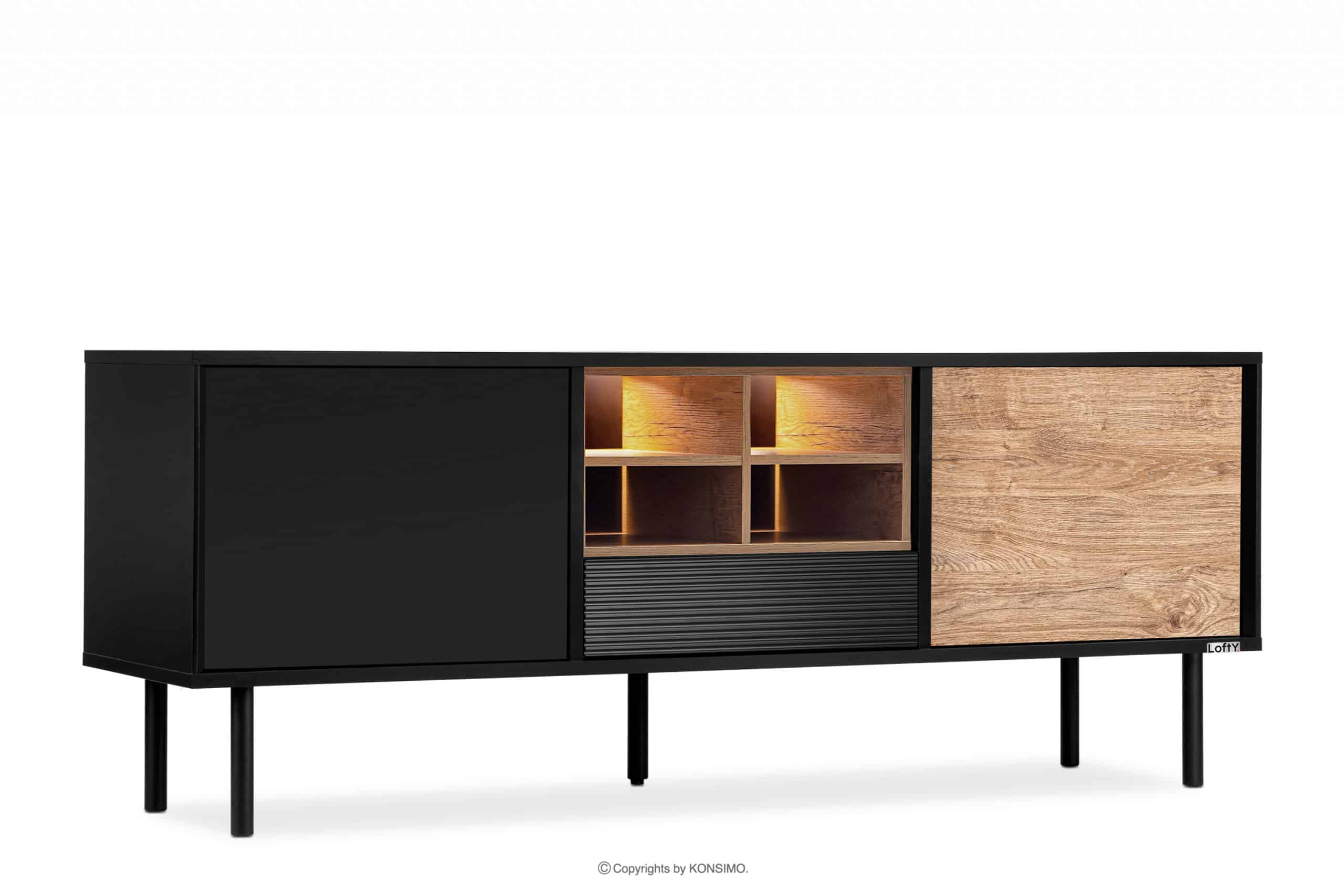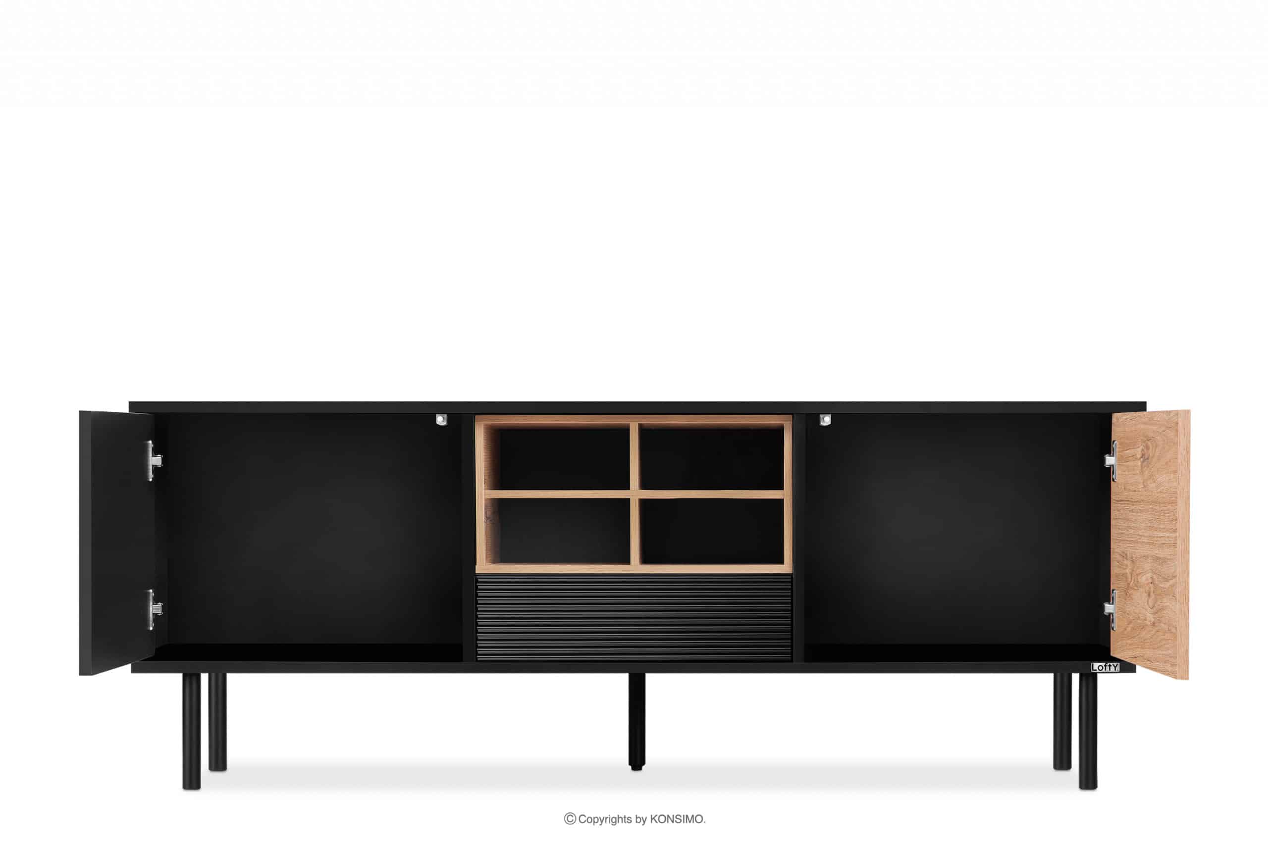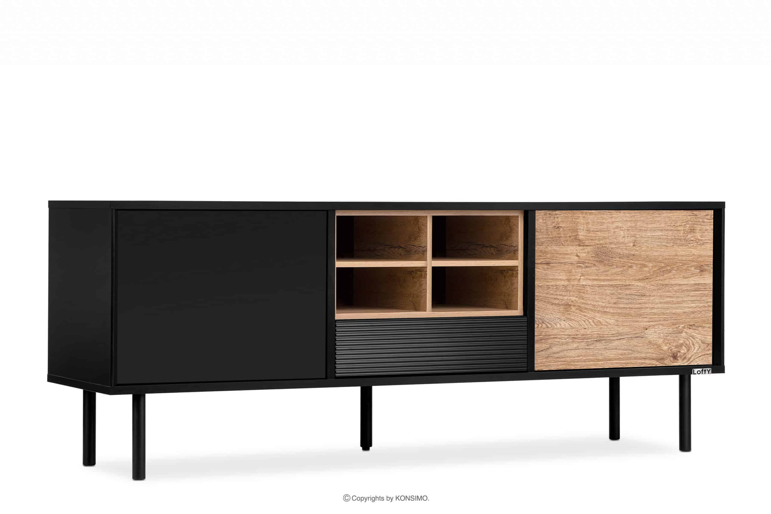 Szeroka szafka RTV w stylu loft z półkami LOFTY - kolor czarny/dąb naturalny