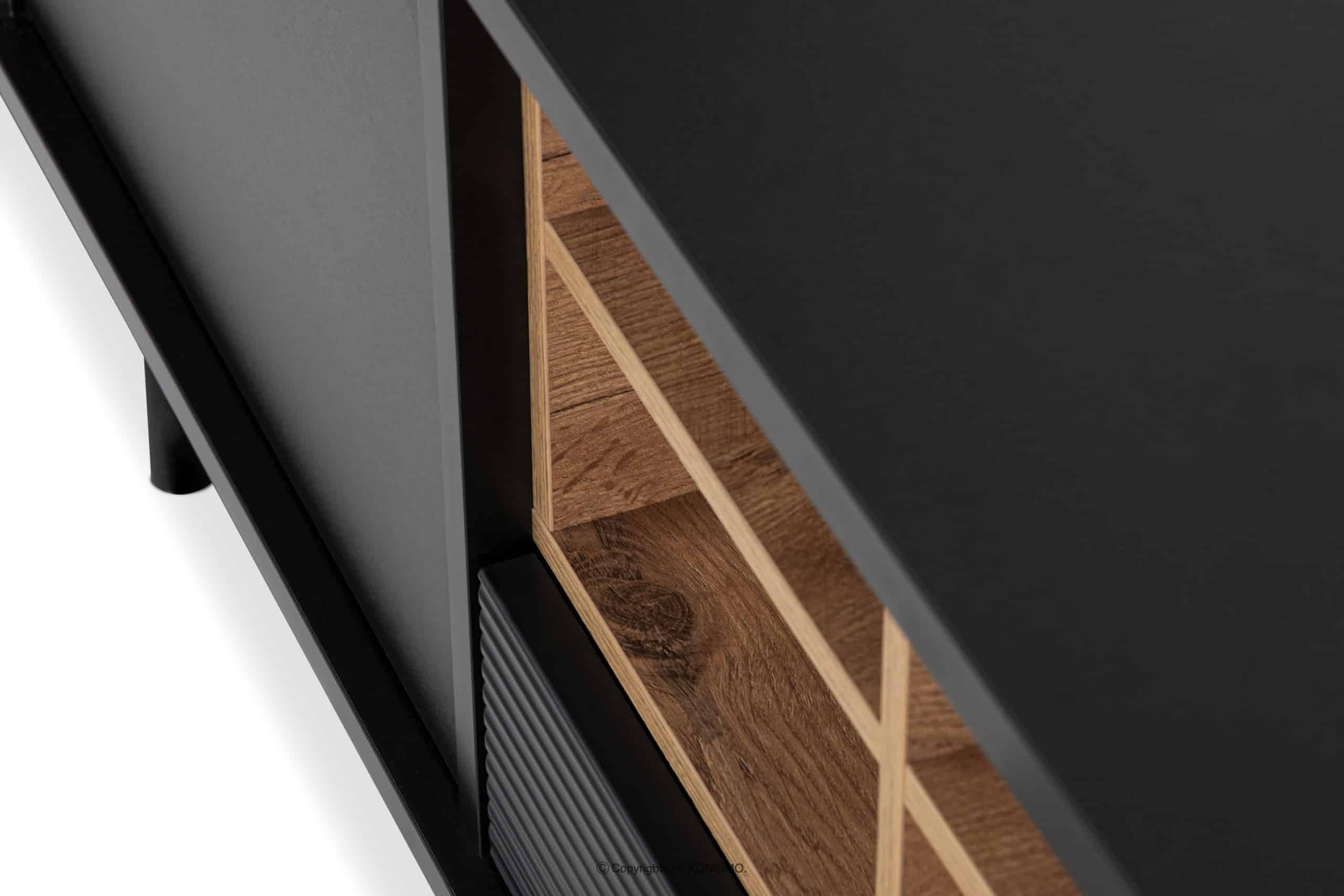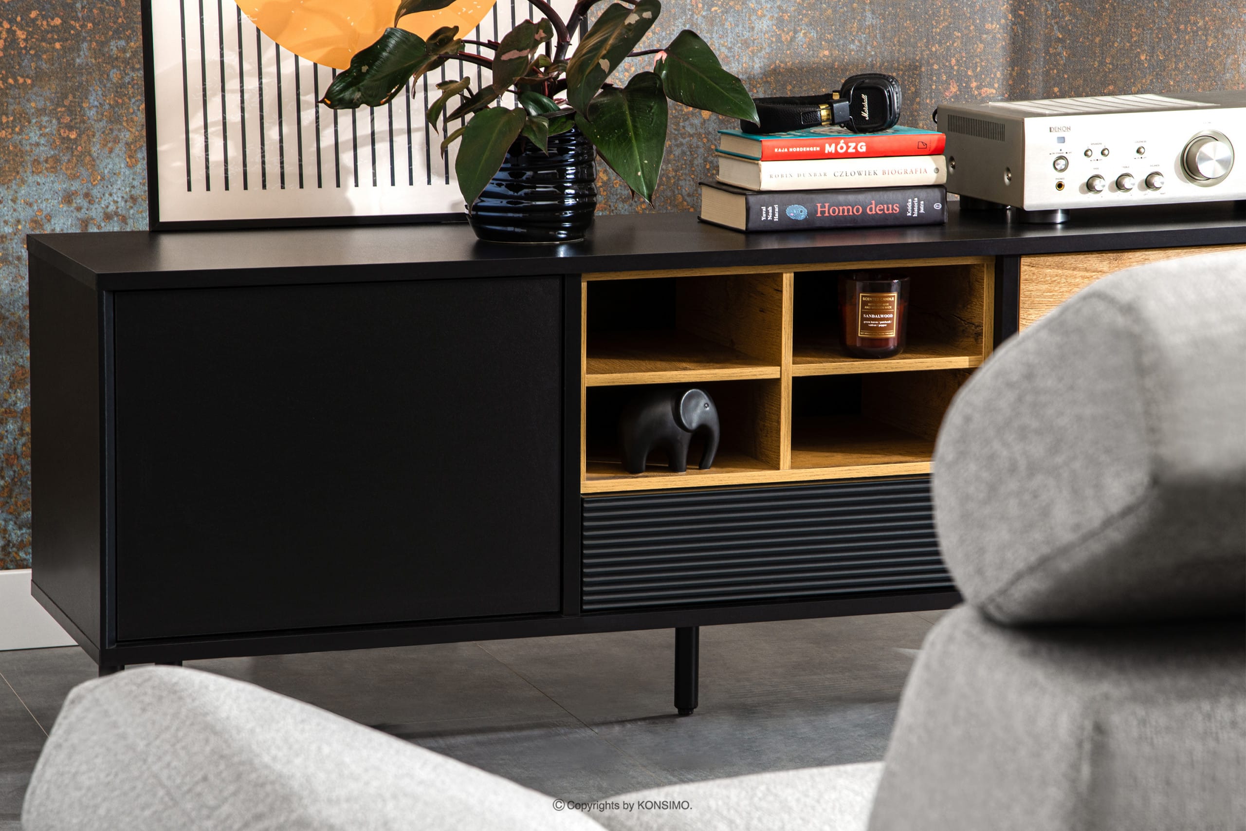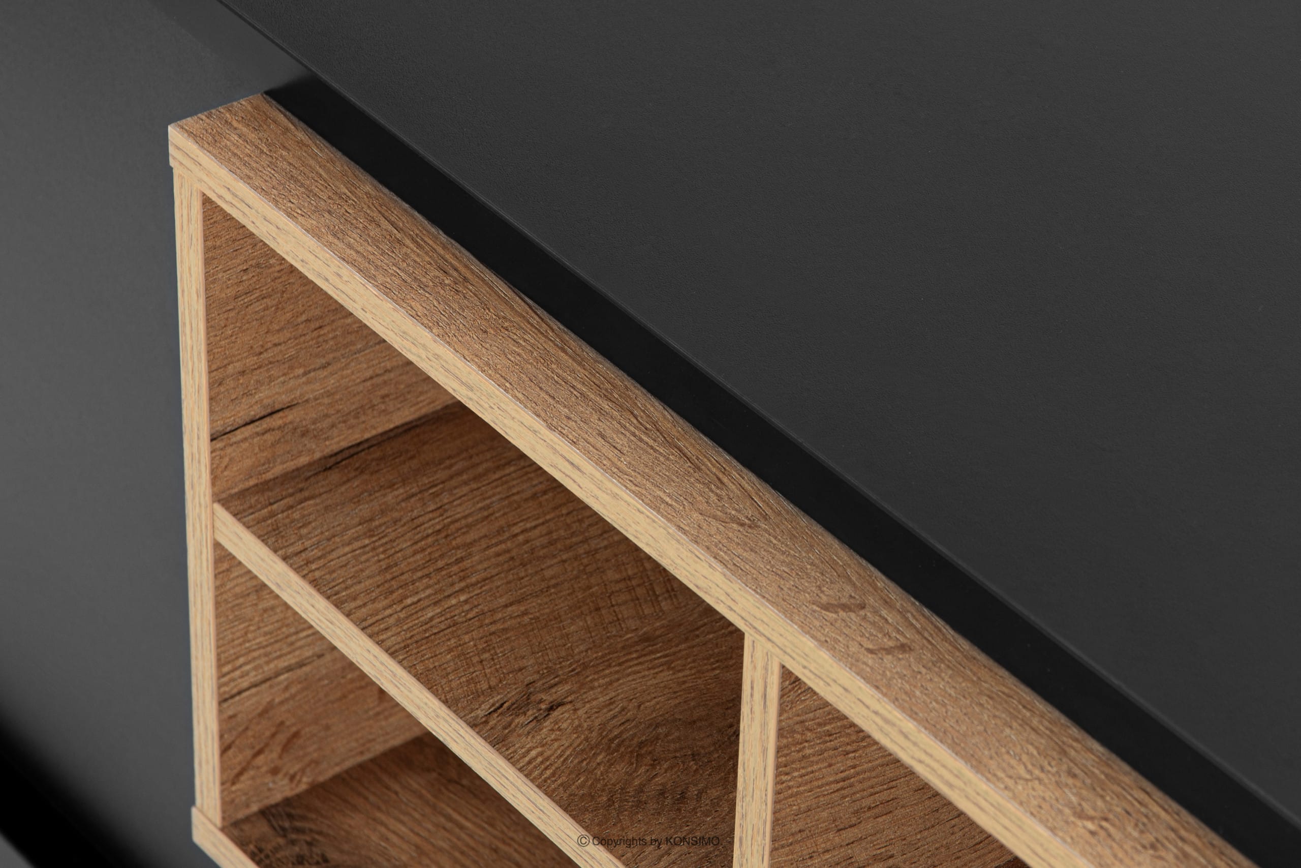 Szeroka szafka RTV w stylu loft z półkami LOFTY - kolor czarny/dąb naturalny