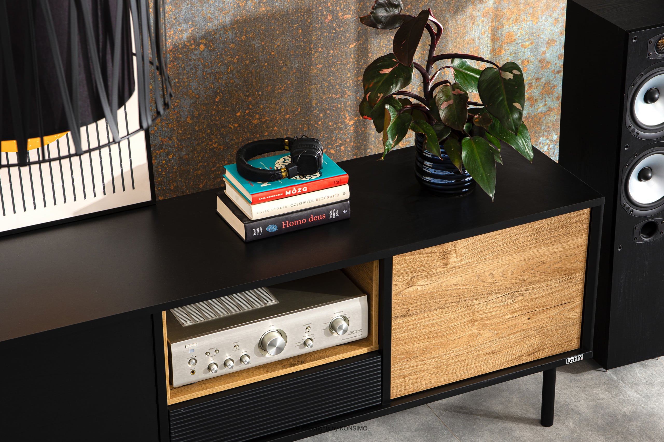 LOFTY zobacz całą kolekcję Szeroka szafka RTV w stylu loft z półkami- kolor czarny/dąb naturalny