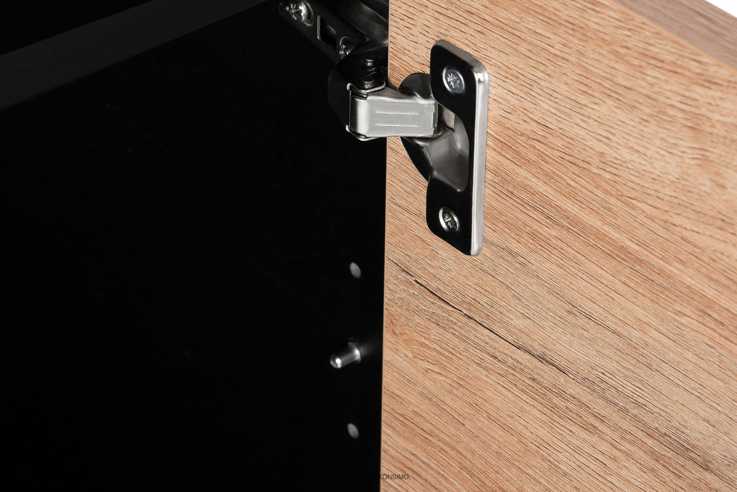 Korpus i blat wykonane są z laminatu o grubości 18 mm, który jest bardzo odporny na zarysowania i łatwy w czyszczeniu. Z kolei przednie drzwi, które są ryflowane wykonano z MDF i PVC. Tylna ściana jest specjalnie wzmocniona, aby zapewnić stabilność. Krawędź wykonana jest z tworzywa ABS o grubości 1mm, które charakteryzuje się dużą odpornością na uszkodzenia mechaniczne i działanie promieni słonecznych. Komoda postawiona jest na wysokich lakierowanych nogach z litego drewna, nawiązując do stylu loftowego. W drzwiach zastosowano zawiasy puszkowe, które można regulować w trzech płaszczyznach.