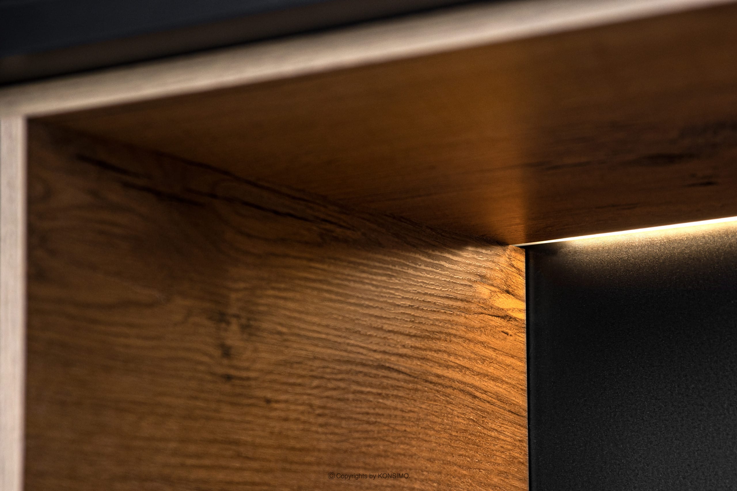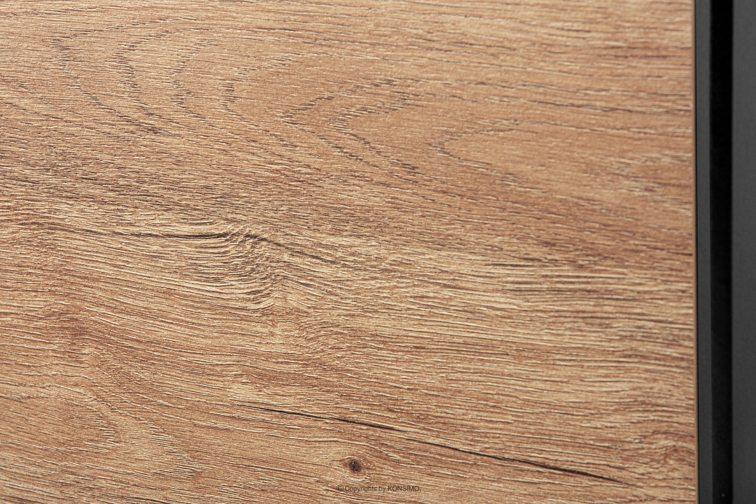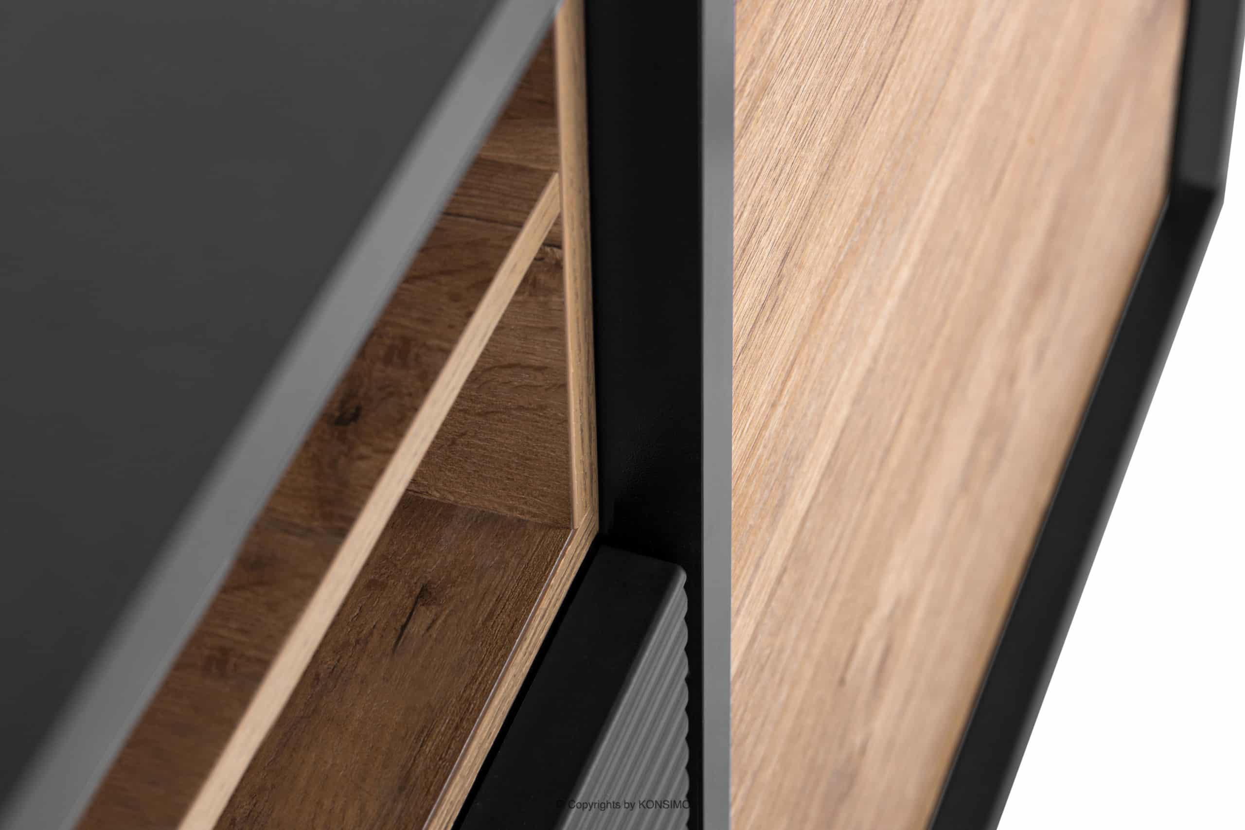 Korpus i blat wykonane są z laminatu o grubości 18 mm, który jest bardzo odporny na zarysowania i łatwy w czyszczeniu. Z kolei przednie drzwi, które są ryflowane wykonano z MDF i PVC. Tylna ściana jest specjalnie wzmocniona, aby zapewnić stabilność. Krawędź wykonana jest z tworzywa ABS o grubości 1mm, które charakteryzuje się dużą odpornością na uszkodzenia mechaniczne i działanie promieni słonecznych. Komoda postawiona jest na wysokich lakierowanych nogach z litego drewna, nawiązując do stylu loftowego. W drzwiach zastosowano zawiasy puszkowe, które można regulować w trzech płaszczyznach.