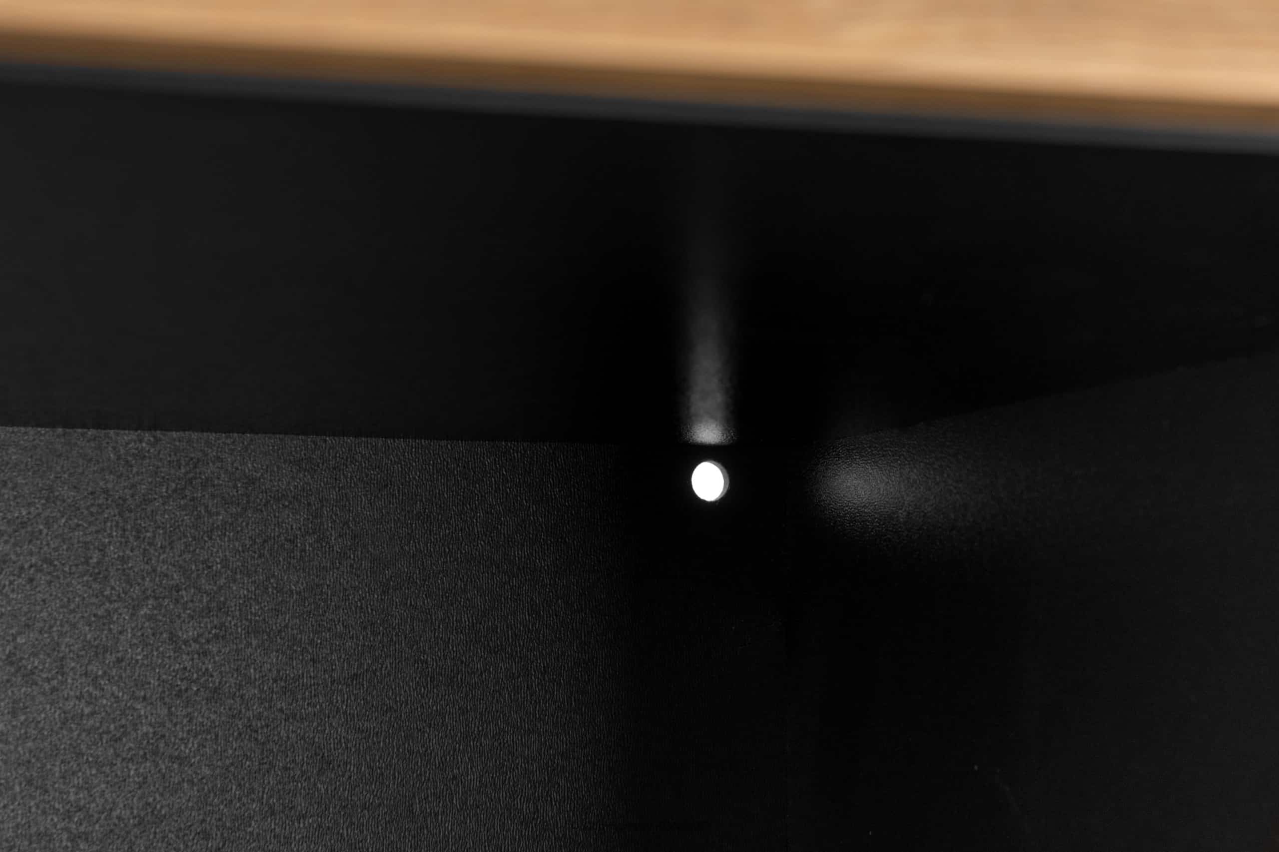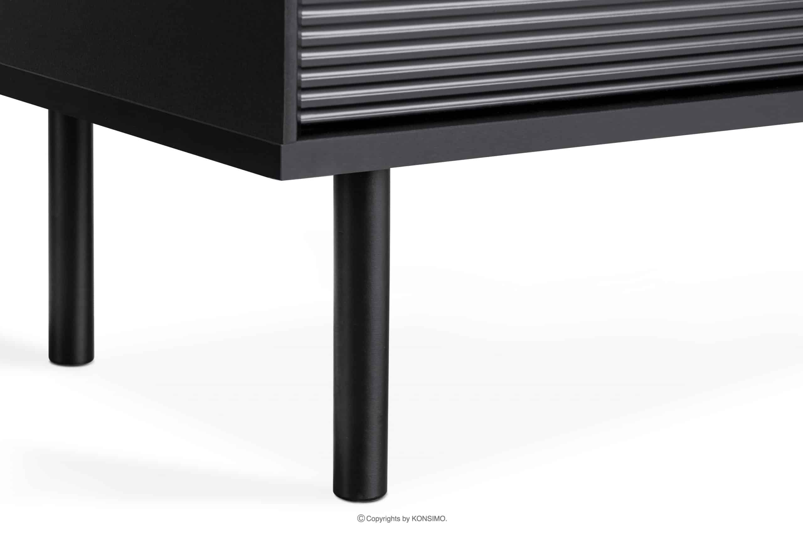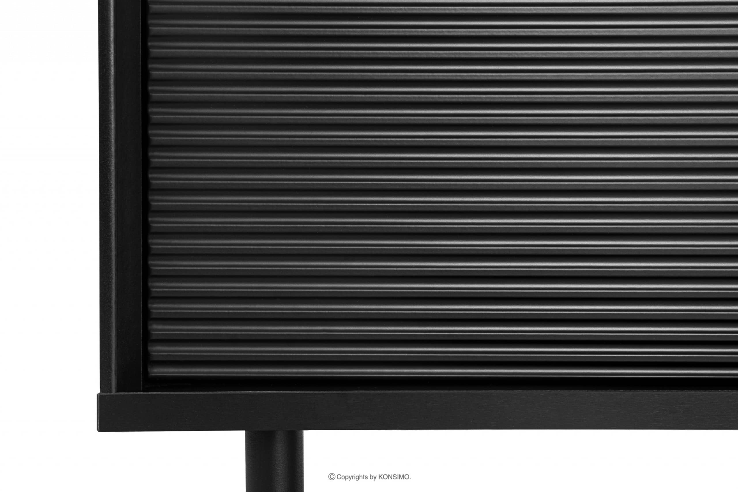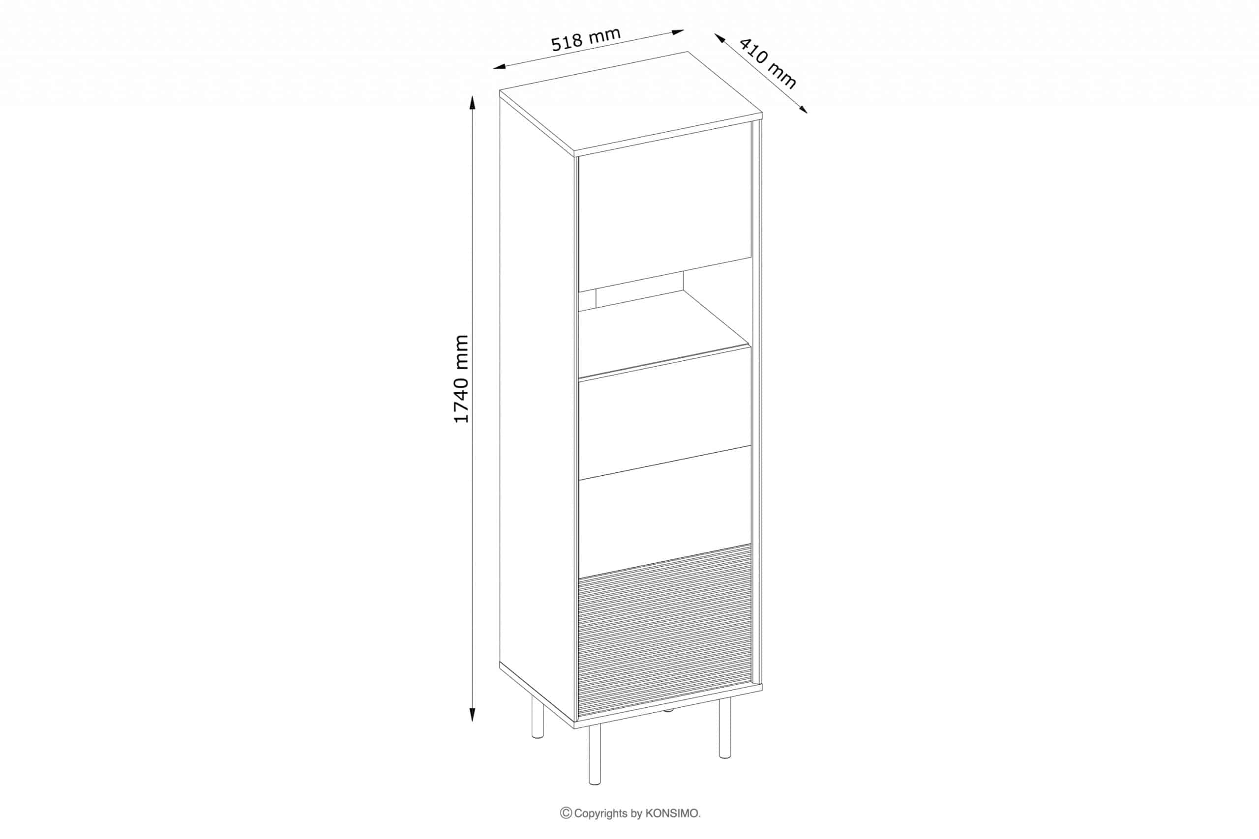 Regał wykonany jest z laminatu o grubości 18 mm, bardzo odpornego na zarysowania i łatwego w utrzymaniu czystości. Z kolei elementy ryflowane na froncie wykonane są z MDF i PVC. Tylna ściana jest specjalnie wzmocniona, aby zapewnić stabilność. Krawędzie wykonane są z tworzywa ABS o grubości 1mm o wysokiej odporności na uszkodzenia mechaniczne. Nogi wykonane są z drewna, nawiązujące do stylu loftowego. Drzwi posiadają ukryte zawiasy, które można regulować w trzech płaszczyznach.