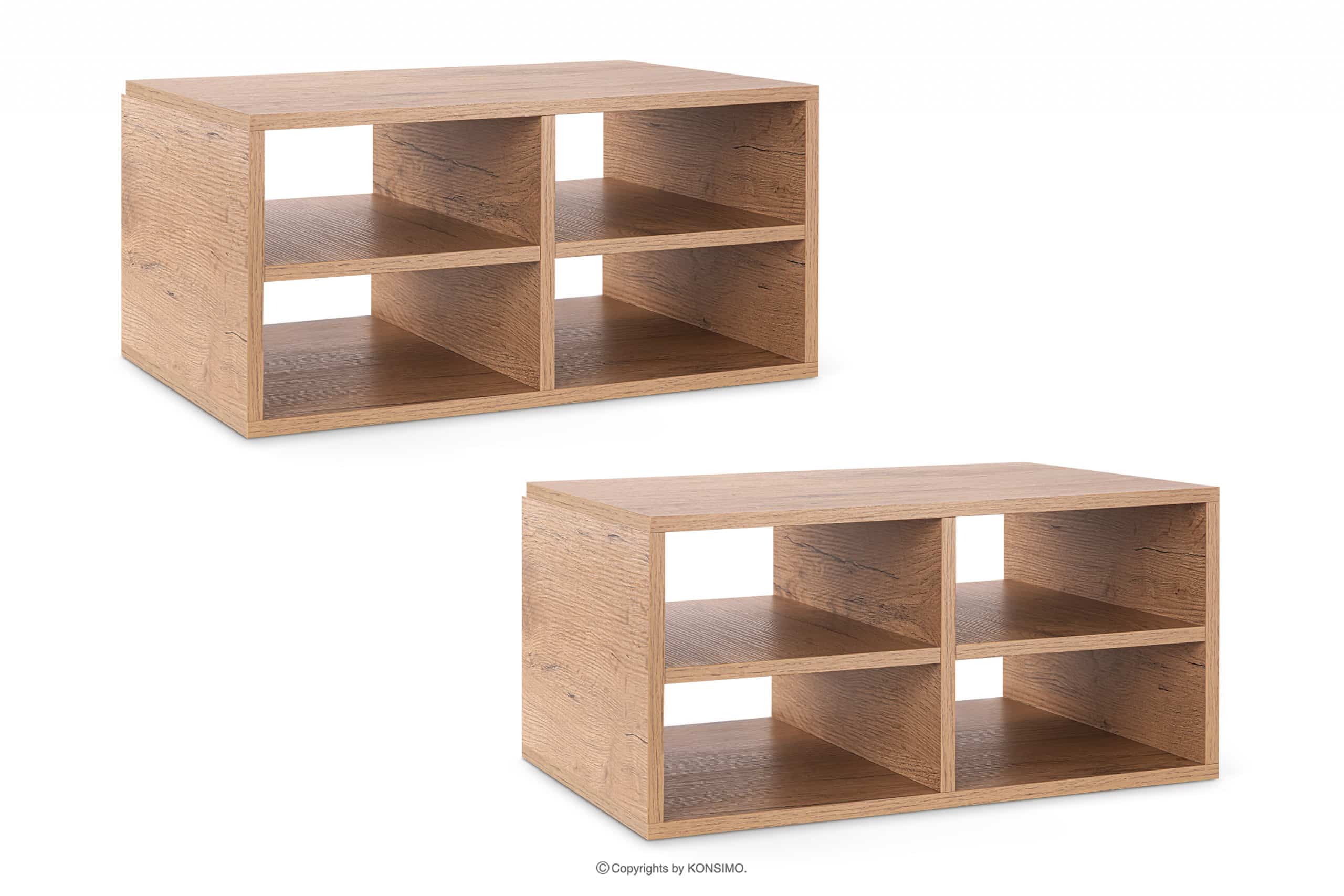 Dwudrzwiowa witryna na wysokich nogach w stylu loft to produkt, w który zostało włożone wiele starań, aby był jak najbardziej wytrzymały. Posiada kilka półek, oraz cztery szuflady w kolorze dębu naturalnego, schowane również za drzwiami witryny. Dzięki swojej budowie pomieści wiele przedmiotów i pomoże w ich organizacji. Meble wpasują się w industrialne wnętrza, dzięki zastosowanej kolorystyce oraz wysokim drewnianym nóżkom.