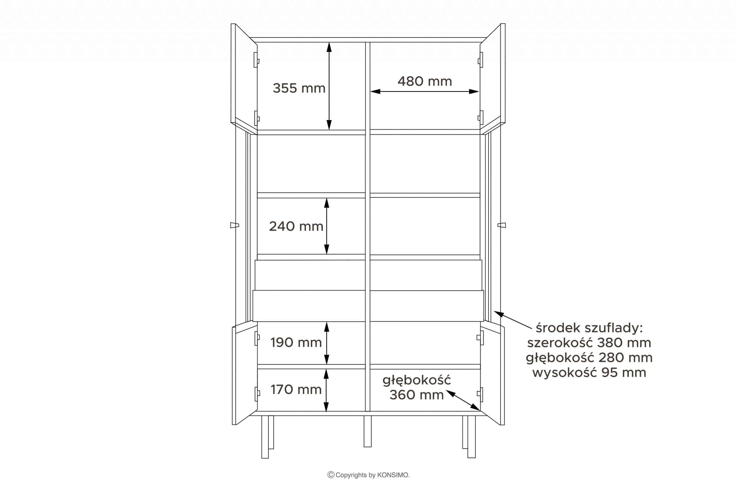 Dwudrzwiowa witryna z szufladami w stylu loft to produkt, w który zostało włożone wiele starań, aby był jak najbardziej wytrzymały. Posiada kilka półek, oraz cztery szuflady w kolorze dębu naturalnego, schowane również za drzwiami witryny. Dzięki swojej budowie pomieści wiele przedmiotów i pomoże w ich organizacji. Meble wpasują się w industrialne wnętrza, dzięki zastosowanej kolorystyce oraz wysokim drewnianym nóżkom.