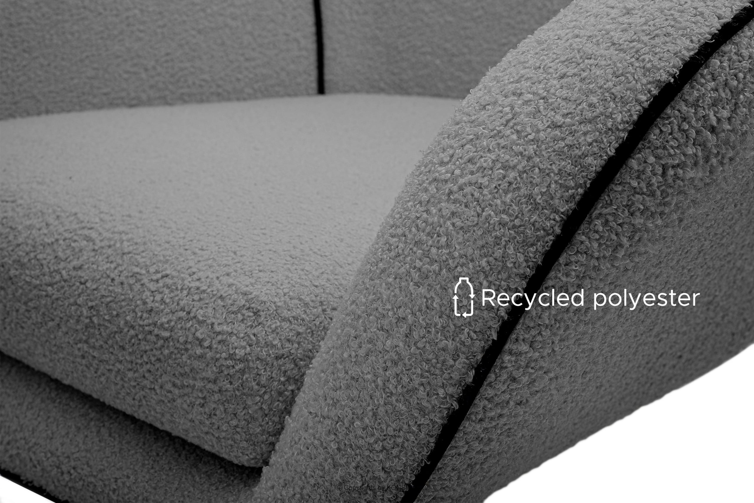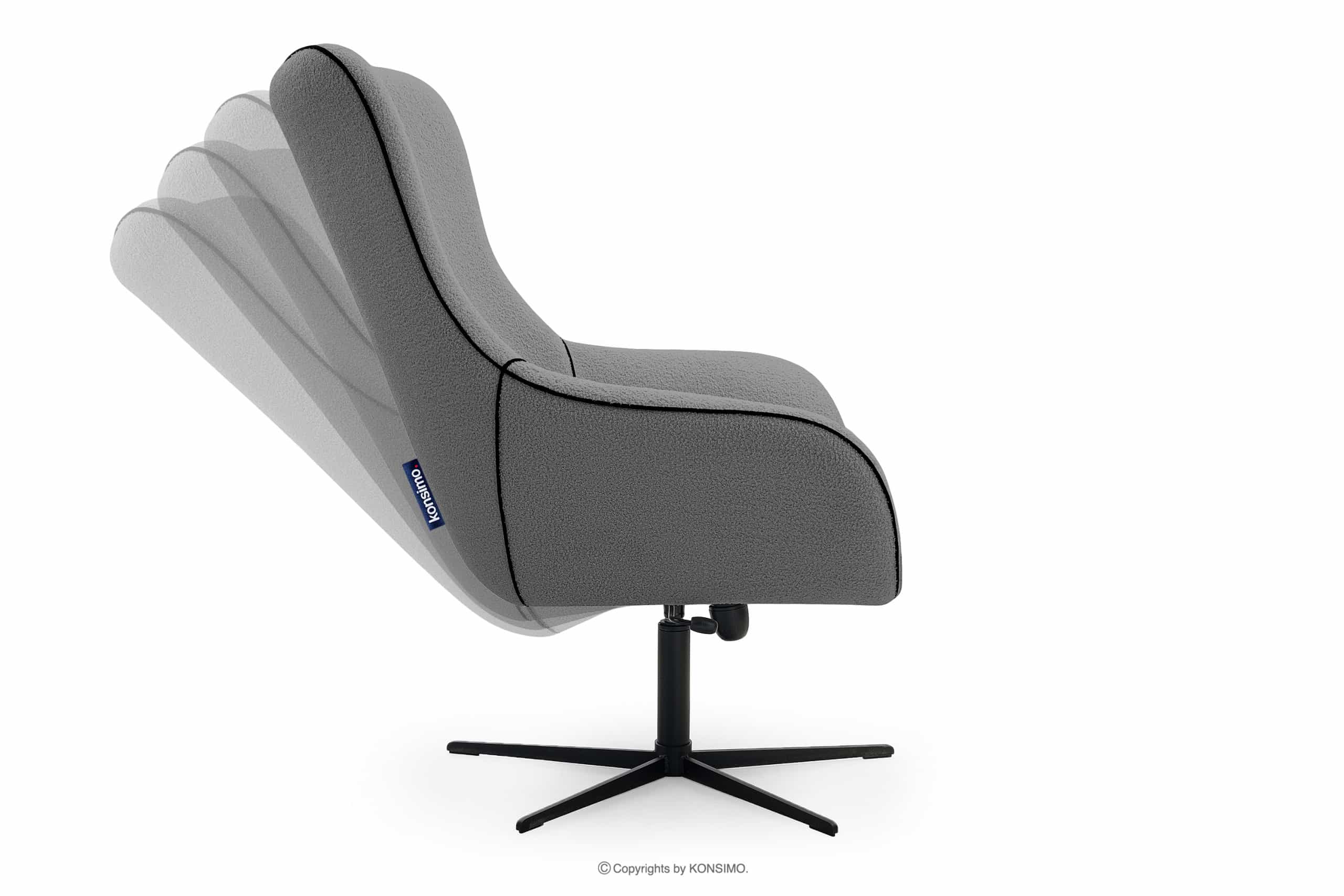 Siedzisko znajduje się na wysokiej nóżce, dzięki której konstrukcja fotela jest stabilna i mocno osadzona na podłodze. Dla zapewnienia największego komfortu oparcie posiada możliwość kilkustopniowej regulacji dla ustawienia najlepszego stopnia odchylenia. Wygodę siedzenia gwarantuje zastosowana pianka poliuretanowa PUR wraz z wyjątkowo miękką tkaniną typu baranek.. Faktura zakręconych włókien pozwoli nadać wnętrzu przytulnego charakteru. Ciemne przeszycie dodatkowo nadaje fotelowi charakteru, czyniąc go idealnym elementem wystroju salonu lub sypialni.