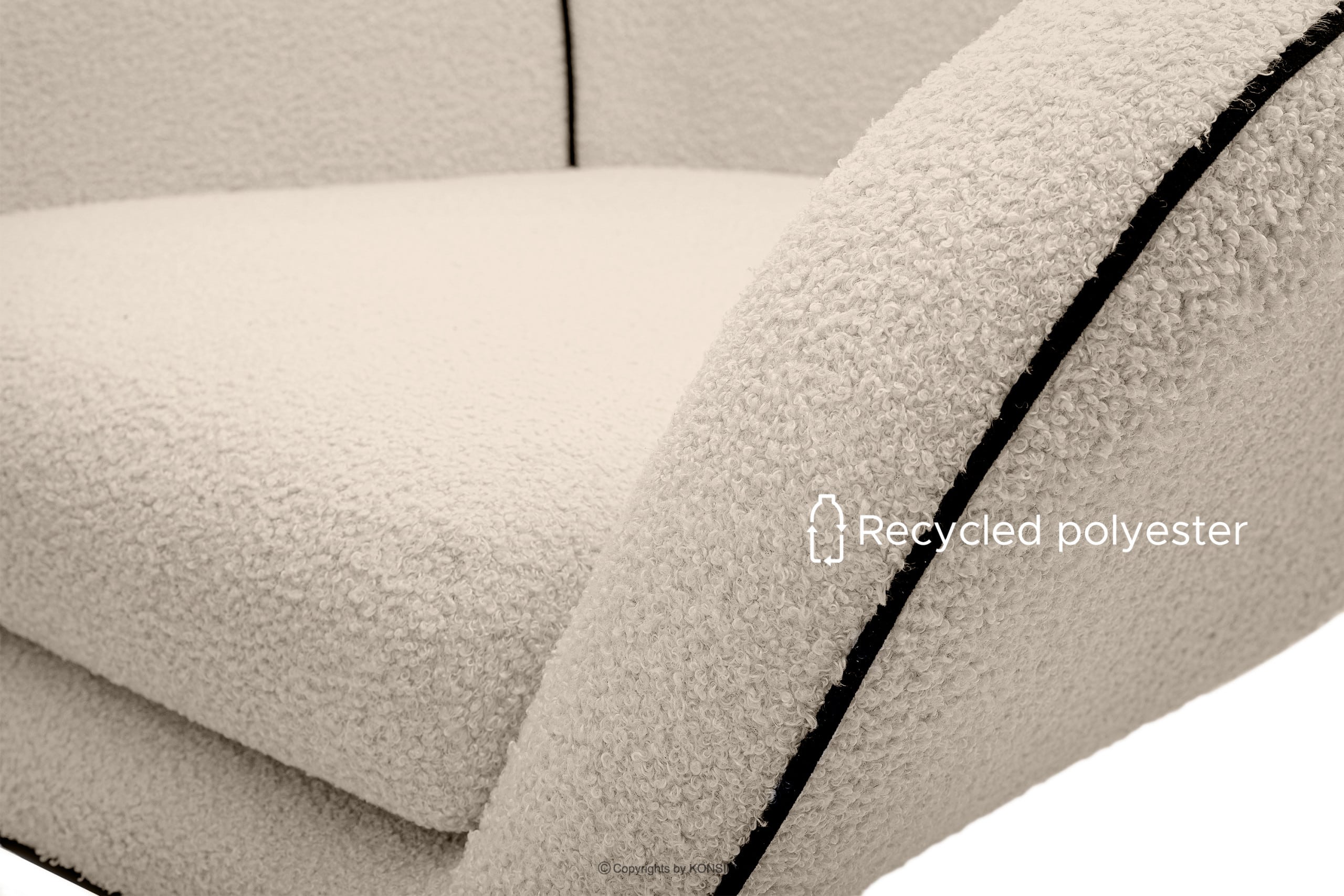 Siedzisko znajduje się na wysokiej nóżce, dzięki której konstrukcja fotela jest stabilna i mocno osadzona na podłodze. Dla zapewnienia największego komfortu oparcie posiada możliwość kilkustopniowej regulacji dla ustawienia najlepszego stopnia odchylenia. Wygodę siedzenia gwarantuje zastosowana pianka poliuretanowa PUR wraz z wyjątkowo miękką tkaniną typu baranek.. Faktura zakręconych włókien pozwoli nadać wnętrzu przytulnego charakteru. Ciemne przeszycie dodatkowo nadaje fotelowi charakteru, czyniąc go idealnym elementem wystroju salonu lub sypialni.