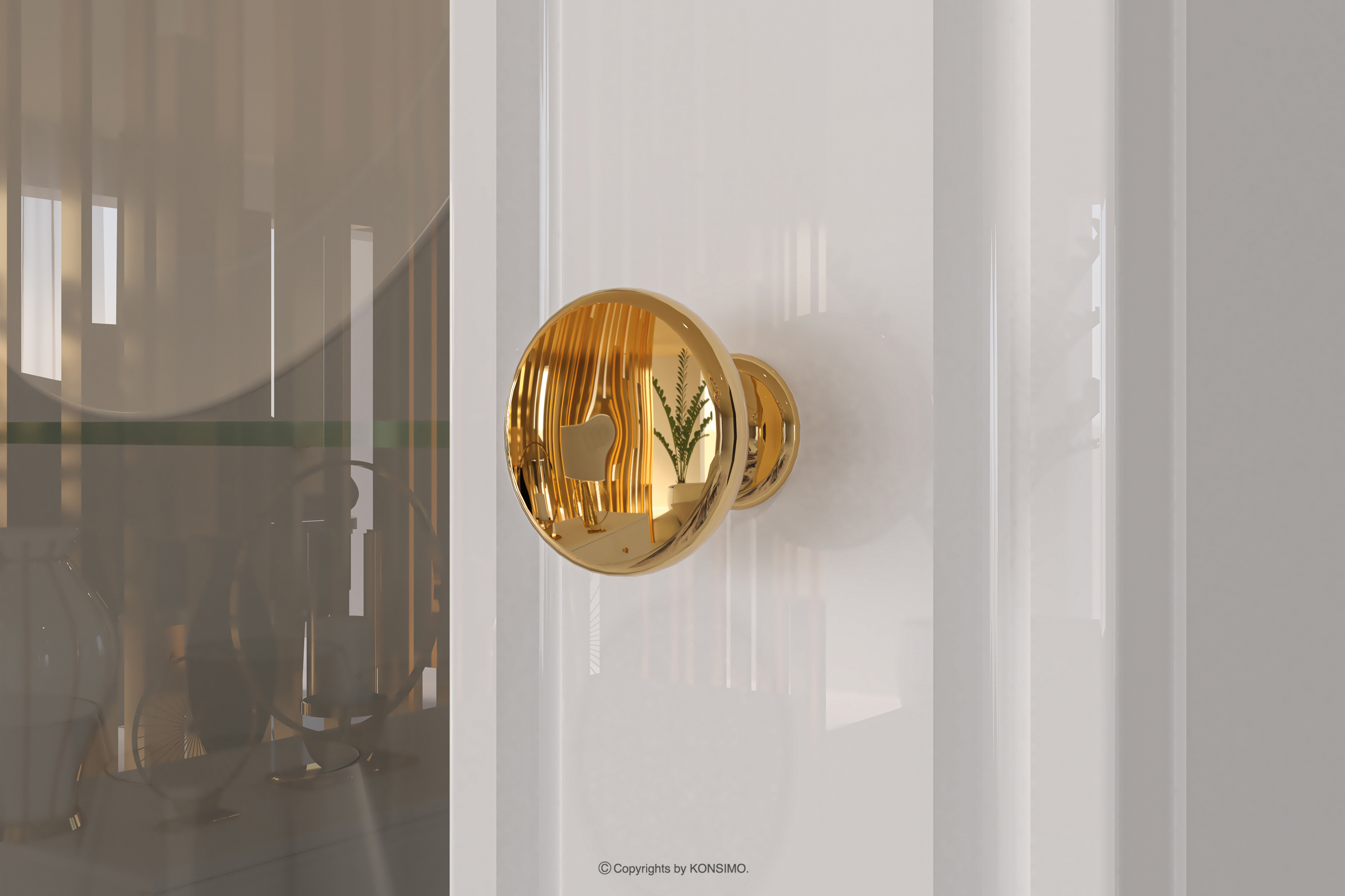 Elegancka witryna w połysku na wysokich nogach wprowadzi elementy elegancji do Twojego domu. Stworzona z myślą o tych, którzy cenią sobie nie tylko styl, ale także solidność, korpus z płyty laminowanej/MDF to pewny fundament dla każdego wnętrza. Wysoki połysk dodaje niepowtarzalnego blasku, a złote nóżki stożkowe i uchwyty są jak kropka nad "i".