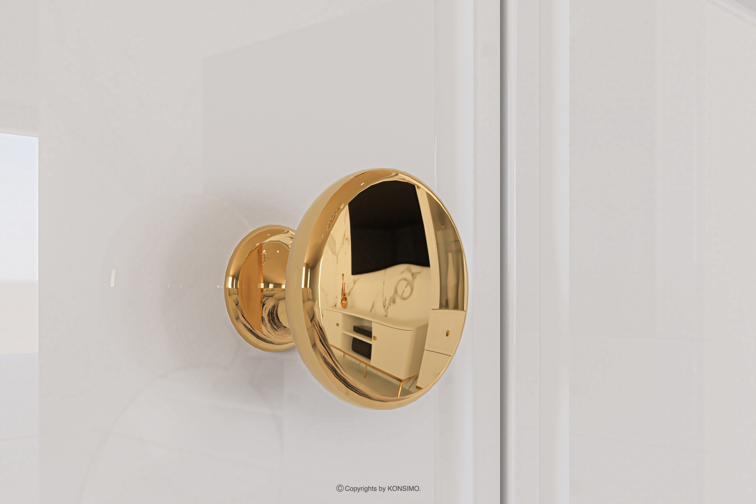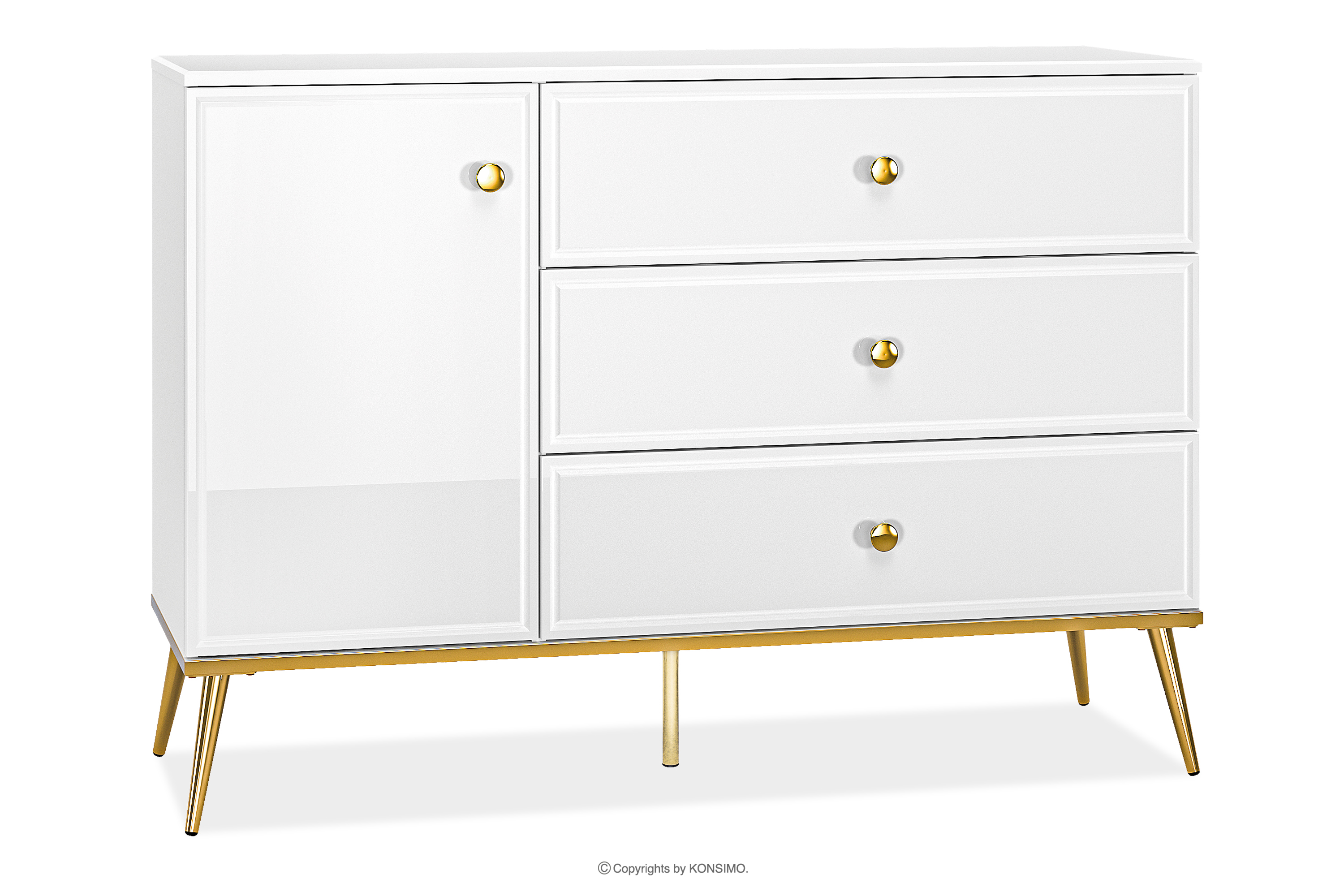 Front z płyty laminowanej/MDF to nie tylko kwestia wyglądu – to solidność, która gwarantuje niezmienny wygląd przez bardzo długi czas. Złote akcenty w postaci uchwytów i nóżek dodają meblowi uroku i delikatnie zdobią białą bryłę. Solidna konstrukcja i staranne wykończenie sprawiają, że nie tylko służy swojej funkcji, ale także staje się głównym bohaterem eleganckiej aranżacji przestrzeni. Prowadnice pełnego wysuwu w szufladach i zawiasy z cichym domykiem w drzwiach sprawiają, że użytkowanie jest bezproblemowe, a zwiększona ładowność dzięki wzmocnieniu dna gwarantuje, że komoda nie tylko zachwyca, ale także spełnia praktyczne oczekiwania.
