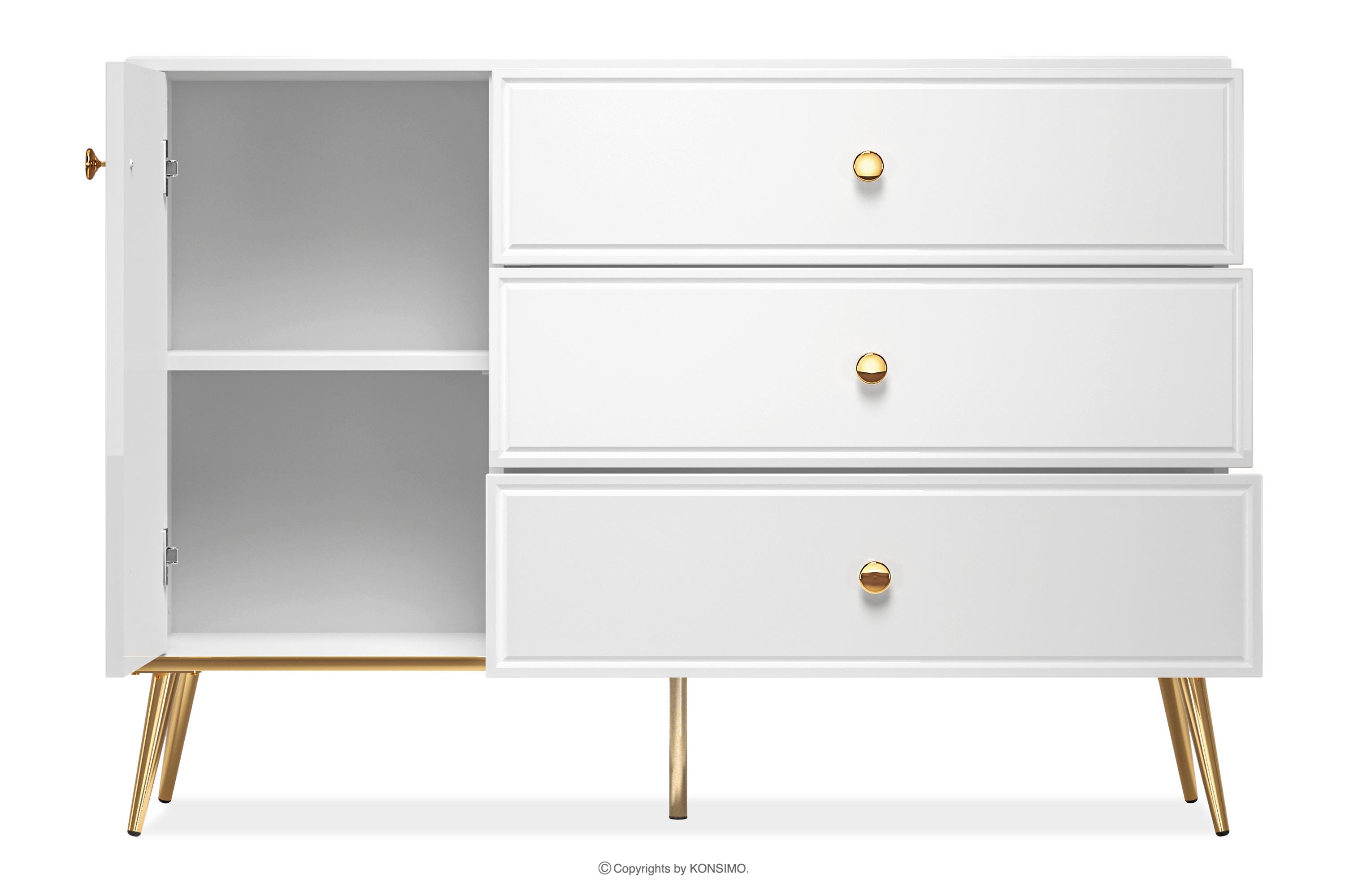 Elegancka komoda w połysku na wysokich nogach ISORIA - kolor biały połysk