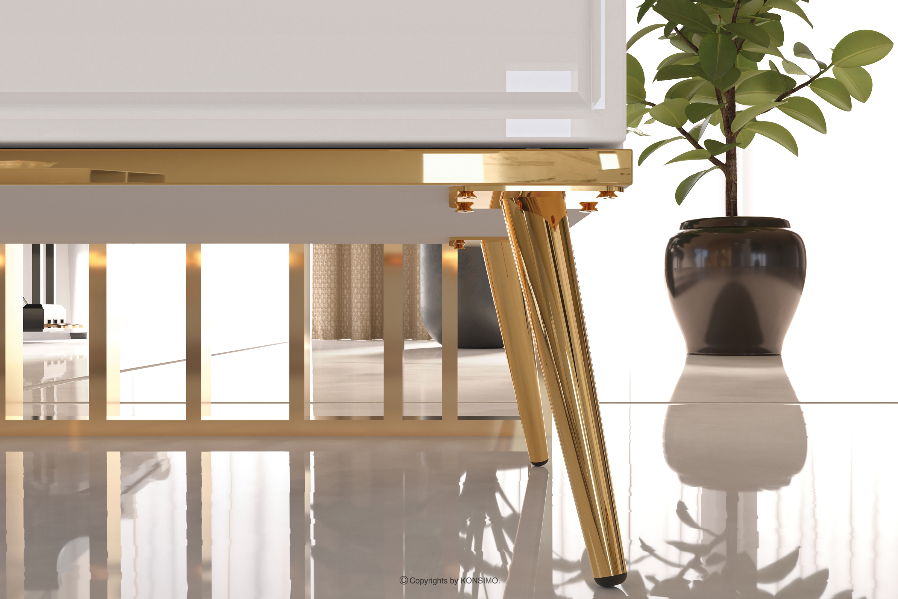 Elegancka komoda w połysku na wysokich nogach wprowadzi elementy elegancji do Twojego domu. Stworzona z myślą o tych, którzy cenią sobie nie tylko styl, ale także solidność, korpus z płyty laminowanej/MDF to pewny fundament dla każdego wnętrza. Wysoki połysk dodaje niepowtarzalnego blasku, a złote nóżki stożkowe i uchwyty są jak kropka nad "i".