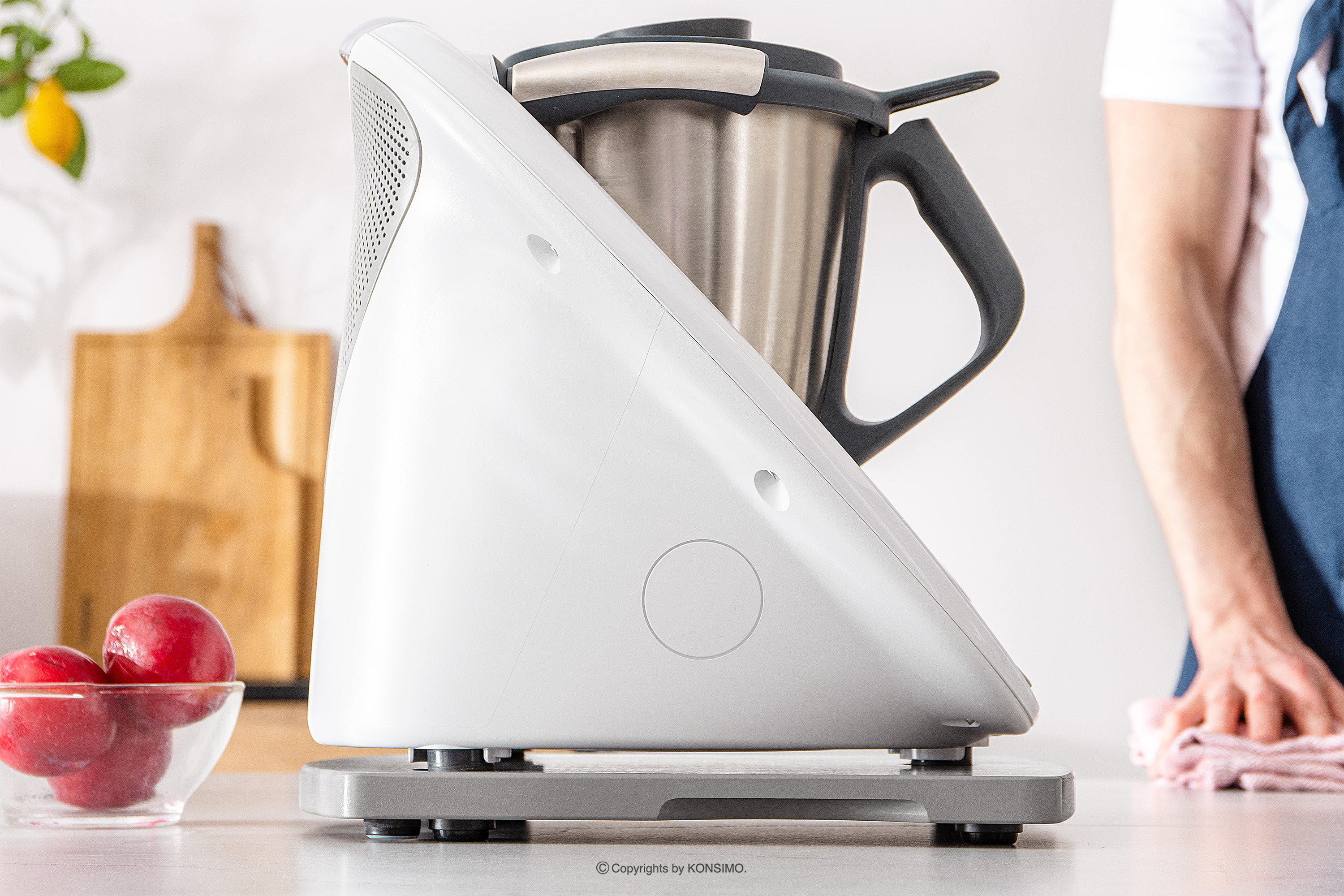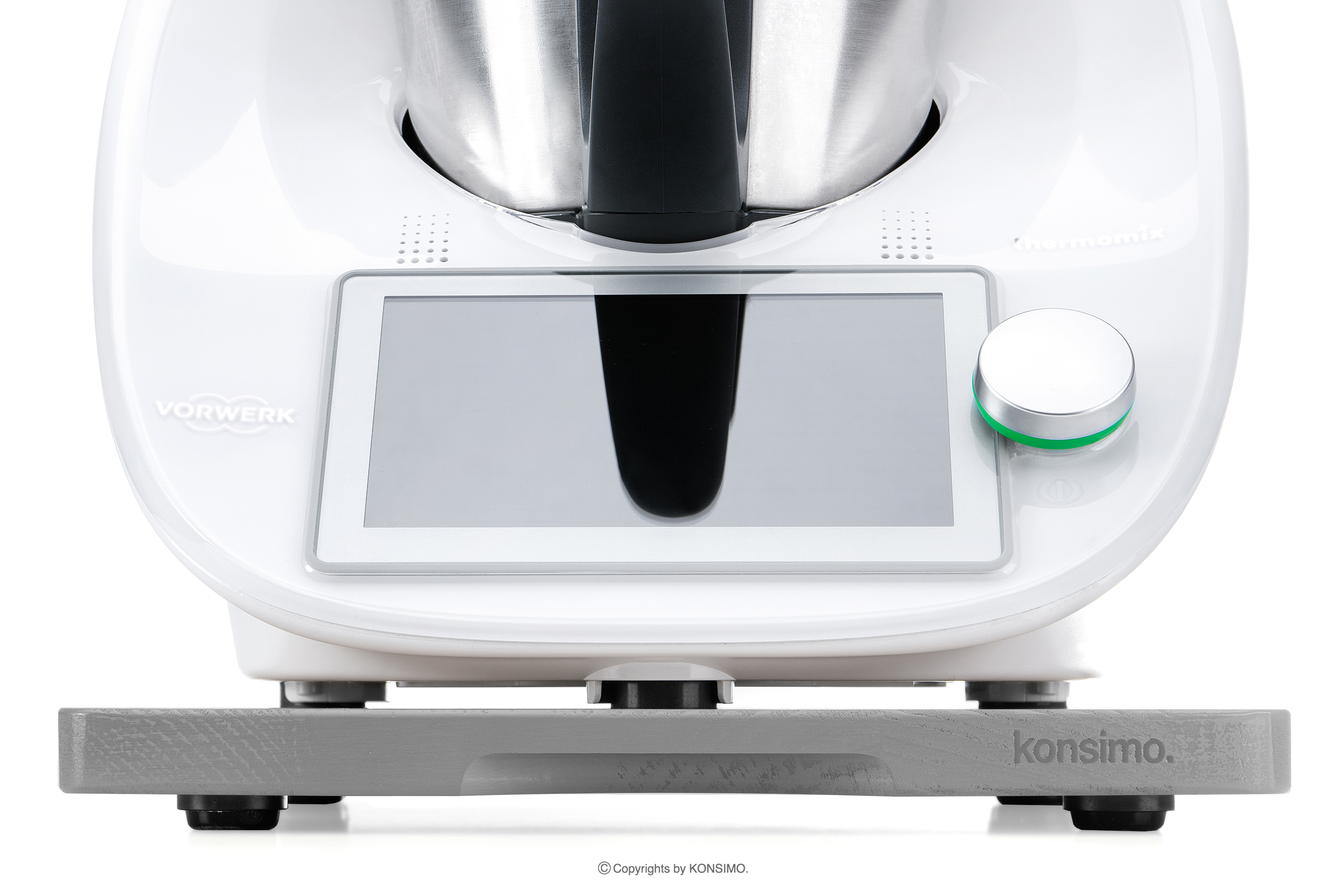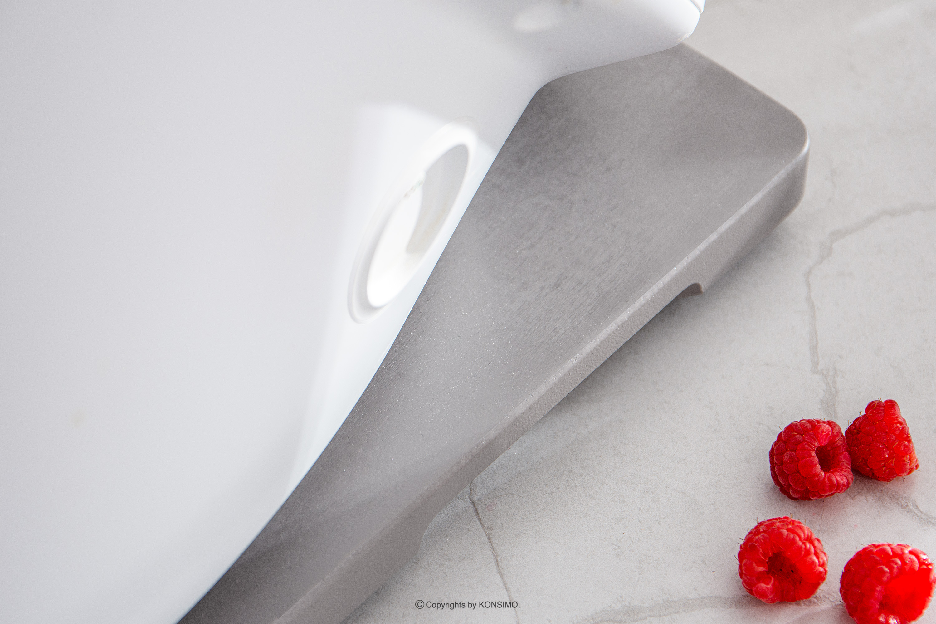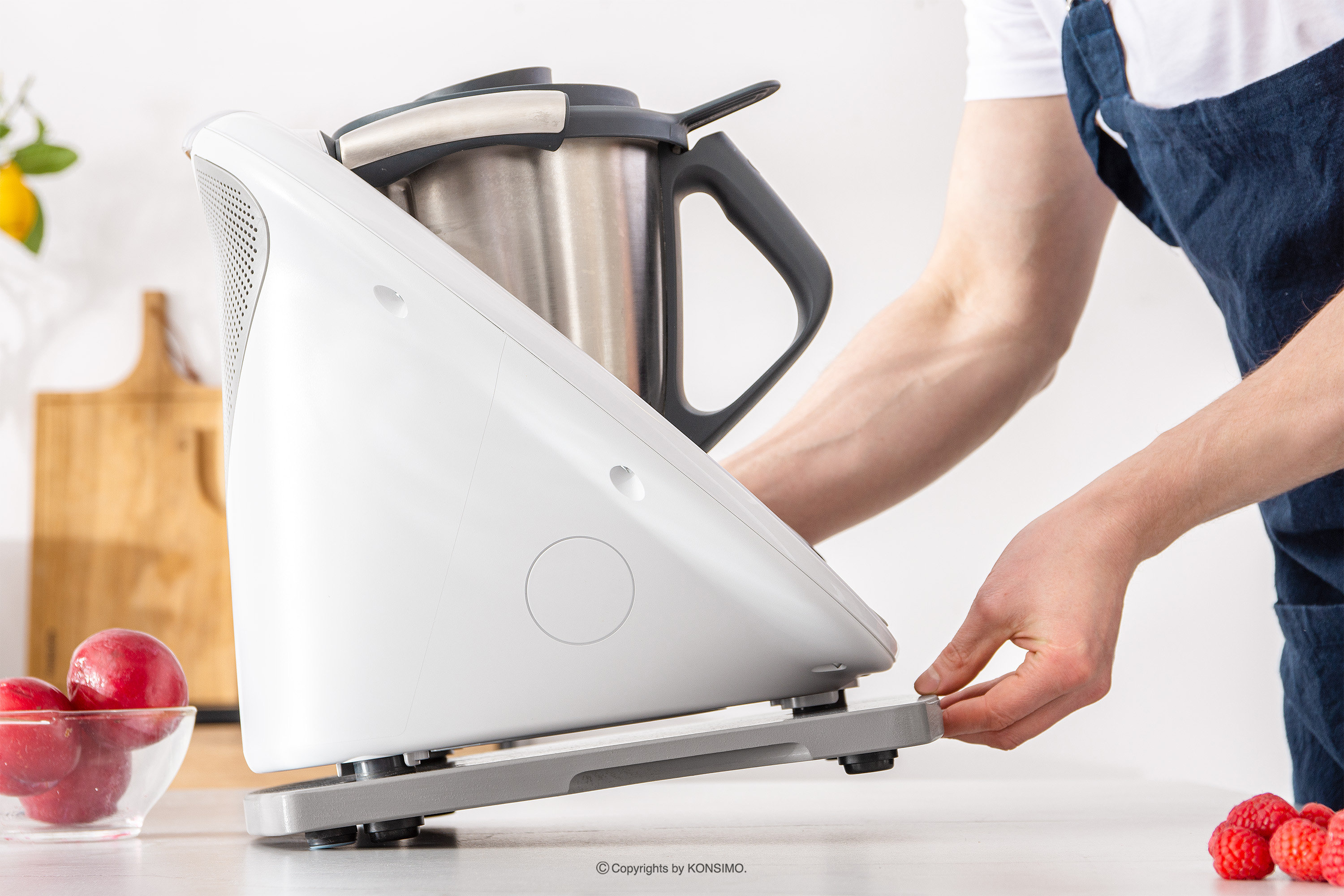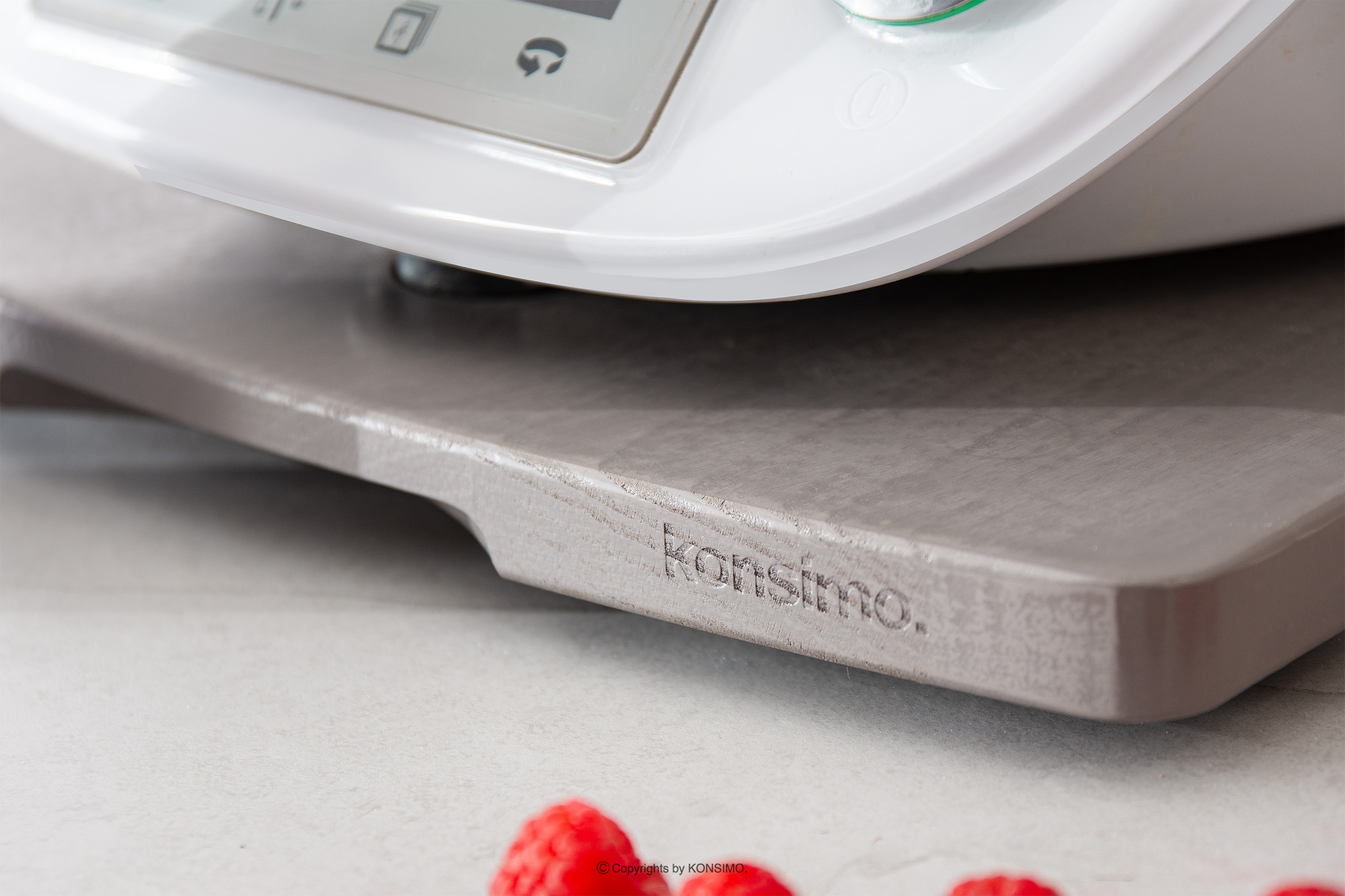 Podstawka pod Thermomix szara została zaprojektowana z myślą o stabilnym umieszczeniu urządzenia. Dzięki specjalnie wyprofilowanym wgłębieniom i gumowym nóżkom, deska skutecznie zapobiega uszkodzeniom czujnika wagi, który znajduje się w nóżkach urządzenia. To gwarantuje bezpieczne i niezakłócone korzystanie z Thermomixa. COQUERE ma ergonomiczny kształt oraz wyfrezowane uchwyty po bokach i z przodu, co umożliwia łatwe przenoszenie i przesuwanie.