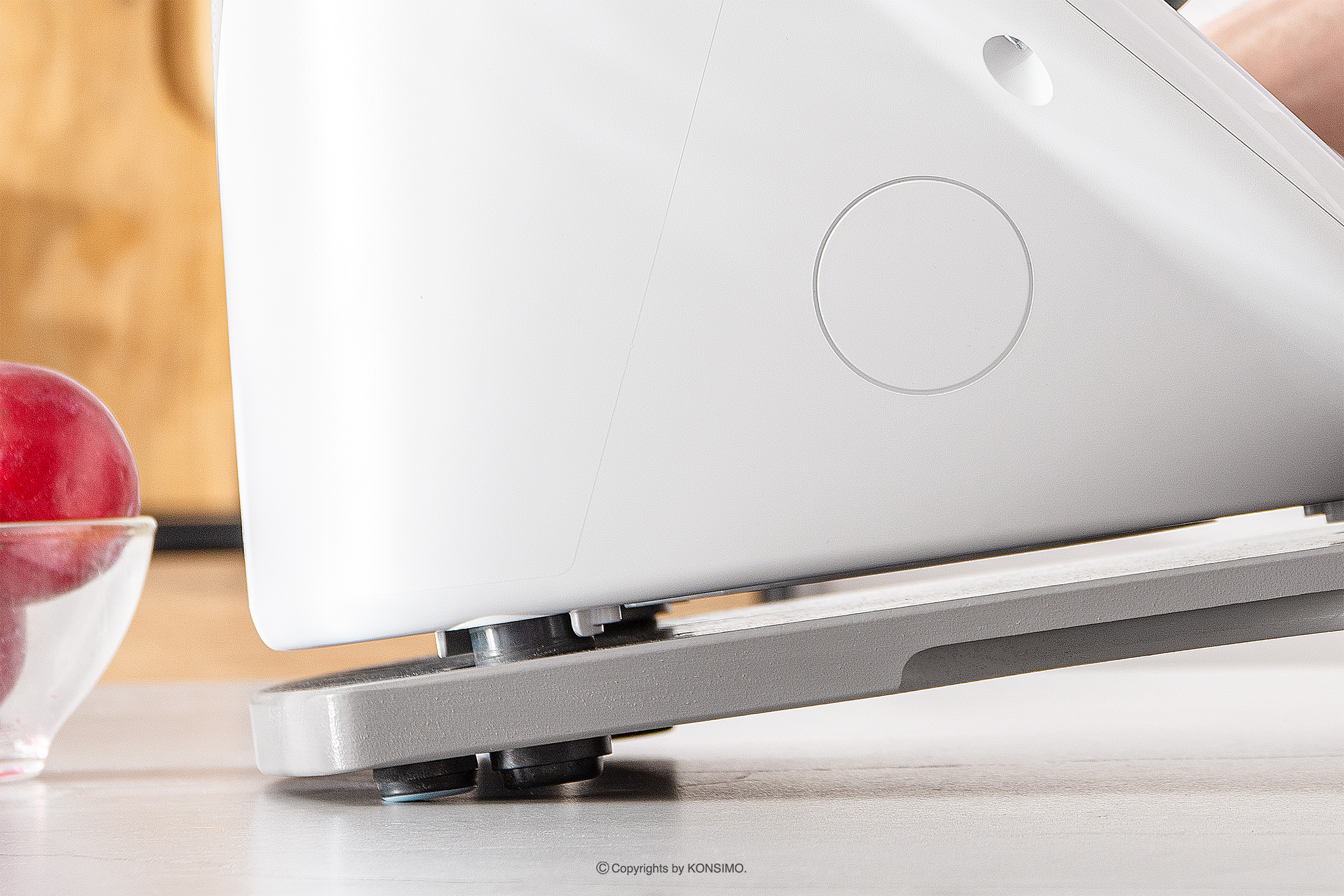 Podstawka deski posiada trzy idealnie dopasowane do rozstawu nóżek Thermomix TM5 i TM6, które zapewniają stabilne ułożenie urządzenia, eliminując jego przemieszczanie się podczas użytkowania. Dodatkowo, deska wyposażona jest w dwa teflonowe ślizgacze na spodzie, umożliwiające łatwe przesuwanie urządzenia we wszystkich kierunkach. Niezależnie od tego, czy potrzebujesz przesunąć Thermomix na bok czy obrócić go w inną stronę, nasza deska zapewni Ci swobodę i wygodę w manipulowaniu urządzeniem. Aby jeszcze bardziej zwiększyć stabilność i komfort pracy, deska jest wyposażona w cztery gumowe nóżki, które są antypoślizgowe i tłumią drgania podczas użytkowania. Dzięki nim, Thermomix będzie bezpiecznie trzymał się na miejscu, nie przemieszczając się nawet podczas intensywnych operacji kulinarnych.