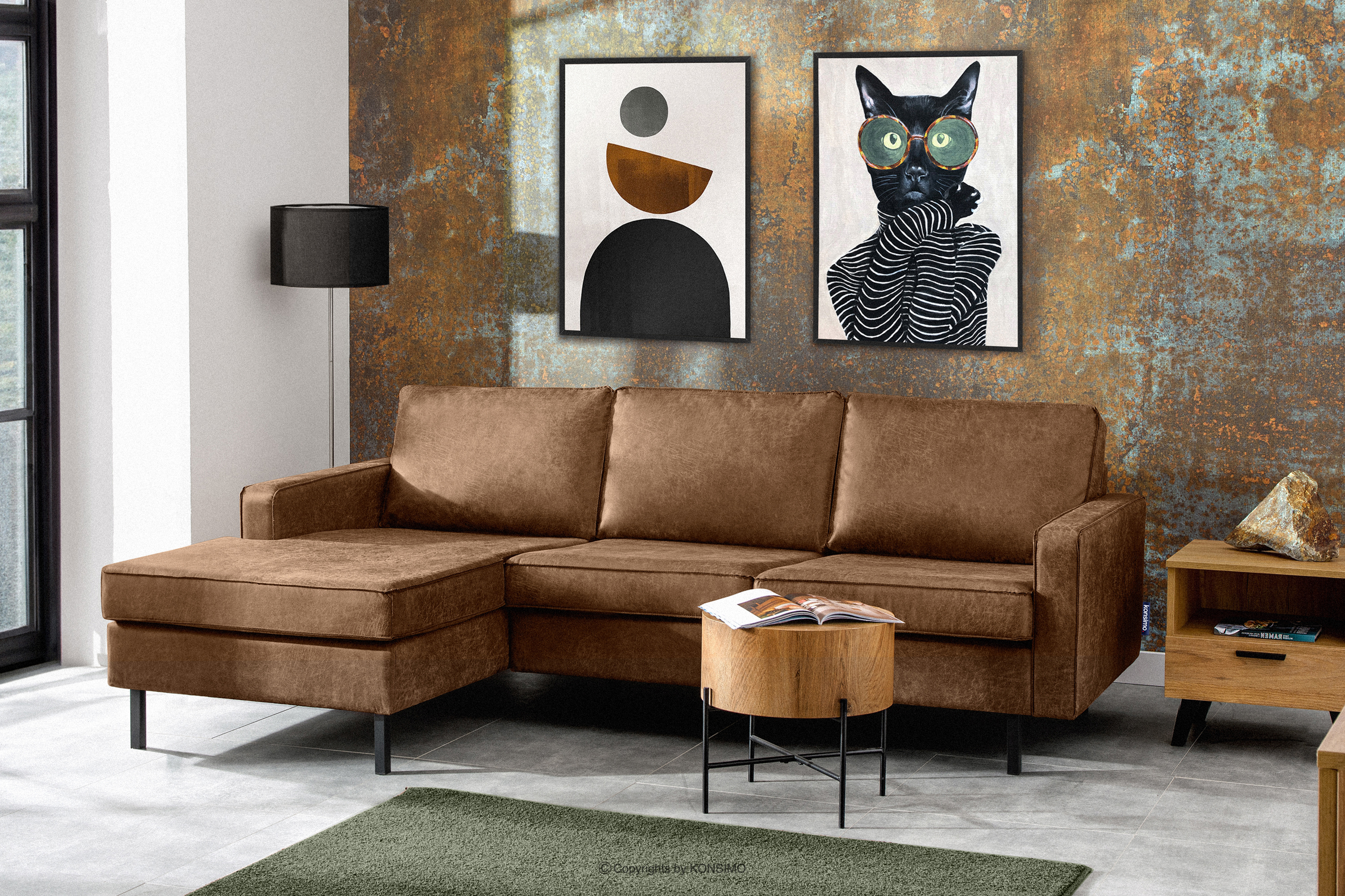 Narożnik w stylu loft lewy z otomaną brązowy to idealne rozwiązanie zarówno do dużych, jak i małych pomieszczeń. Wyjątkowy design oraz wysoka jakość wykonania sprawiają, że jest to mebel, który nie tylko zachwyca estetycznie, ale także zapewnia wygodę i komfort. Narożnik posiada również metalowe nóżki w kolorze czarnym, które idealnie komponują się ze stylem loft i vintage.