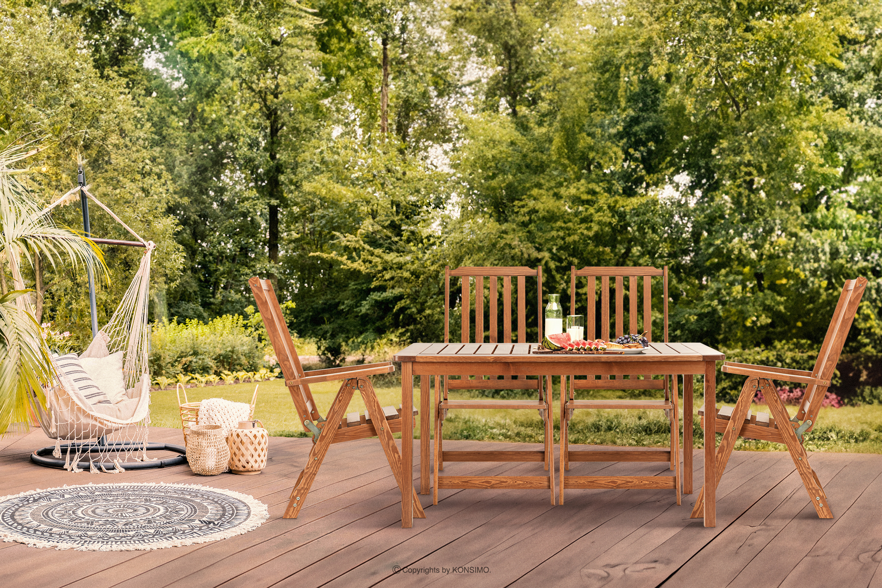 Stół na ogród z drewna sosnowego pomoże stworzyć idealne miejsce na rodzinne spotkania, przyjęcia z przyjaciółmi i codzienne letnie obiady pod gołym niebem. Stelaż mebli wykonany jest z wysokiej jakości drewna sosnowego, które zostało starannie impregnowane w kolorze, nadając mu nie tylko trwałość i odporność na czynniki atmosferyczne, ale także wyjątkowy, ciepły odcień.