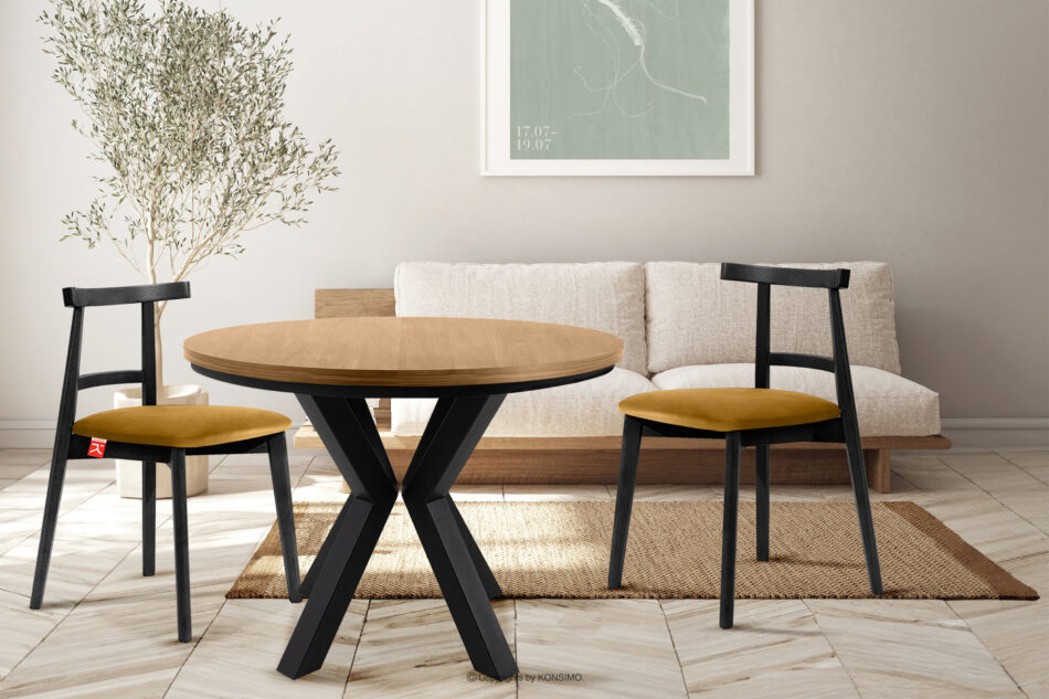 Okrągły stół rozkładany 100-180 dąb złoty zachwyci swoim minimalistycznym designem, ale także zapewni funkcjonalność na najwyższym poziomie. Nogi stołu, wykonane z solidnego czarnego metalu malowanego proszkowo, nie tylko nadają mu industrialnego charakteru, ale także zapewniają trwałość i stabilność. Blat stołu wykonany z najwyższej jakości płyty laminowanej podkreśla estetykę, a także gwarantuje łatwość utrzymania w czystości.