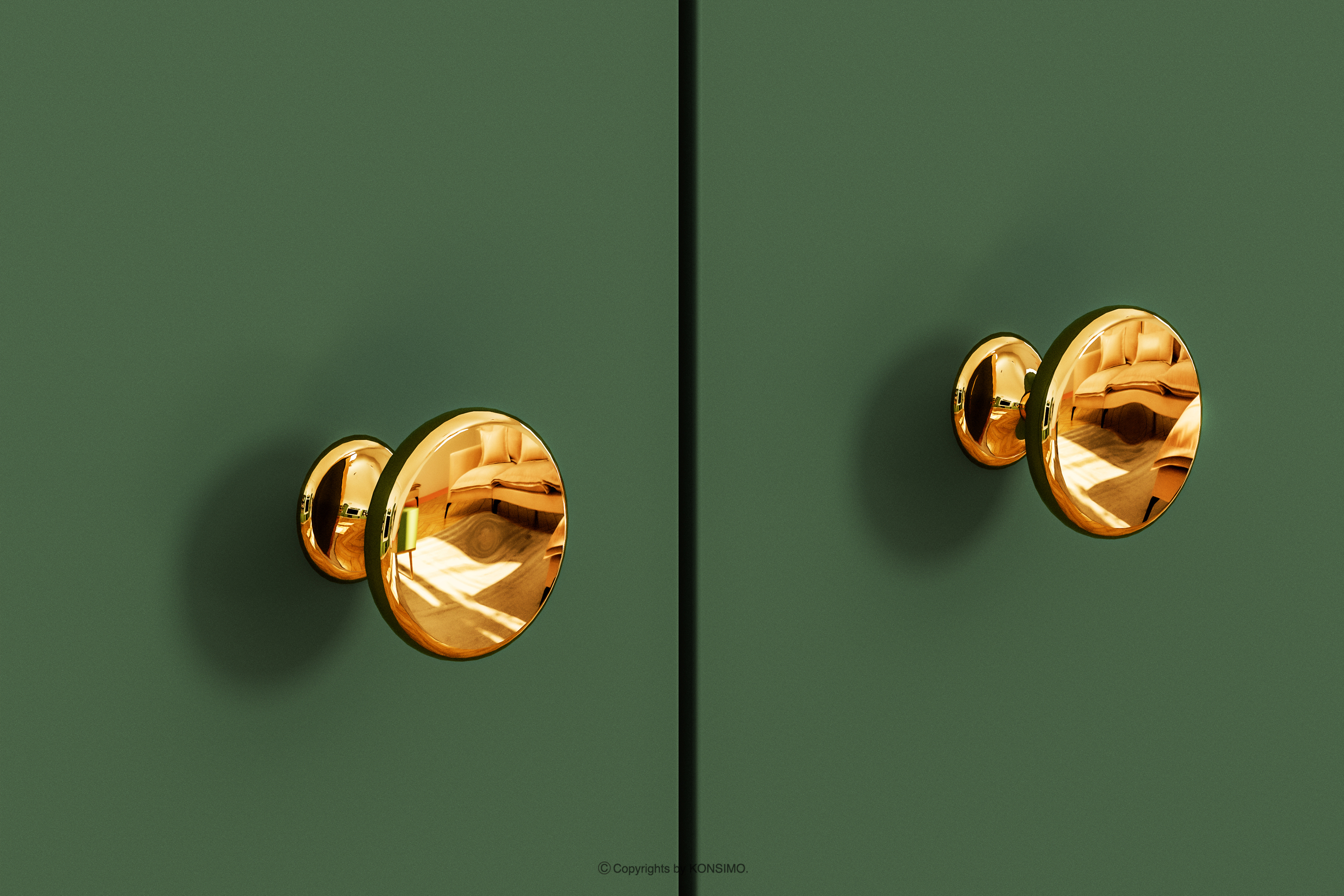 Front z płyty laminowanej nie tylko przyciąga wzrok swoim wyglądem, ale także gwarantuje niezmienny wygląd na przestrzeni wielu lat. Złote akcenty w postaci uchwytów i nóżek dodają nie tylko uroku, ale także delikatnie zdobią zieloną bryłę. Solidna konstrukcja oraz staranne wykończenie sprawiają, że nie tylko spełnia swoją funkcję, ale staje się głównym bohaterem eleganckiej aranżacji przestrzeni. Zawiasy z cichym domykiem w drzwiach sprawiają, że użytkowanie jest bezproblemowe i ciche.