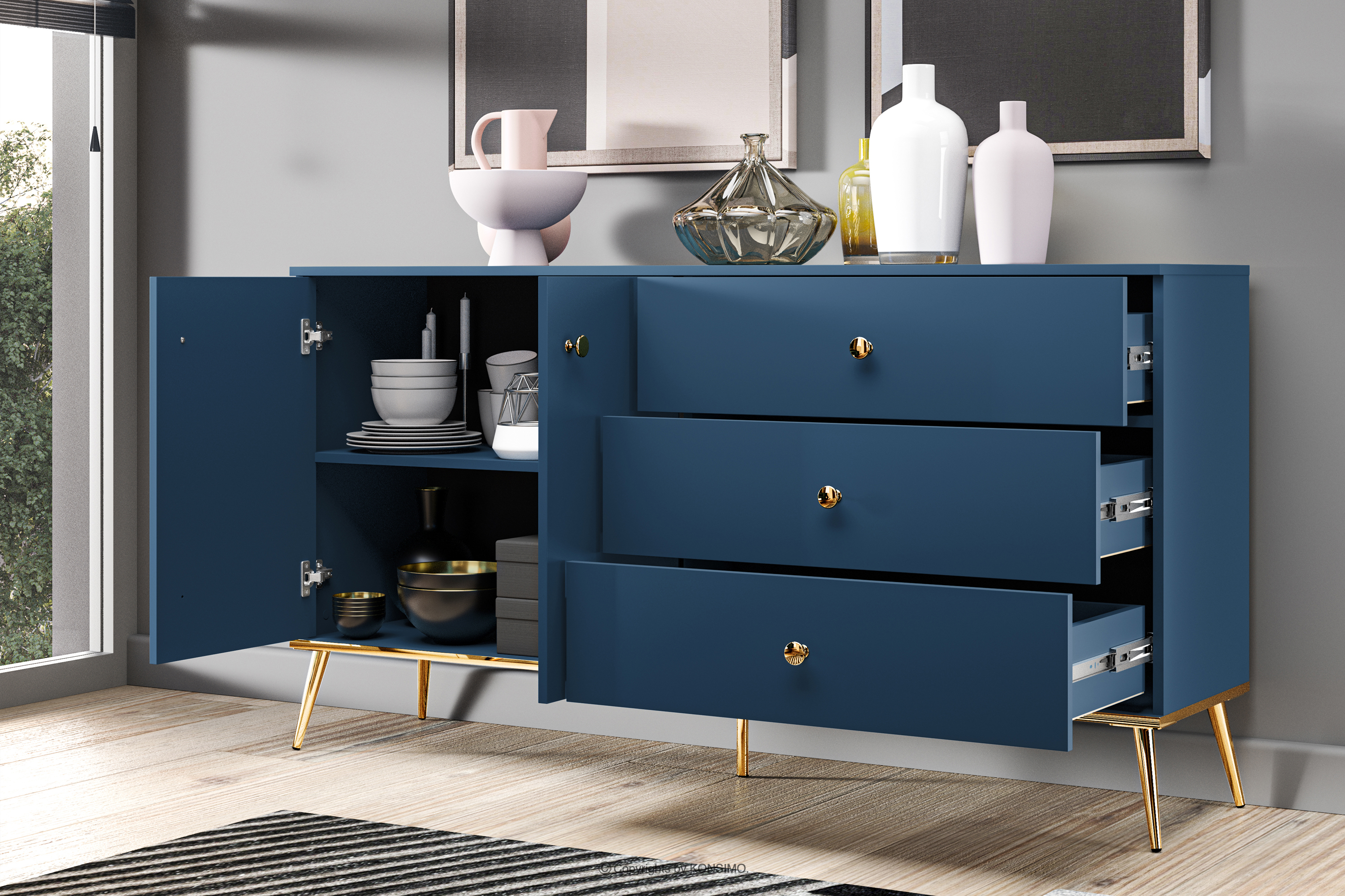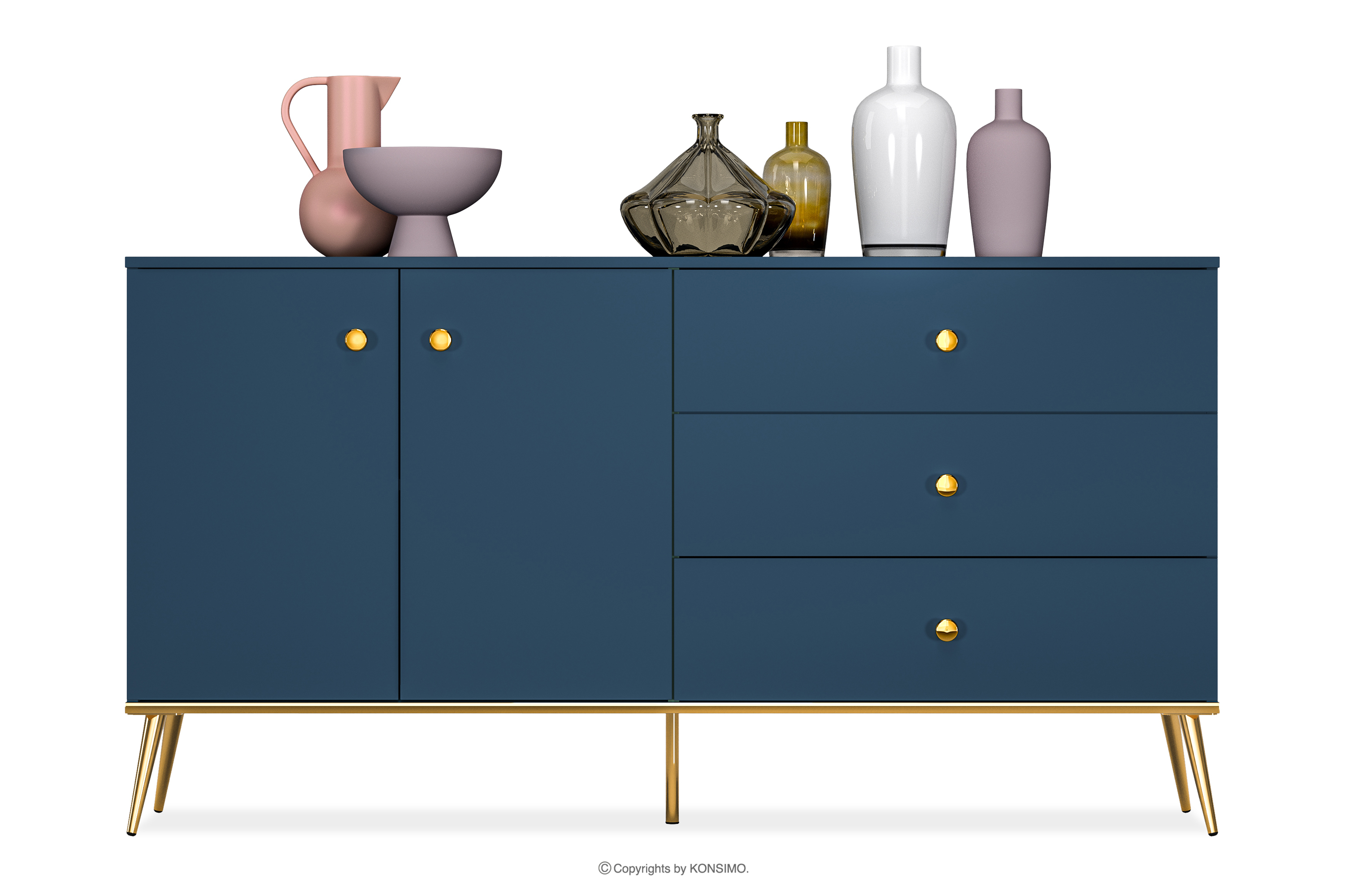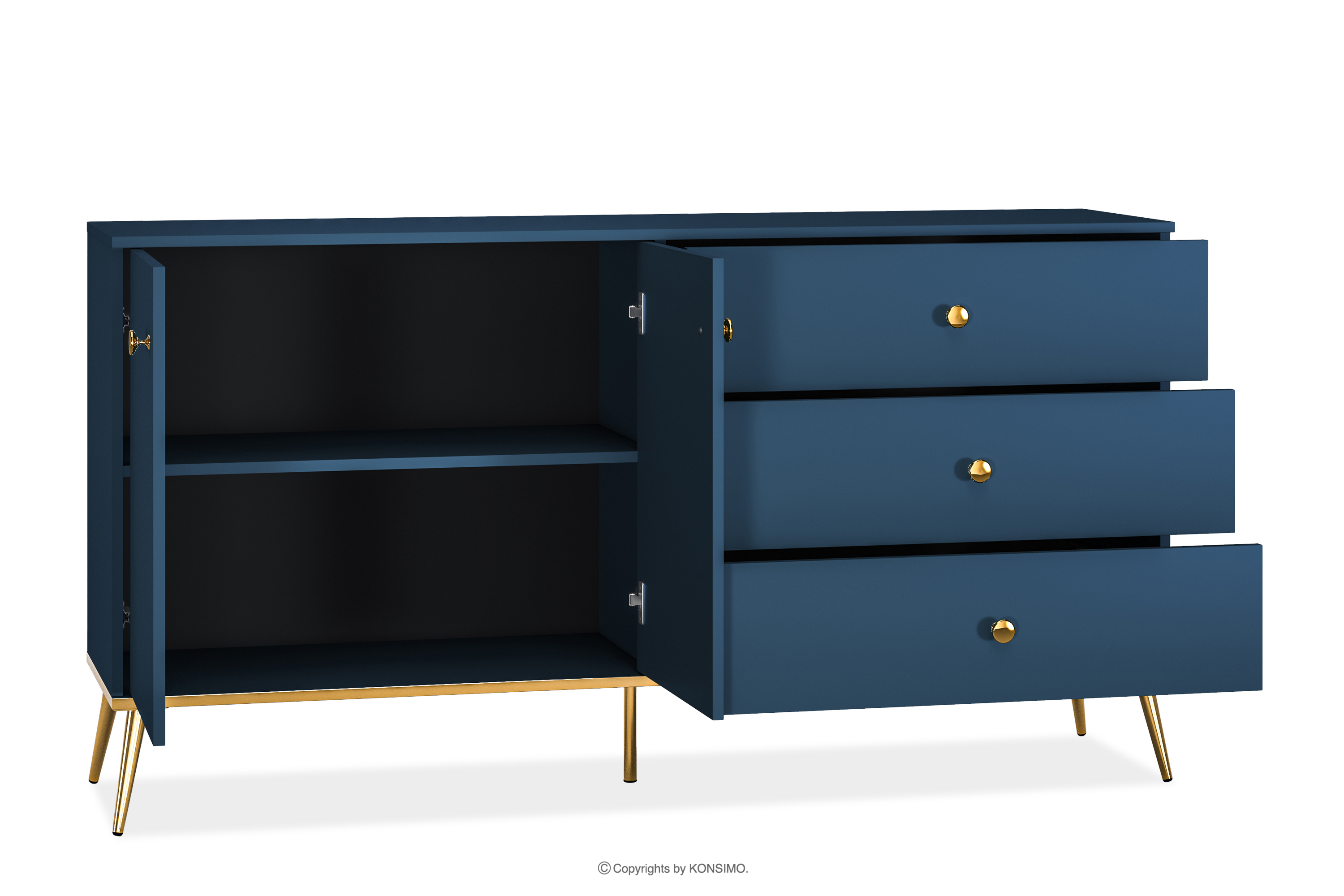 ARICIA zobacz całą kolekcję Szeroka granatowa komoda na wysokich złotych nogach- kolor granatowy
