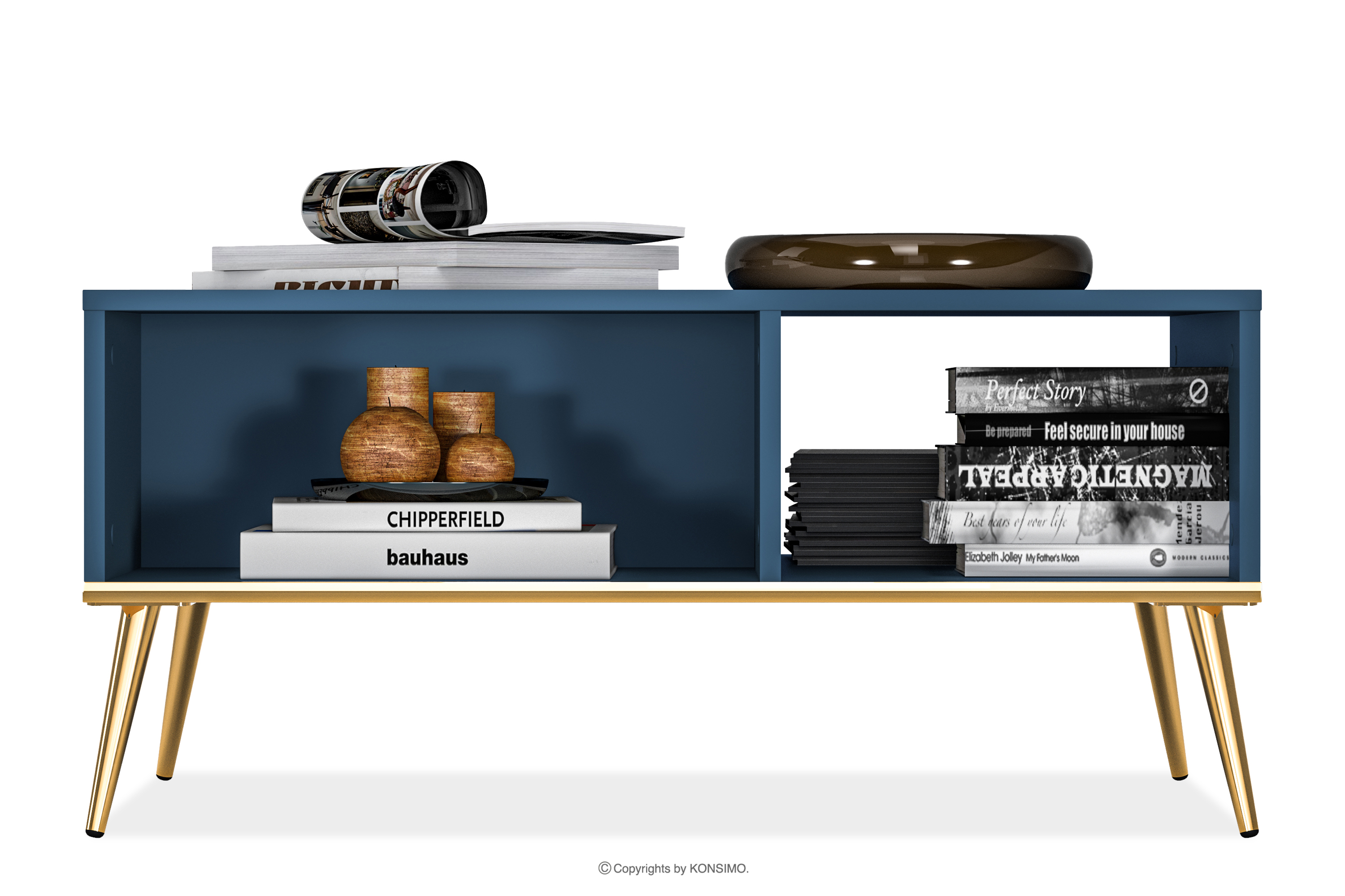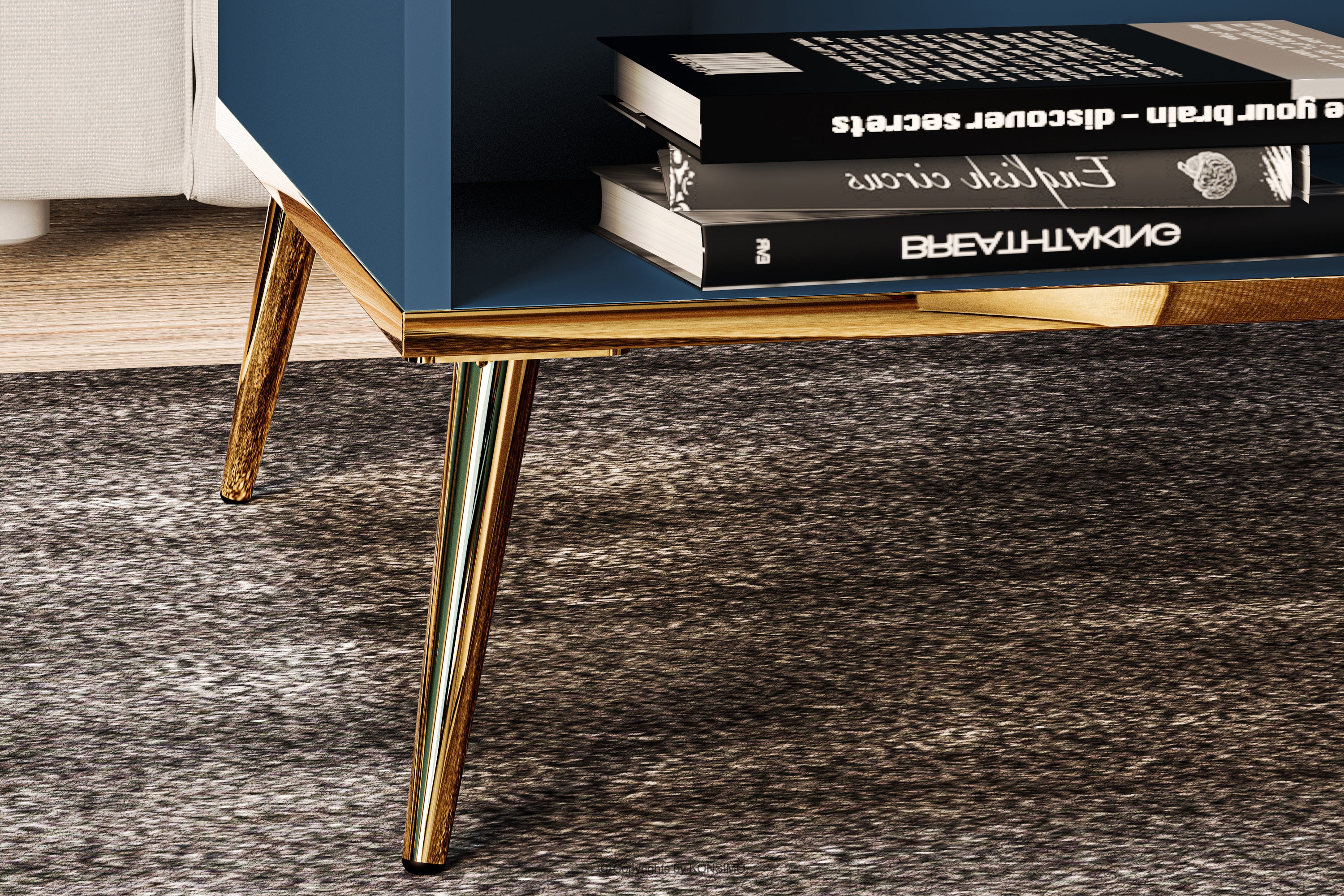 ARICIA zobacz całą kolekcję Granatowy stolik kawowy na wysokich złotych nogach- kolor granatowy