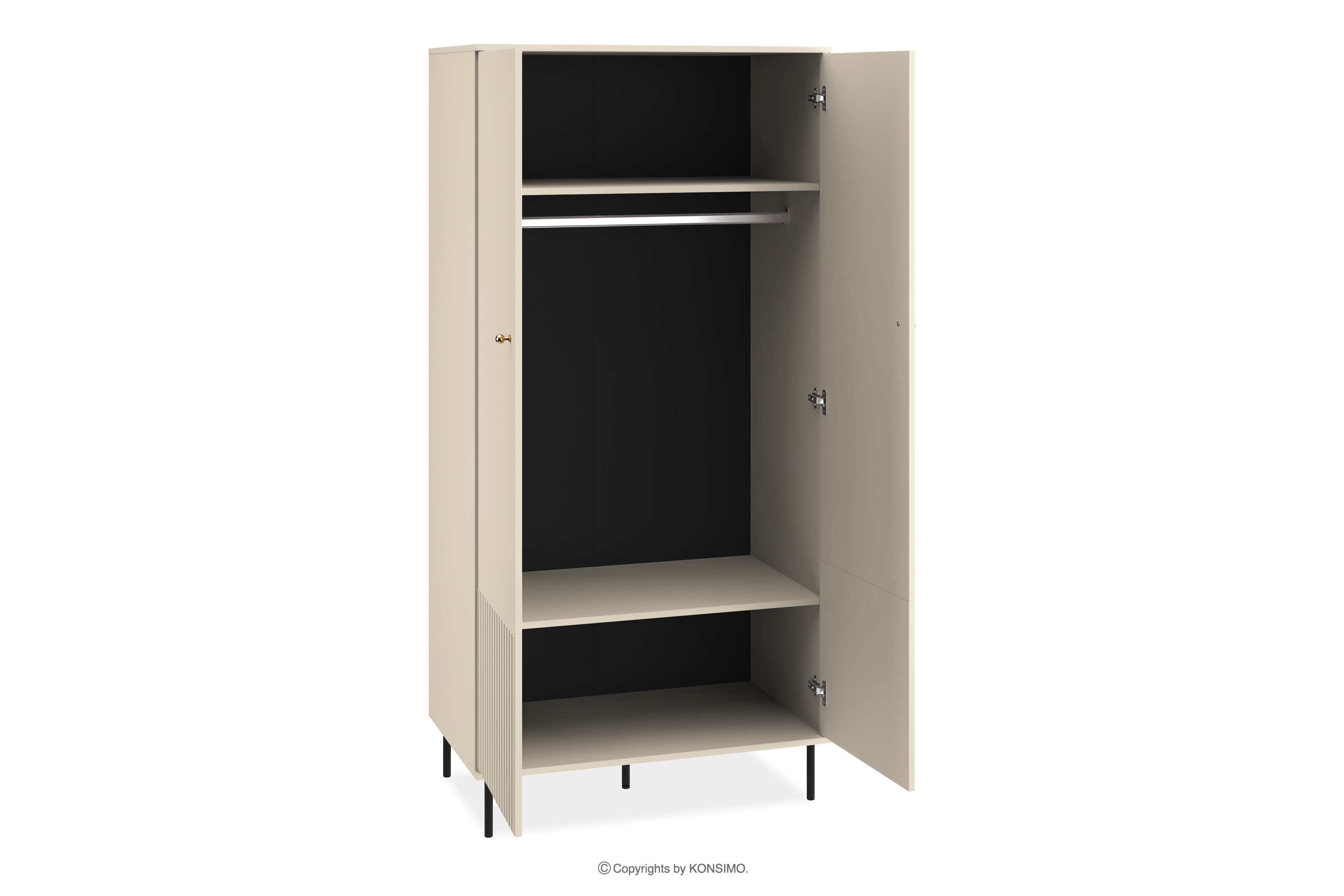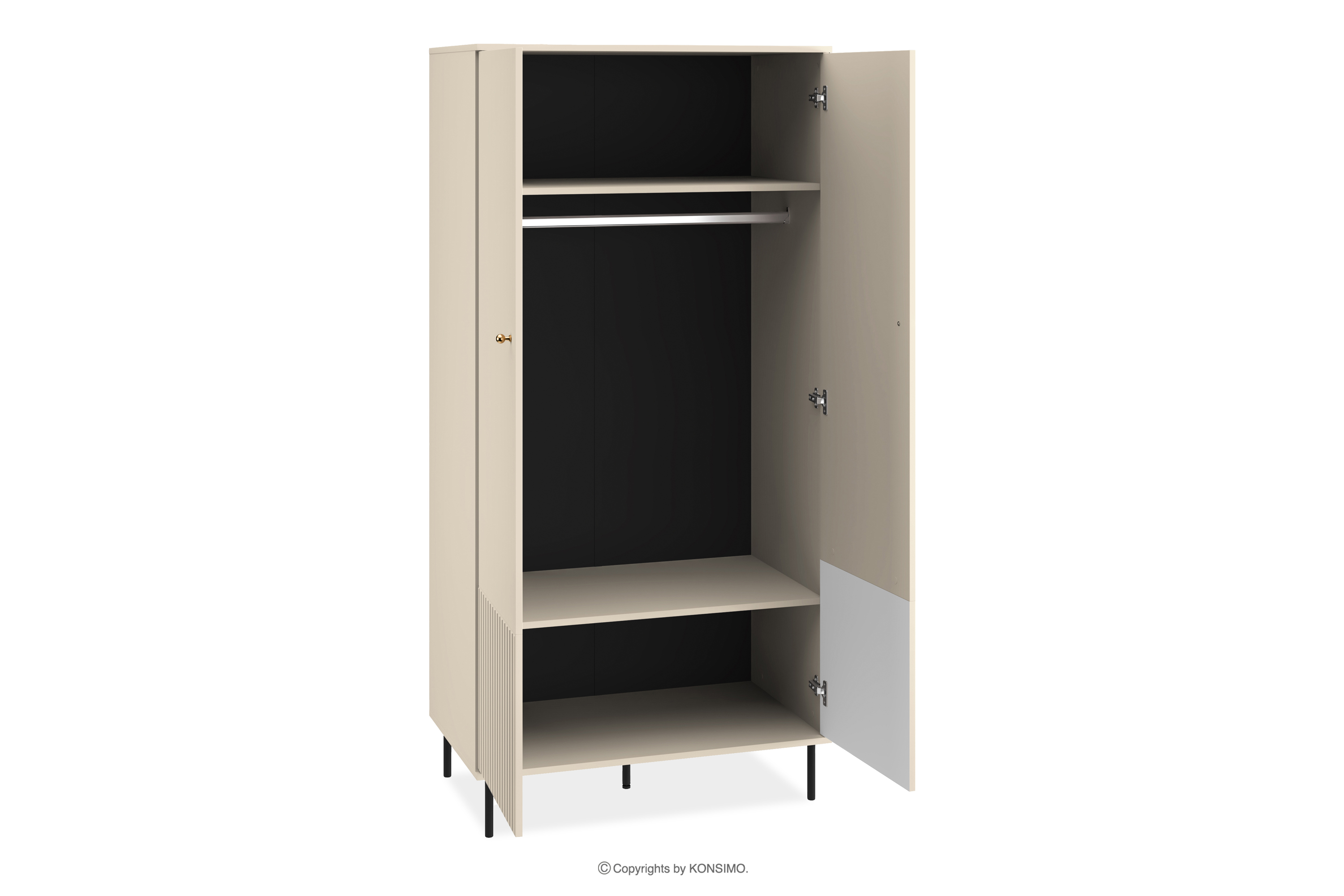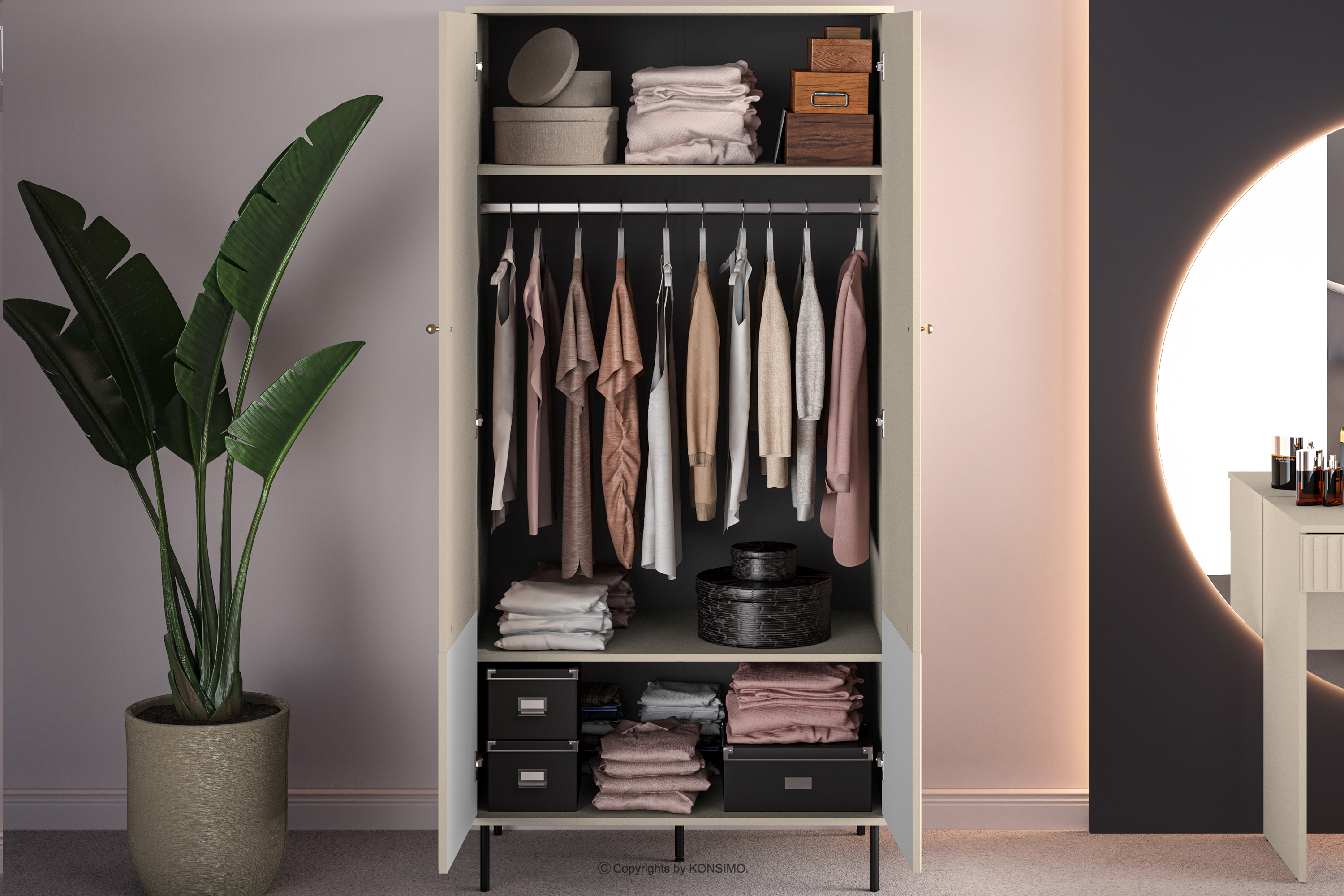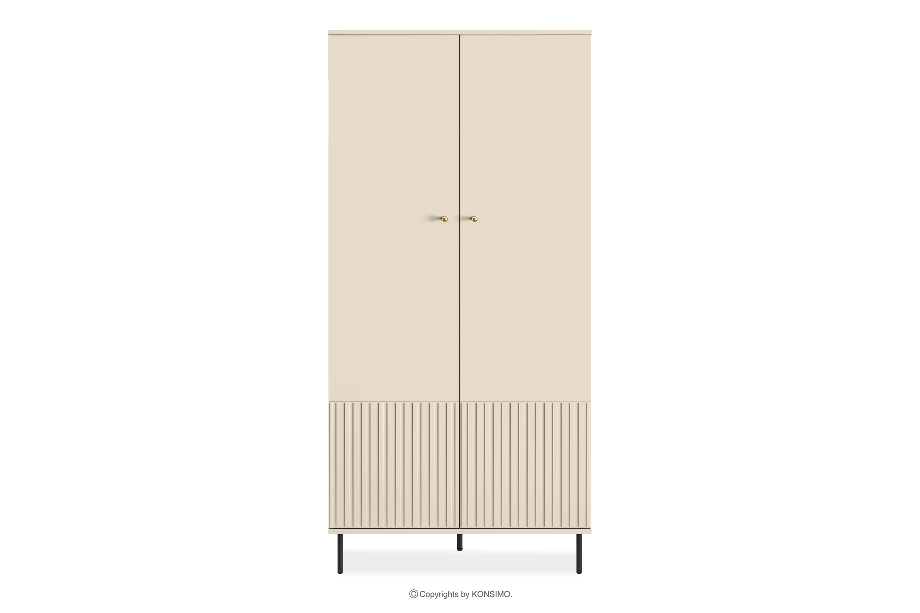 Elegancka szafa w kolorze kremowym wprowadzi do Twojego wnętrza subtelny akcent elegancji. Zaprojektowana z myślą o miłośnikach stylu eleganckiego i funkcjonalności, korpus z płyty laminowanej/MDF stanowi solidny fundament dla mebli. Czarne metalowe nóżki i złote uchwyty nadają meblowi subtelnej elegancji. Ale to jeszcze nie wszystko! Obrzeża ABS to nie tylko elegancki detal, ale także gwarancja odporności na uszkodzenia i wilgoć, sprawiając, że mebel nie tylko prezentuje się efektownie, ale również jest łatwy do utrzymania w czystości.