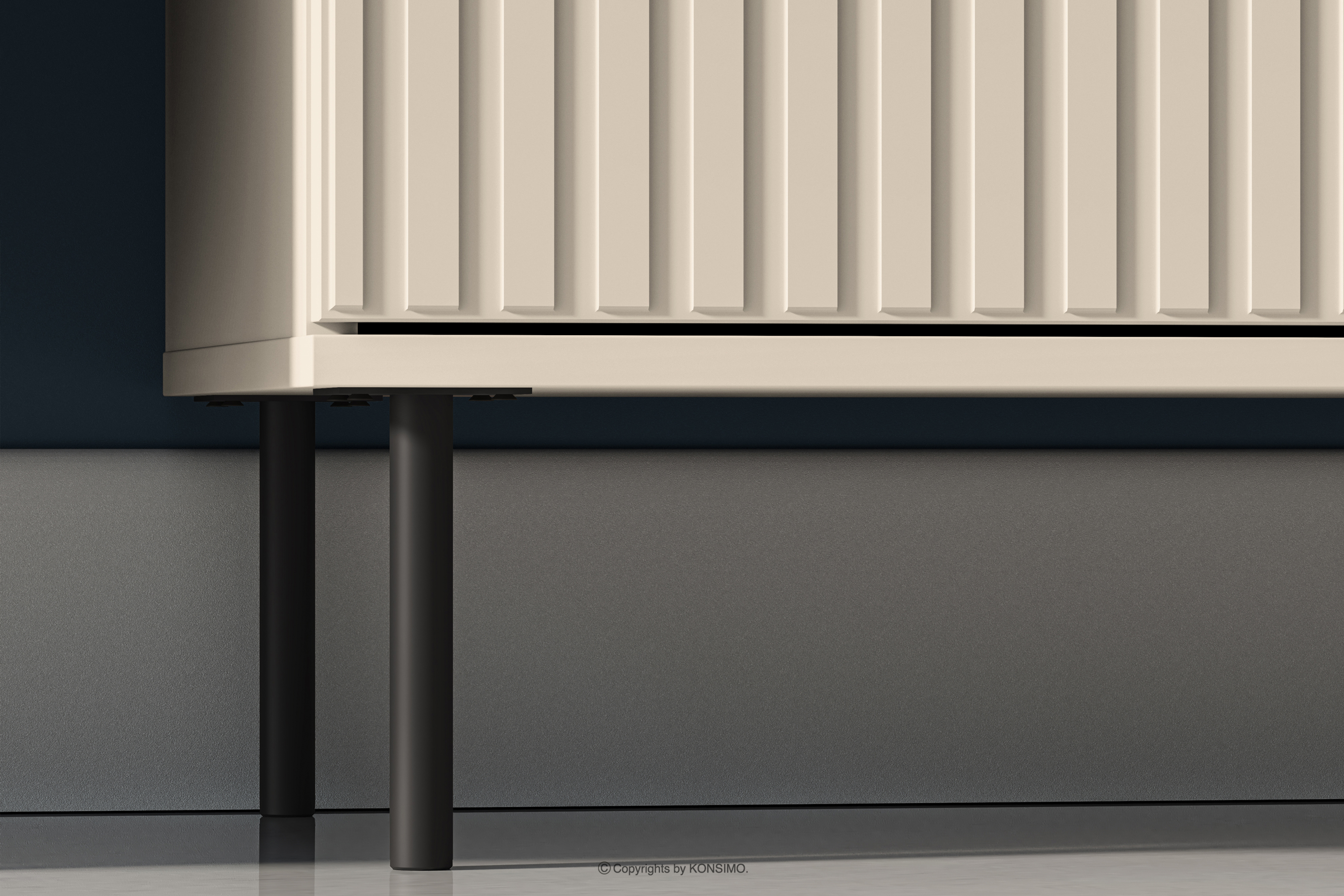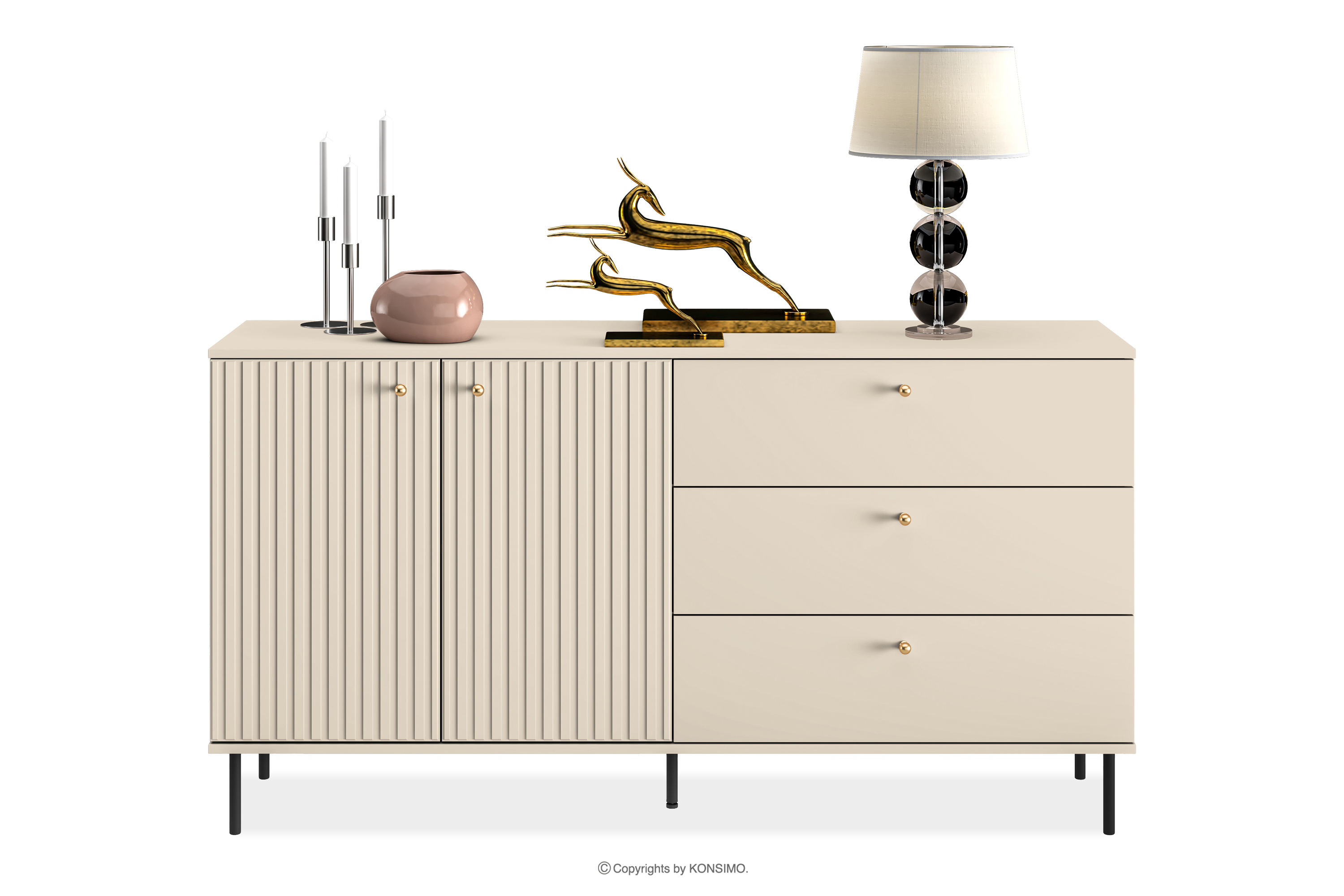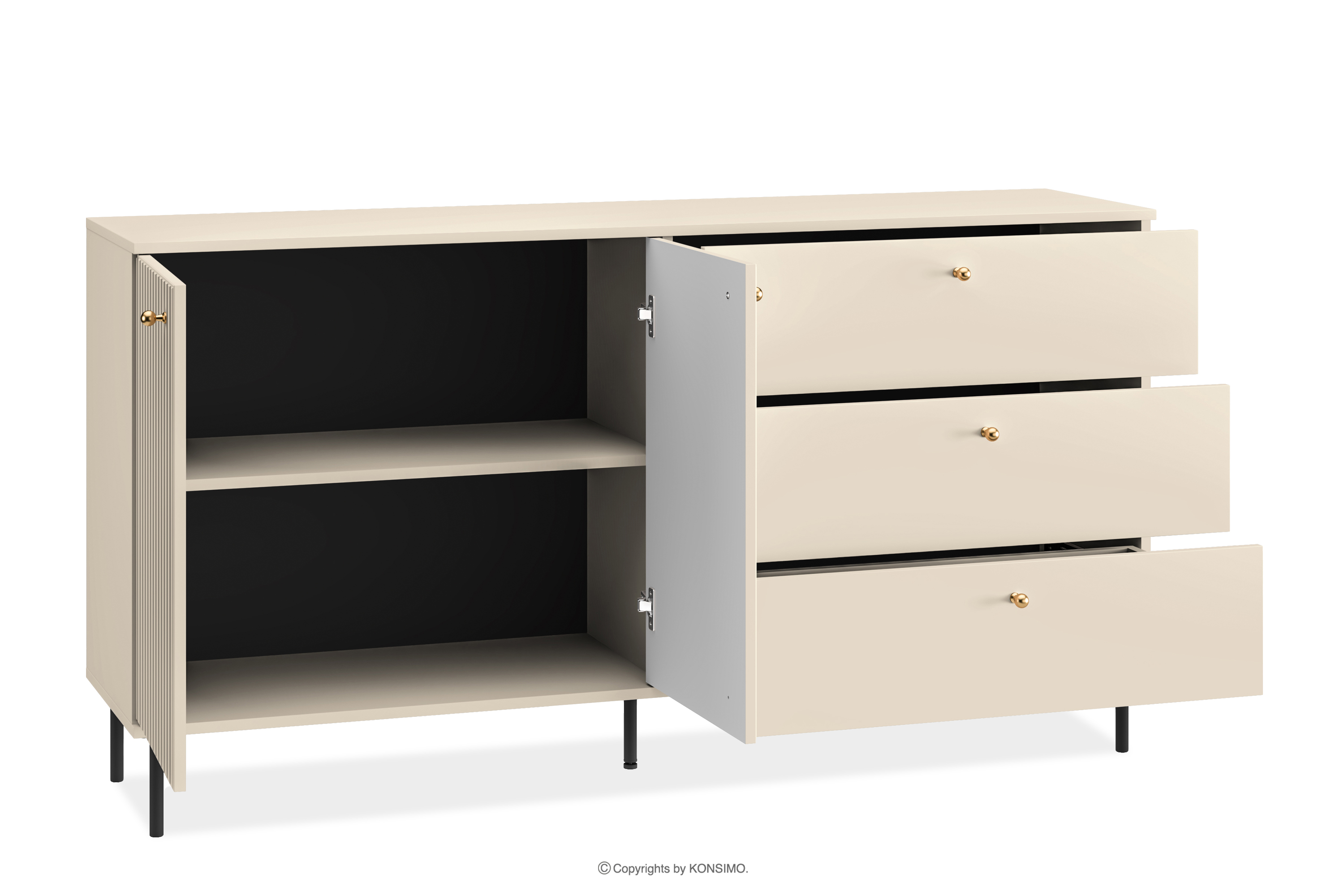 Front z płyty laminowanej/MDF nie tylko przyciąga wzrok swoim wyglądem, ale także gwarantuje niezmienny wygląd na przestrzeni wielu lat. Czarne metalowe nóżki i złote uchwyty dodają meblowi nie tylko uroku, ale także delikatnie zdobią bryłę. Solidna konstrukcja oraz staranne wykończenie sprawiają, że nie tylko spełnia swoją funkcję, ale staje się głównym bohaterem eleganckiej aranżacji w domu. Prowadnice pełnego wysuwu w szufladzie sprawiają, że użytkowanie jest bezproblemowe, a zwiększona ładowność dzięki wzmocnieniu dna gwarantuje, że spełnia praktyczne oczekiwania.