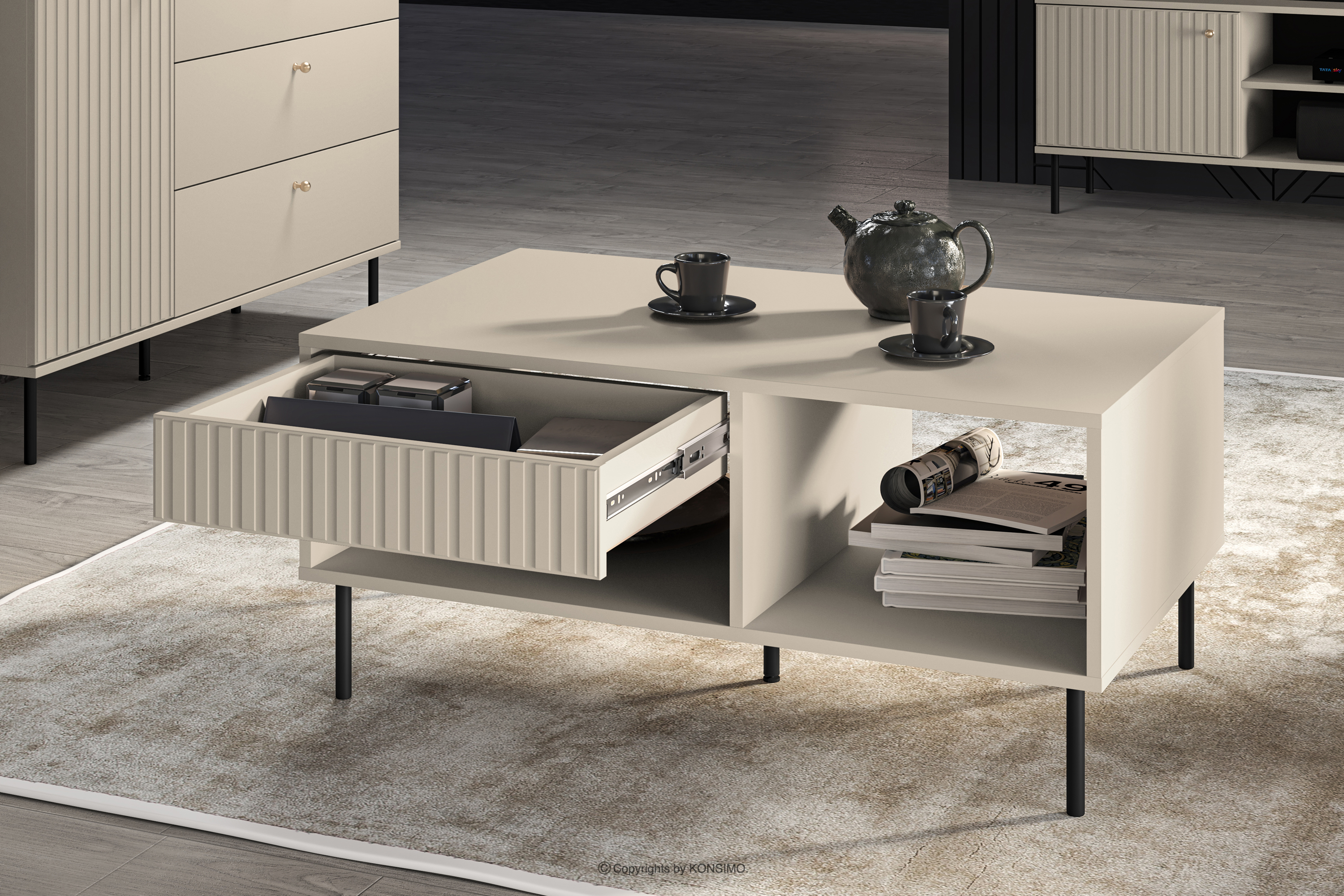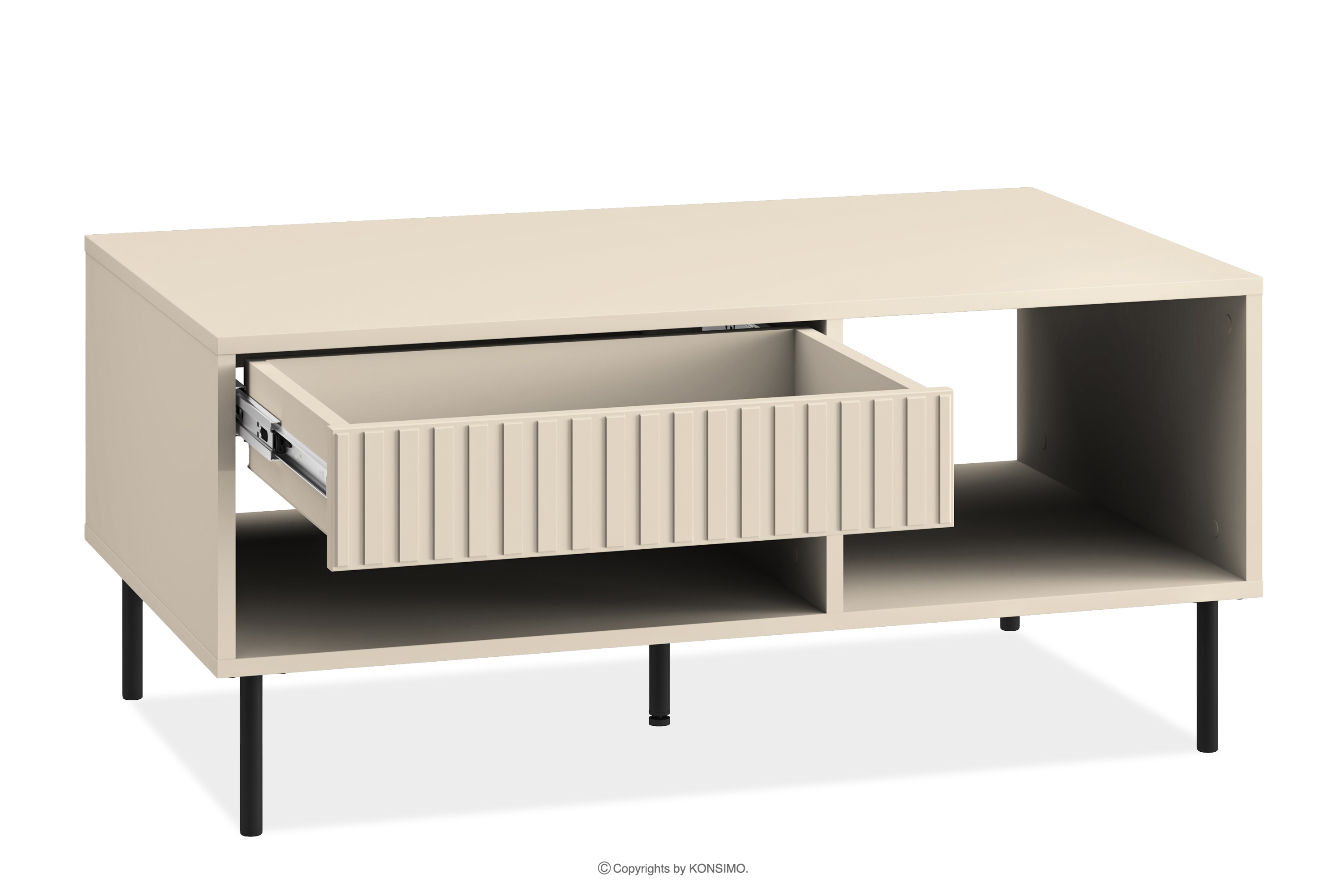 Elegancki stolik kawowy w kolorze kremowym wprowadzi do Twojego wnętrza subtelny akcent elegancji. Zaprojektowana z myślą o miłośnikach stylu eleganckiego i funkcjonalności, korpus z płyty laminowanej/MDF stanowi solidny fundament dla mebli. Czarne metalowe nóżki i złote uchwyty nadają meblowi subtelnej elegancji. Ale to jeszcze nie wszystko! Obrzeża ABS to nie tylko elegancki detal, ale także gwarancja odporności na uszkodzenia i wilgoć, sprawiając, że mebel nie tylko prezentuje się efektownie, ale również jest łatwy do utrzymania w czystości.