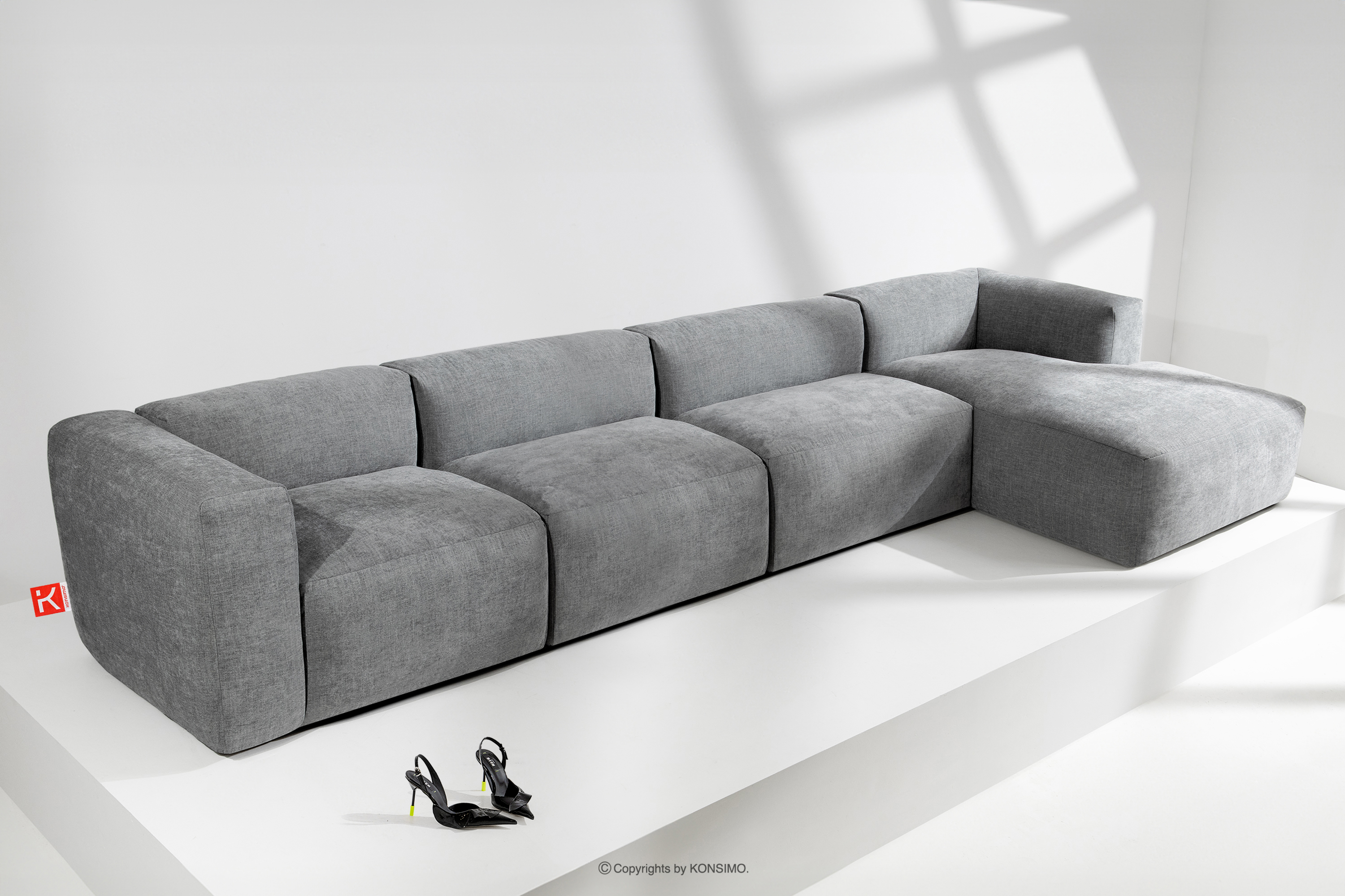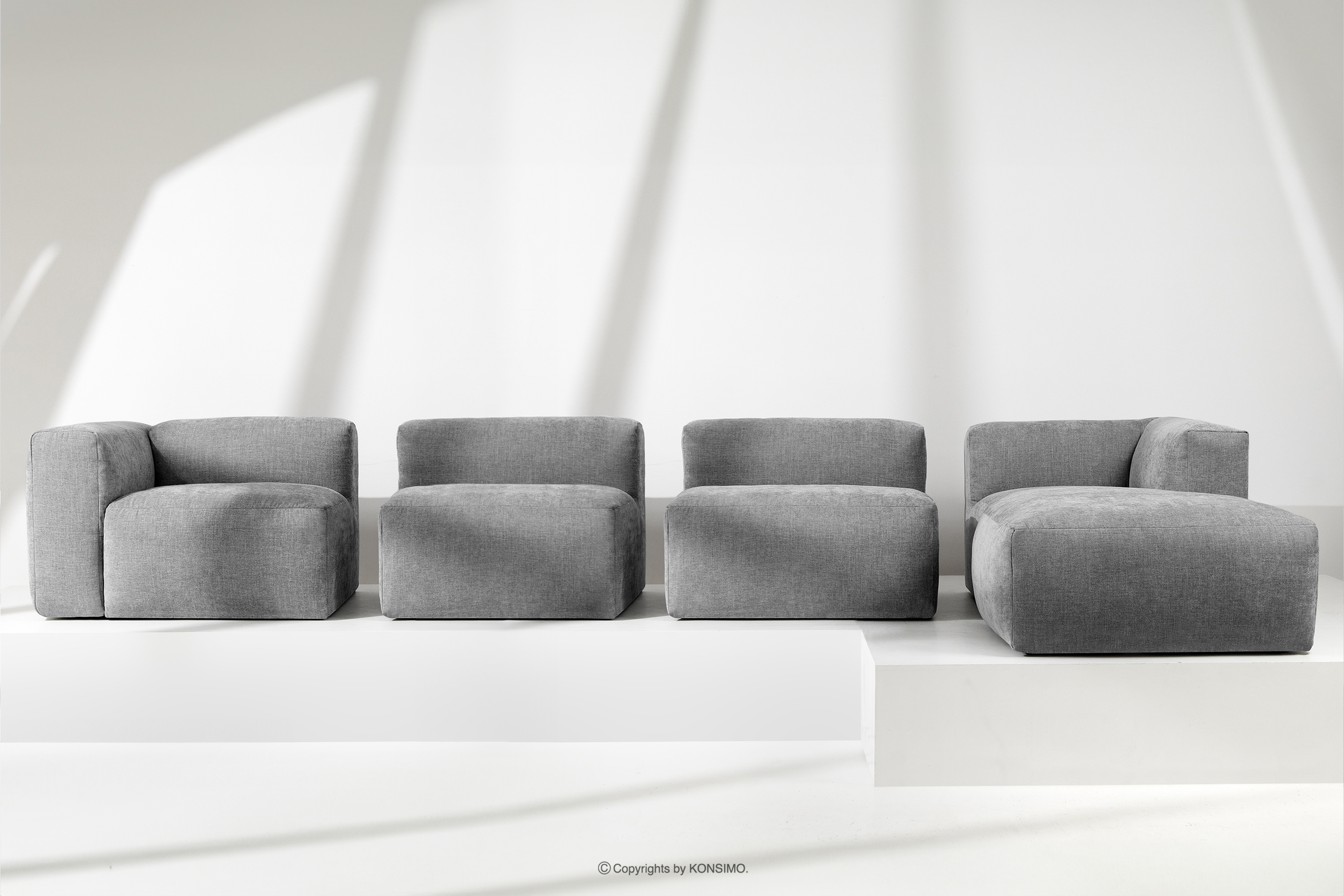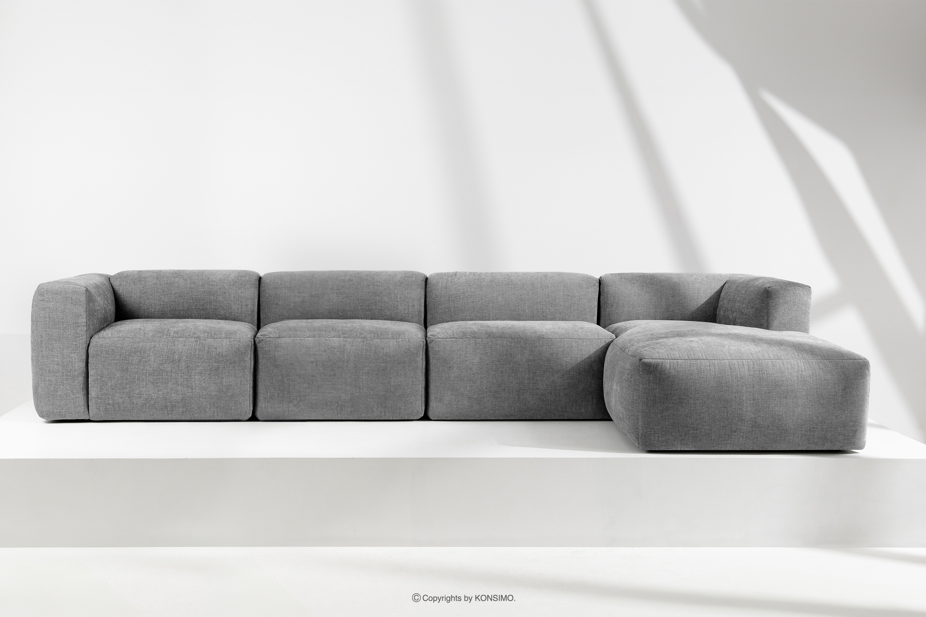 BUFFO zobacz całą kolekcję Duży narożnik modułowy do salonu w tkaninie plecionej jasny popielaty prawy- kolor jasny popielaty