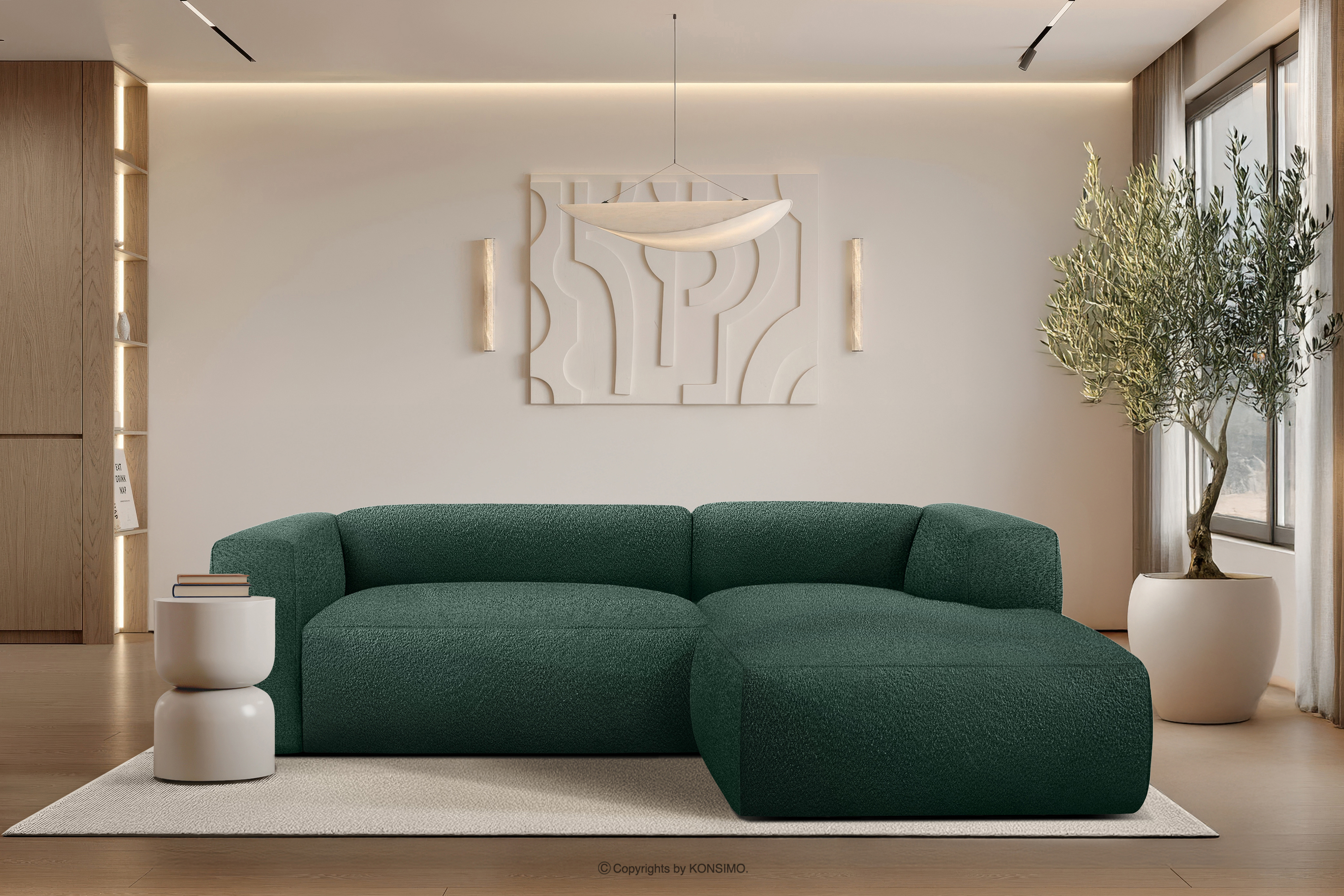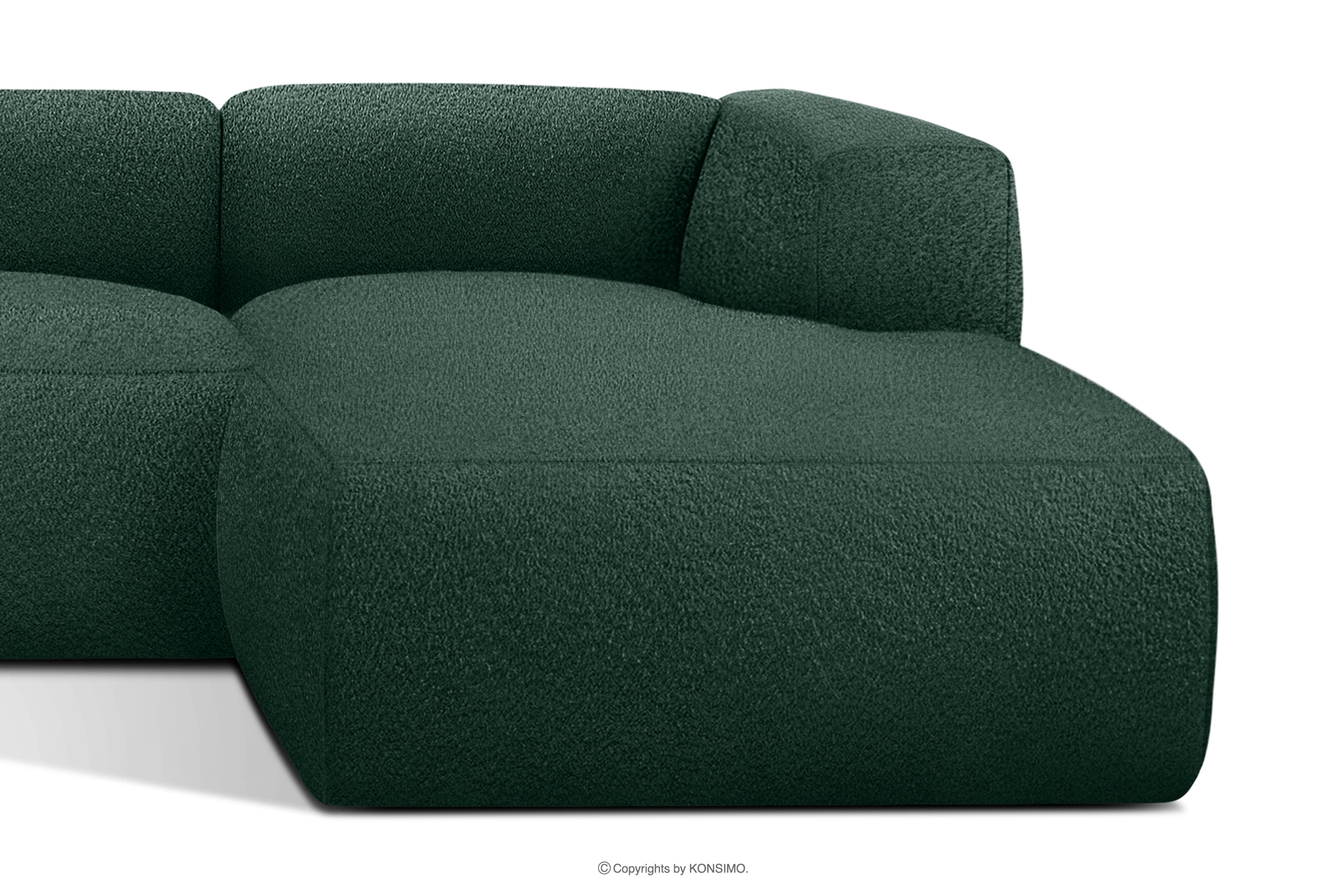 BUFFO zobacz całą kolekcję Miękki narożnik w tkaninie boucle prawy ciemny zielony- kolor ciemny zielony