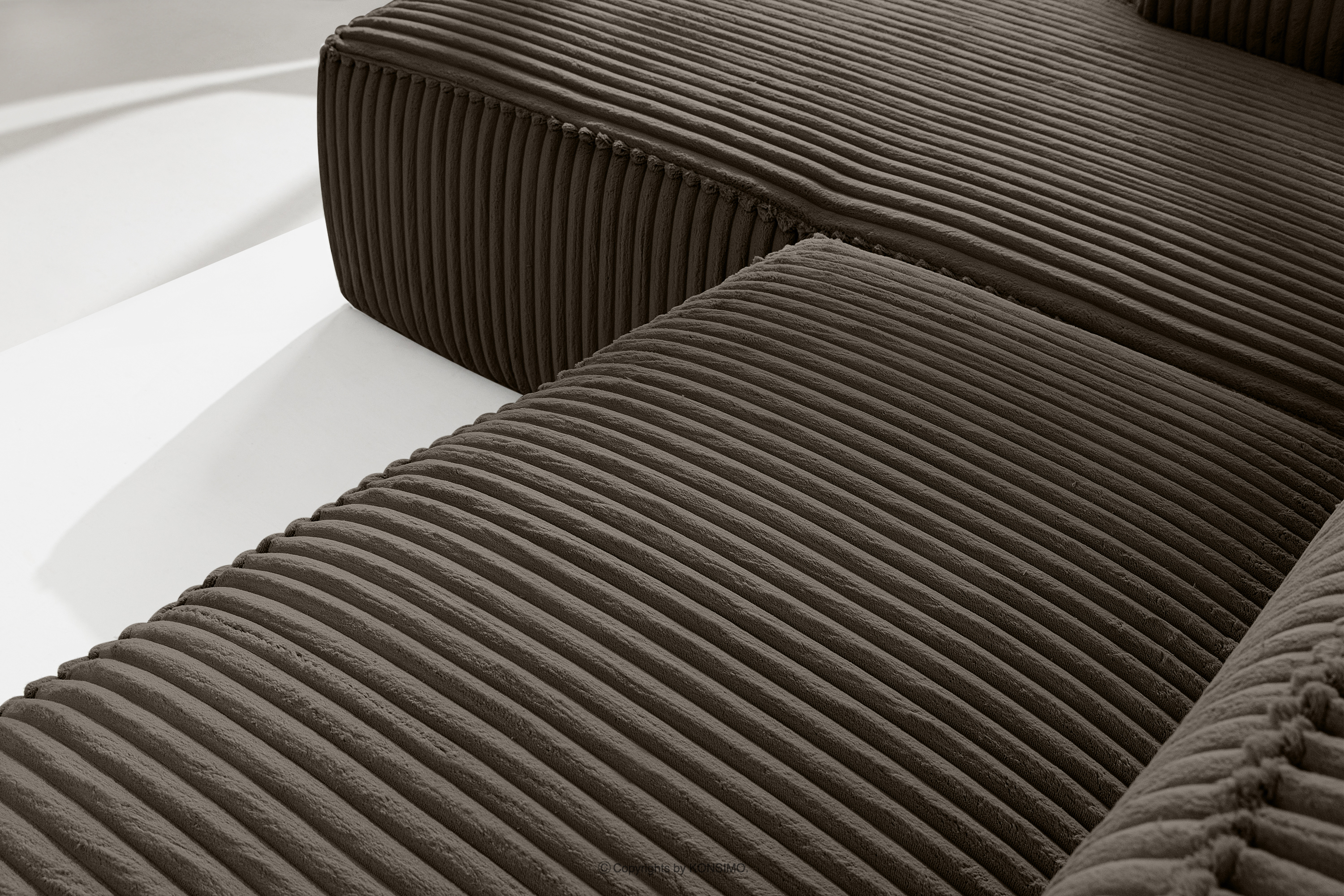 Duży brązowy narożnik w tkaninie sztruks lewy o solidnej konstrukcji i wyjątkowym designie. Stelaż tego eleganckiego mebla został wykonany z połączenia drewna sosnowego i bukowego, zapewniając nie tylko estetyczny wygląd, ale również trwałość na lata. Wnętrze wsparte jest solidną konstrukcją opartą na płycie wiórowej oraz płycie pilśniowej, co gwarantuje stabilność i wygodę użytkowania.
