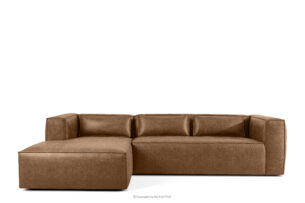 Narożnik w stylu loft tkanina skóropodobna brązowy lewy o solidnej konstrukcji i wyjątkowym designie. Stelaż tego eleganckiego mebla został wykonany z połączenia drewna sosnowego i bukowego, zapewniając nie tylko estetyczny wygląd, ale również trwałość na lata. Wnętrze wsparte jest solidną konstrukcją opartą na drewnie, płycie wiórowej oraz płycie pilśniowej, co gwarantuje stabilność i wygodę użytkowania.