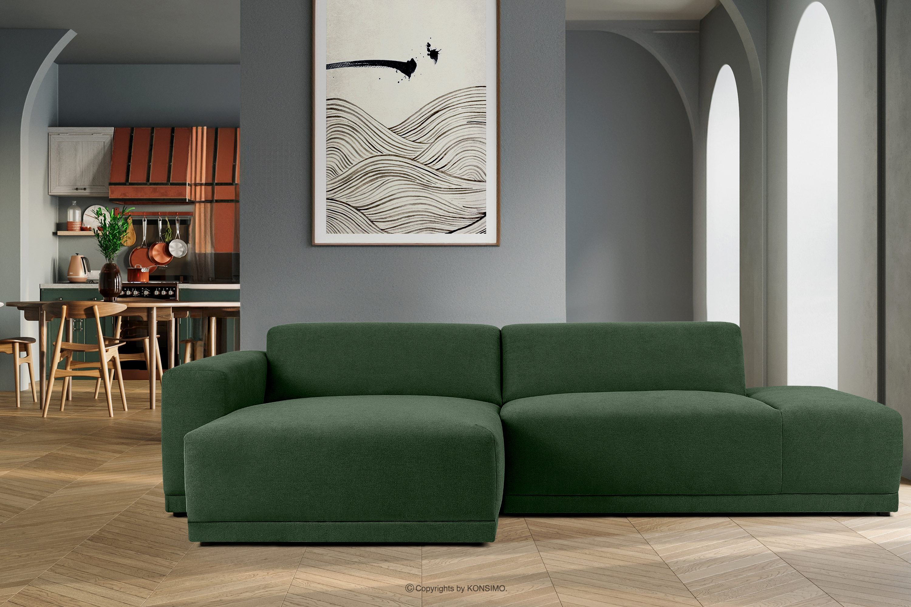 Nowoczesny narożnik do salonu zielony lewy zainspirowany najnowszymi trendami w designie wnętrz, oferuje nie tylko estetykę, ale również doskonałą funkcjonalność. Wyobraź sobie idealny kącik relaksu, gdzie komfort spotyka się z wyjątkowym stylem boho. Sprężyna falista w siedzisku zapewnia wyjątkową elastyczność, dostosowując się do Twoich ruchów i zapewniając maksymalny komfort podczas każdego siedzenia.