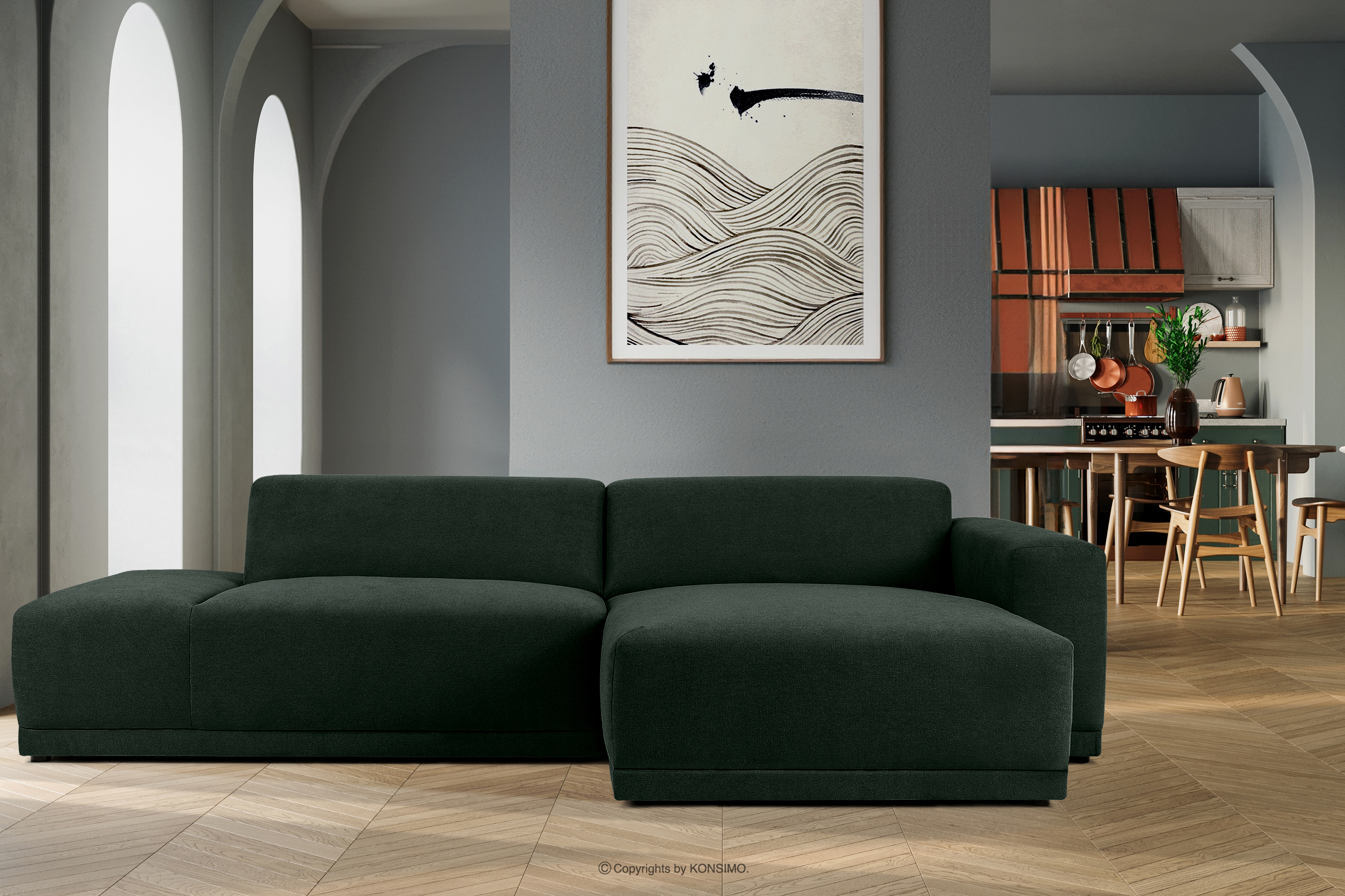 Nowoczesny narożnik do salonu ciemny zielony tkanina pleciona prawy zainspirowany najnowszymi trendami w designie wnętrz, oferuje nie tylko estetykę, ale również doskonałą funkcjonalność. Wyobraź sobie idealny kącik relaksu, gdzie komfort spotyka się z wyjątkowym stylem boho. Sprężyna falista w siedzisku zapewnia wyjątkową elastyczność, dostosowując się do Twoich ruchów i zapewniając maksymalny komfort podczas każdego siedzenia.