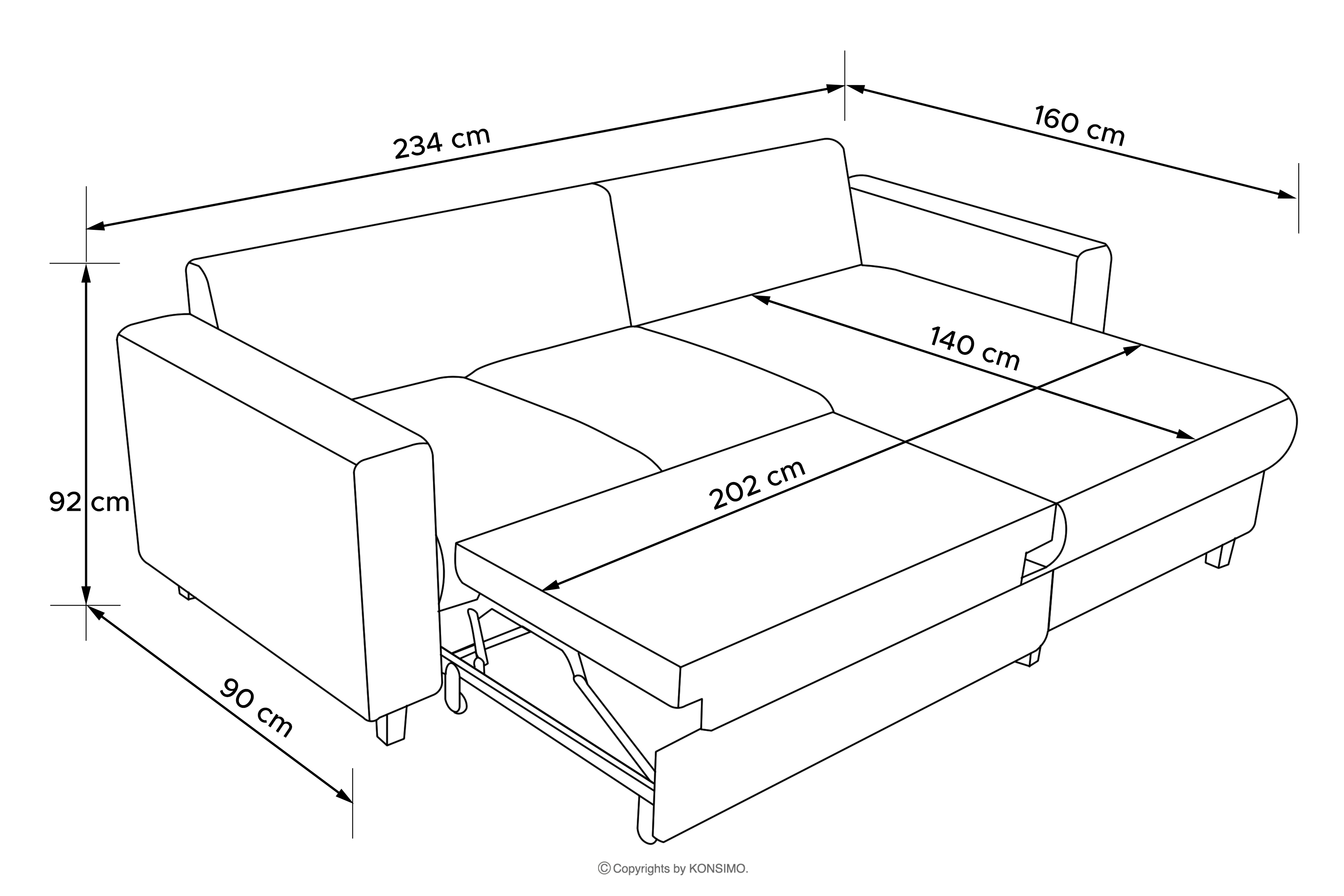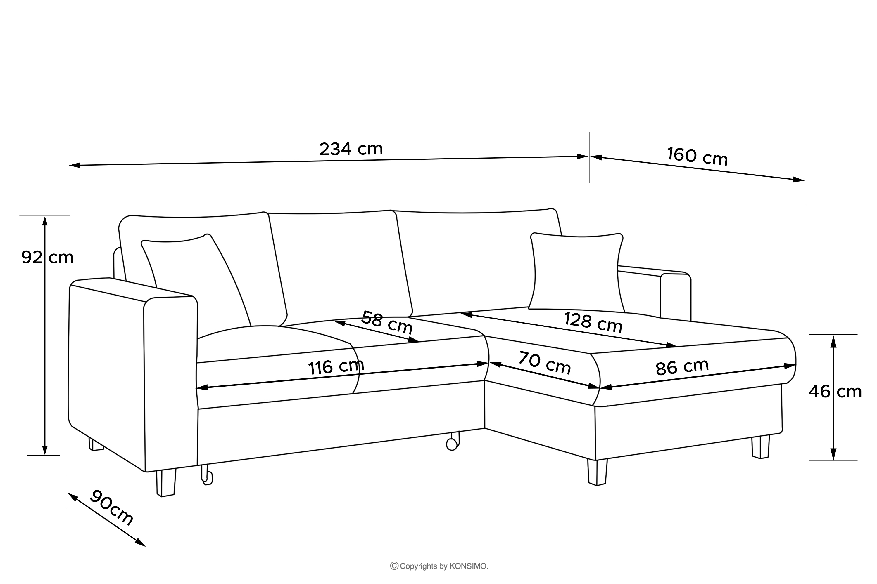 Średnio twarde siedzisko z pianką T2842 o grubości 10 cm oraz sprężyna falista gwarantują wyjątkowy komfort w trakcie użytkowania. Dodatkowym atutem jest możliwość rozkładania, co sprawia, że narożnik z łatwością dostosuje się do Twoich potrzeb, a praktyczny pojemnik na pościel umożliwi przechowywanie pościeli i poduszek bez problemu.