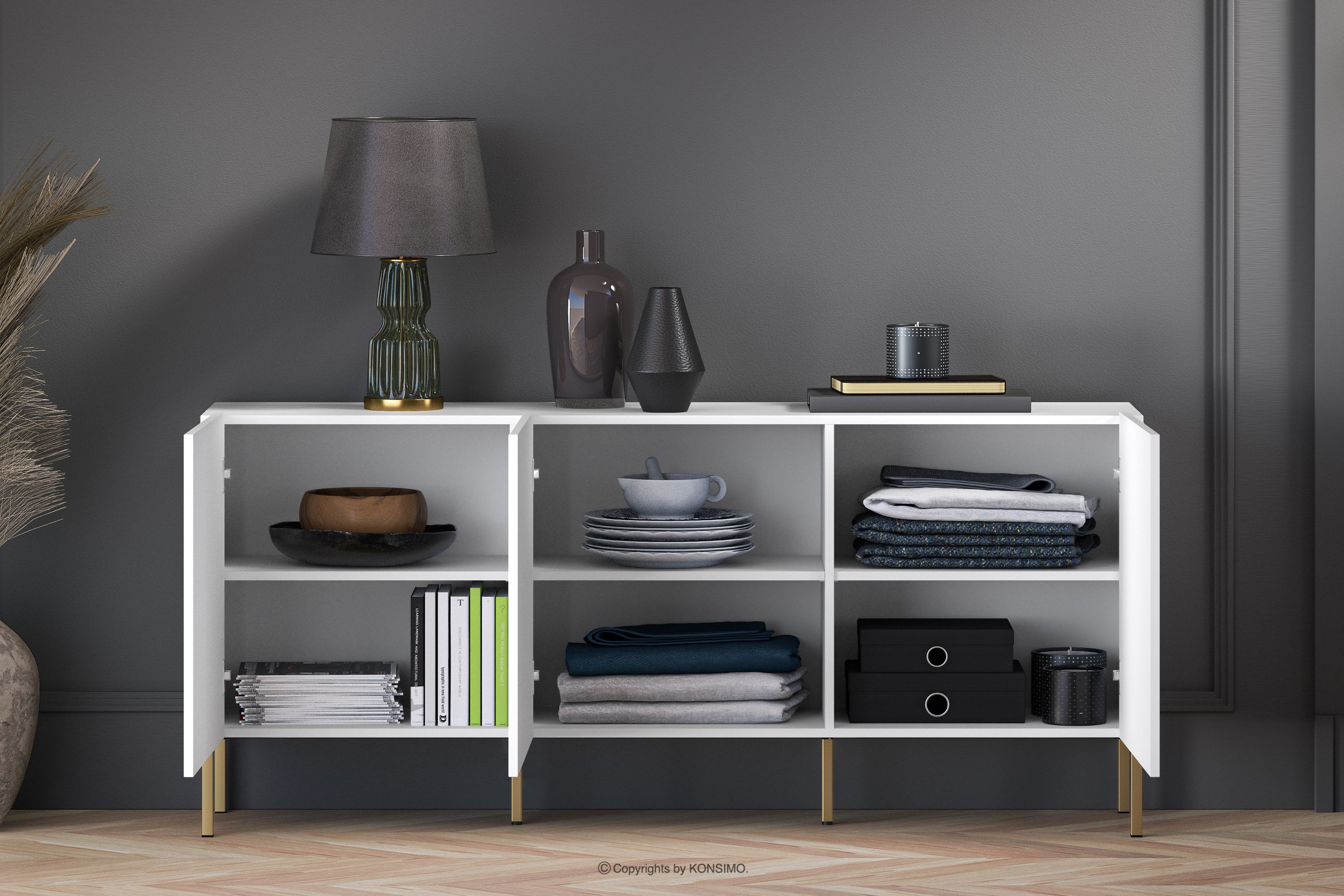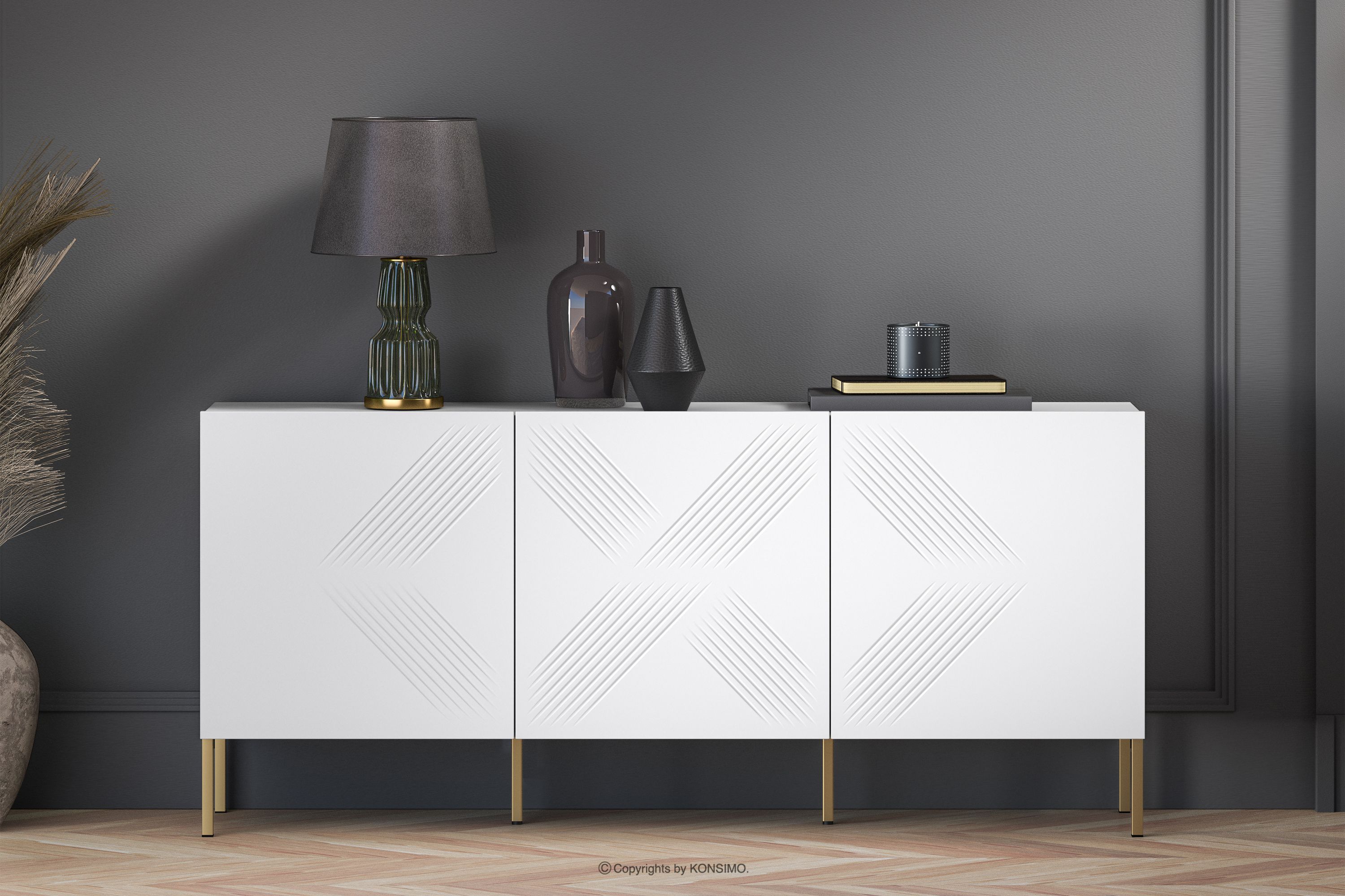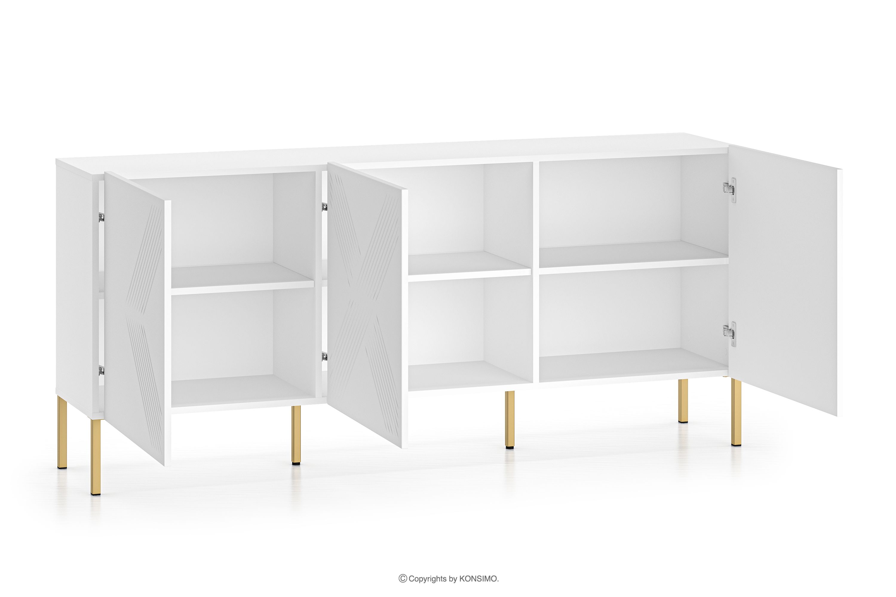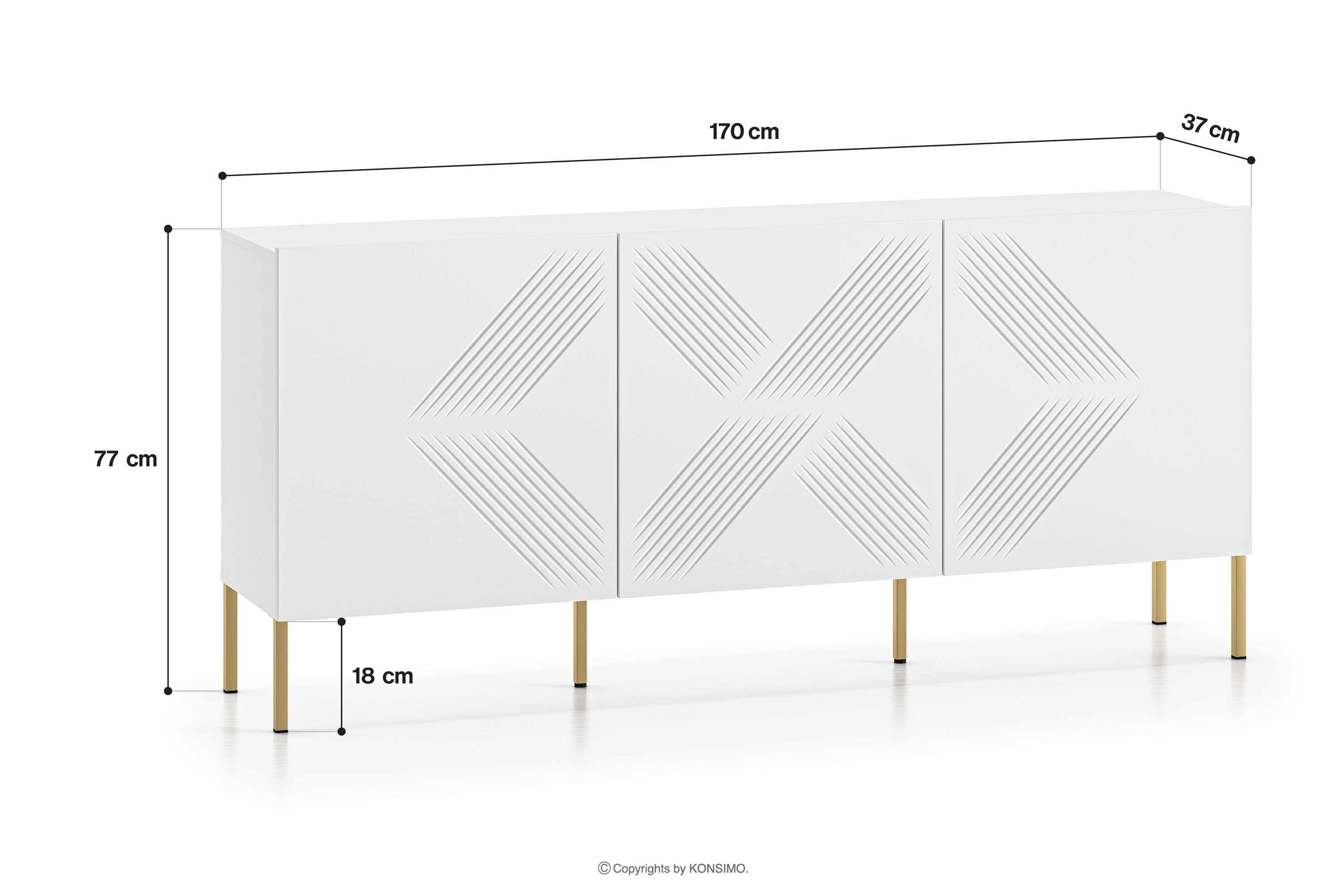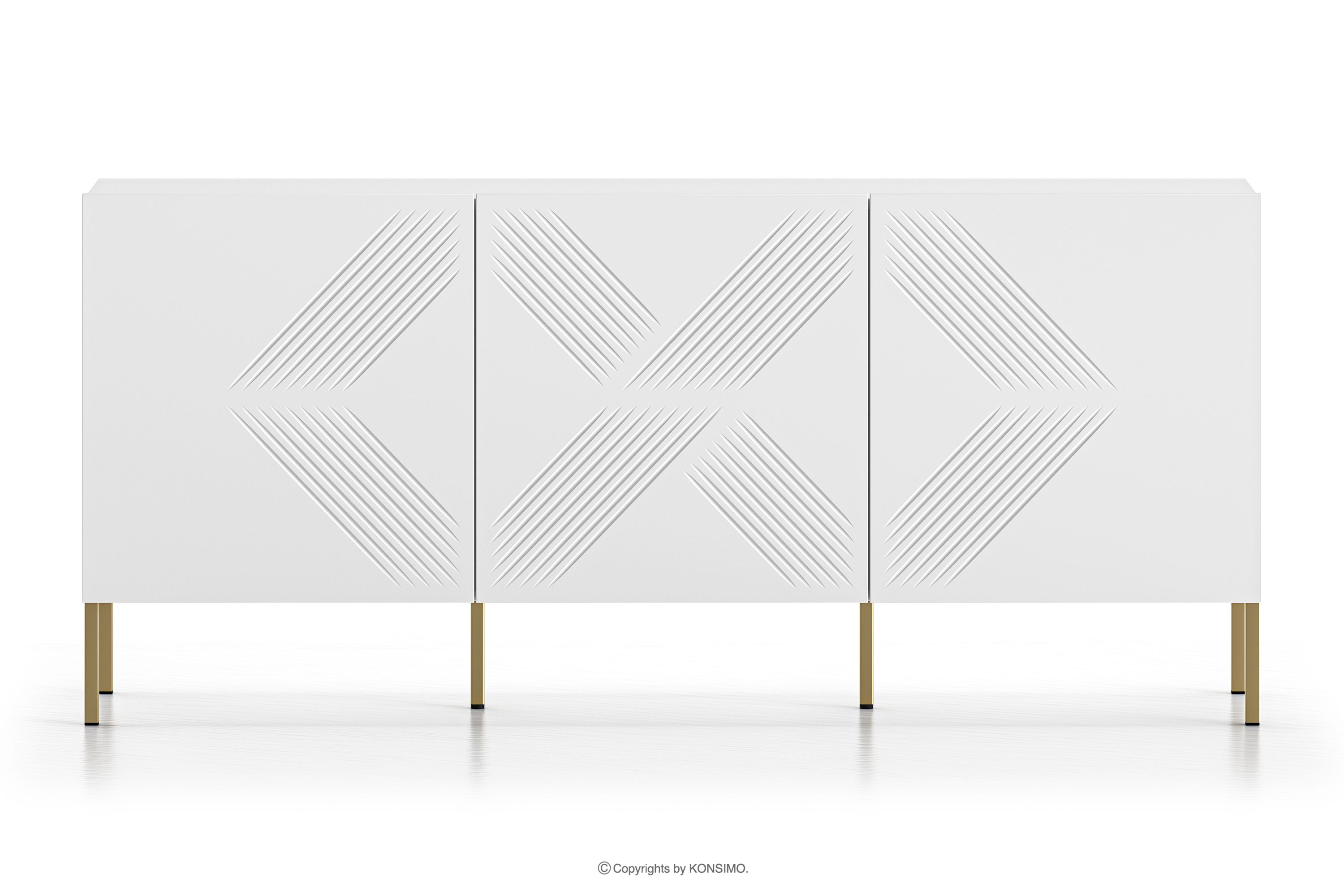 NEBRO zobacz całą kolekcję Biała komoda trzydrzwiowa na złotych nóżkach- kolor biały/złoty