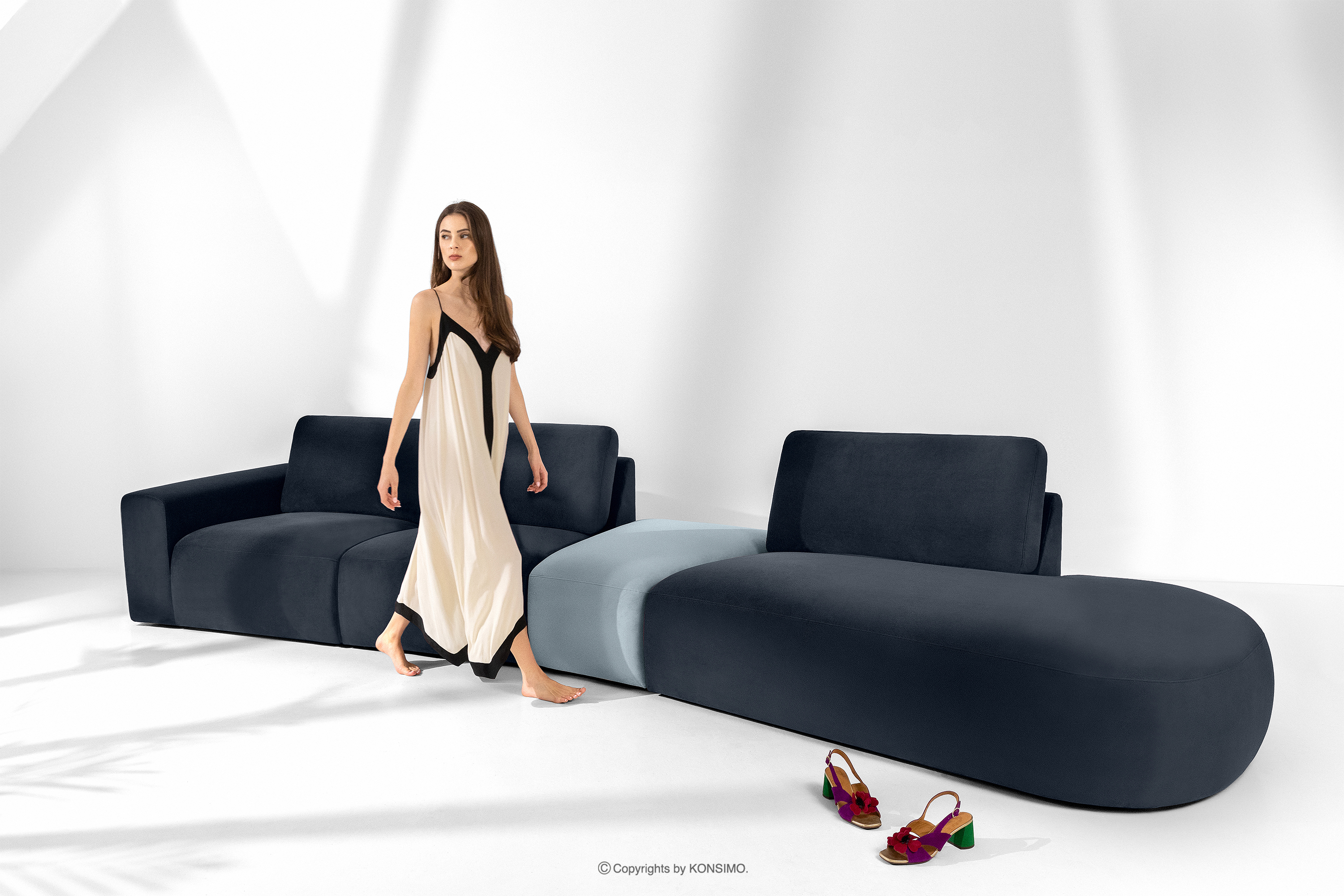 Narożnik organic do salonu w tkaninie welur granatowy/niebieski prawy to synonim nowoczesnego komfortu i elegancji. Wykonany z najwyższej jakości materiałów modułowość zapewnia dowolność użytkowania w zależności od potrzeb. Narożnik obity jest tkaniną welur, co nadaje mu luksusowy wygląd, a także jest łatwo go utrzymać w czystości. Styl nowoczesny, w którym zaprojektowany jest narożnik ZUCCO, idealnie wpisuje się w aktualne trendy wnętrzarskie.