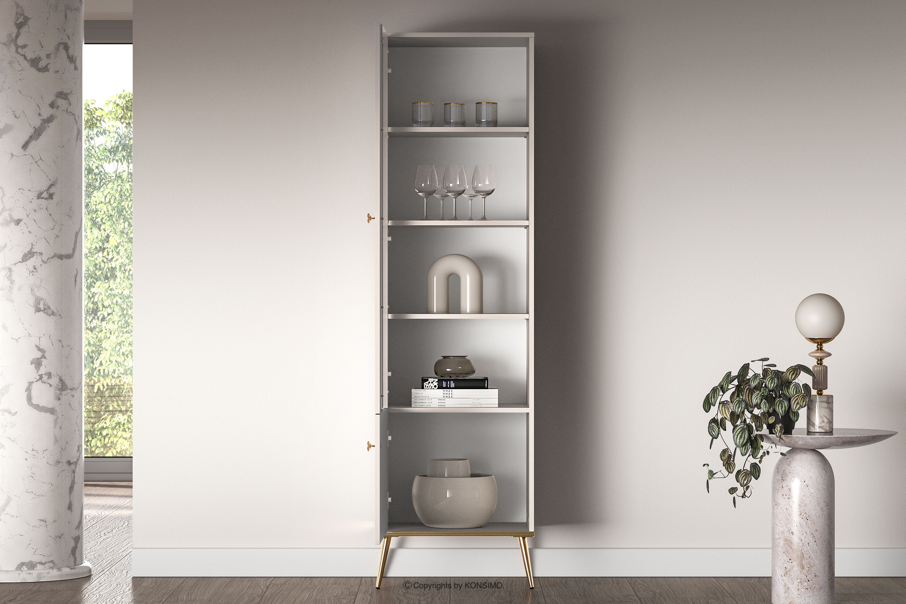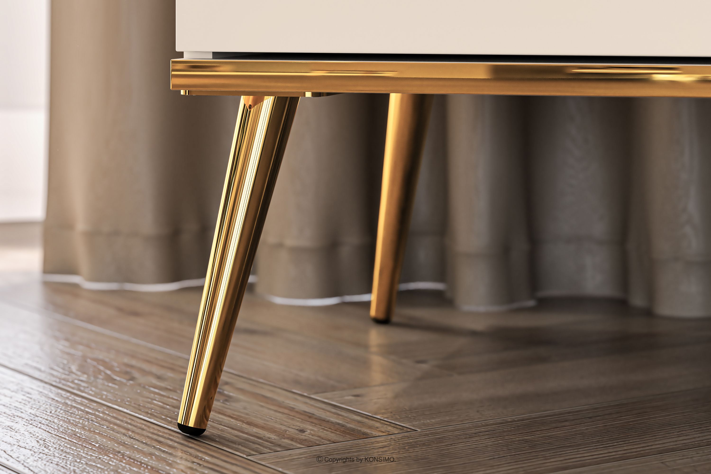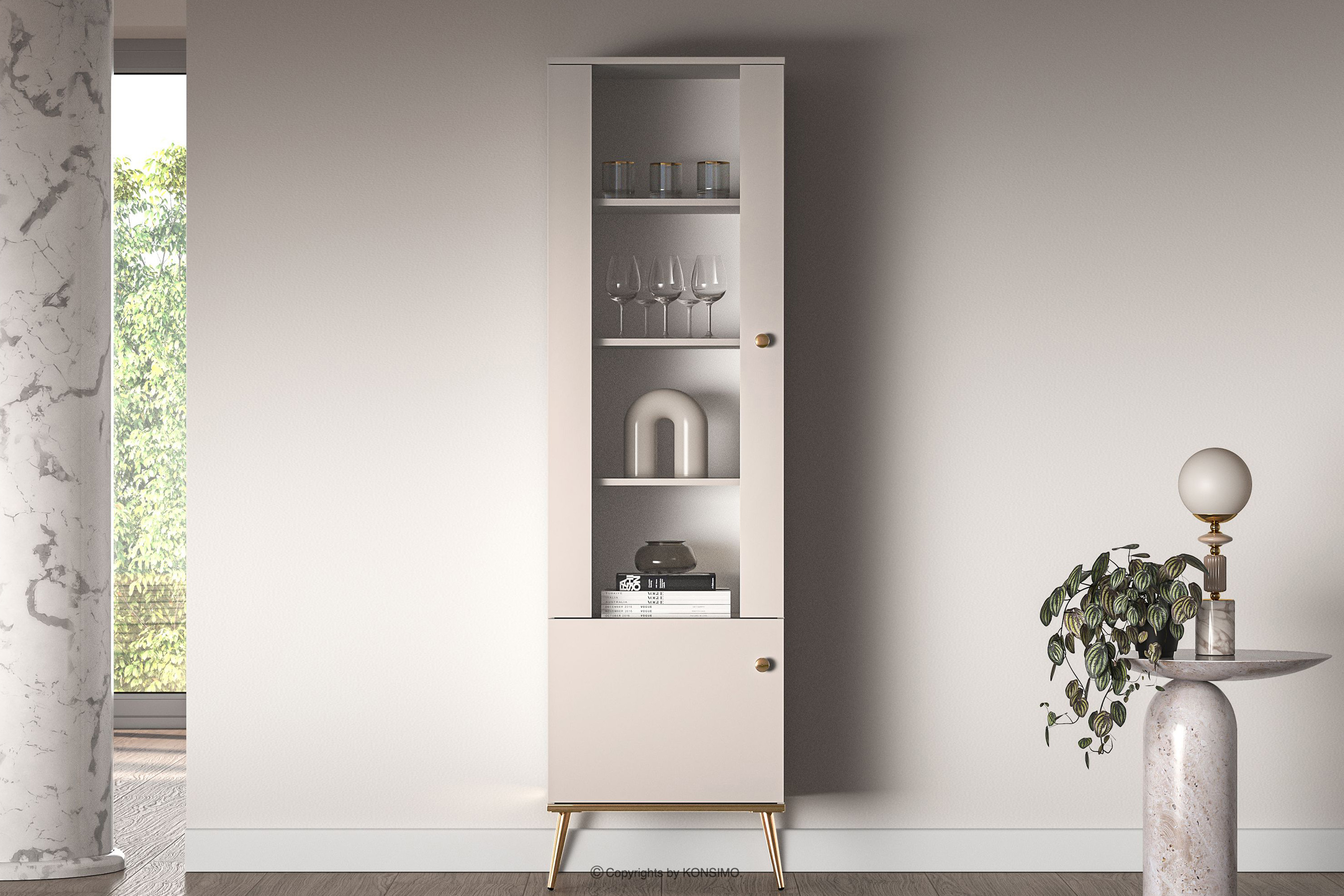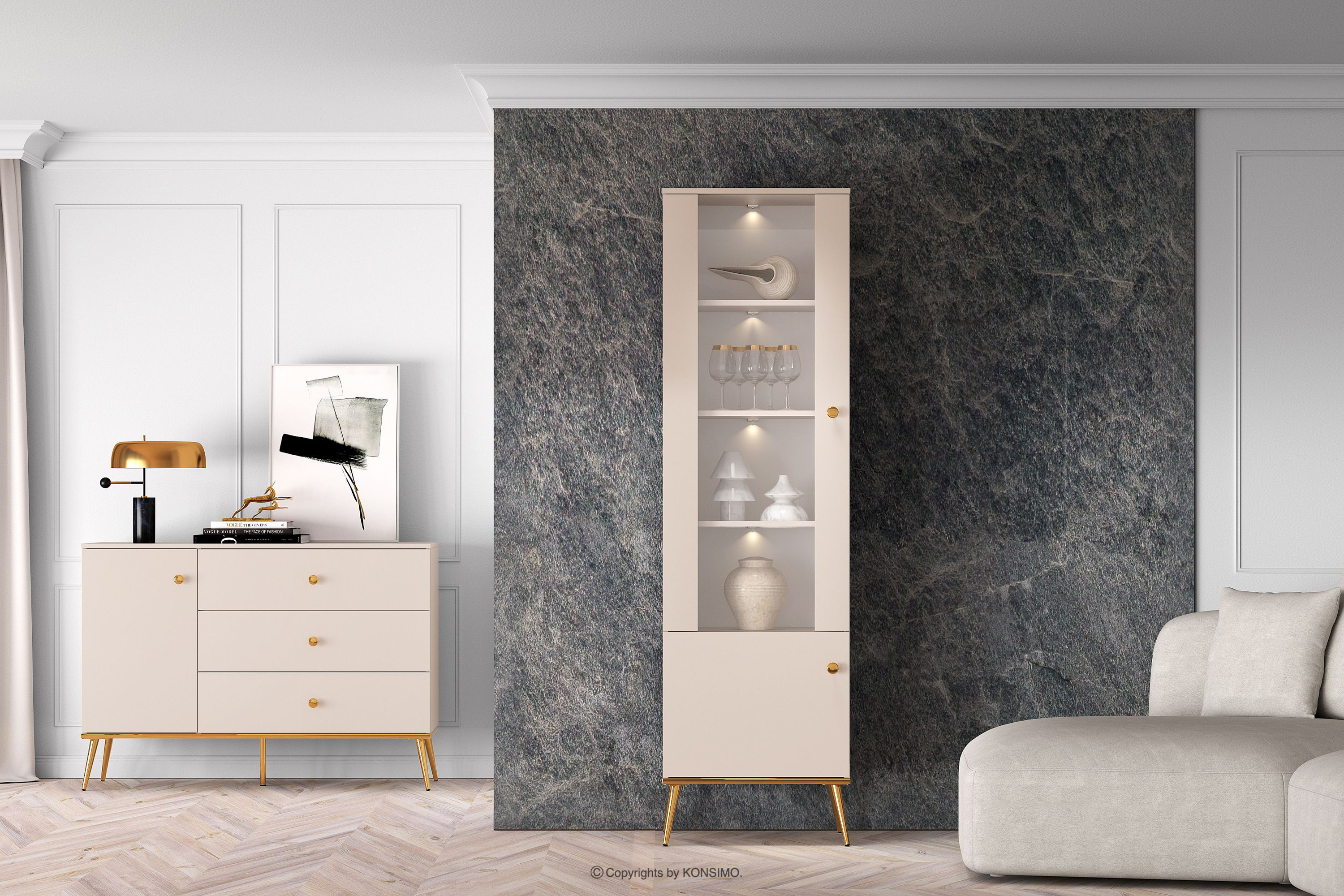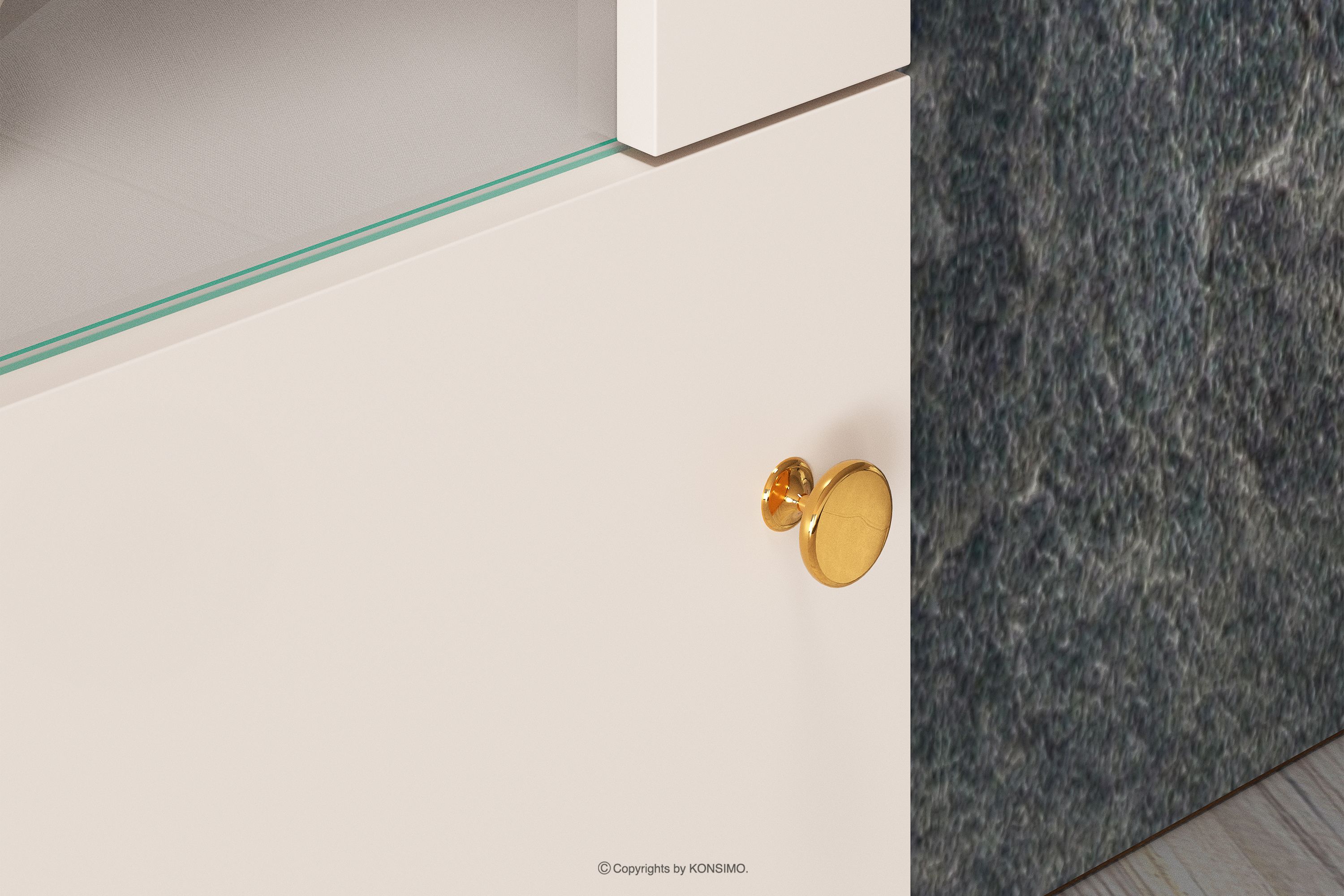 Witryna w stylu elegant kremowa zaprojektowana z myślą o osobach, które pragną wprowadzić do swoich wnętrz elementy klasy i luksusu. Metalowe uchwyty w kolorze złota oraz złote nóżki to detale, które podkreślają elegancję mebli i nadają im luksusowego charakteru. Płyta laminowana jest znana ze swojej odporności na uszkodzenia mechaniczne, zarysowania oraz działanie wilgoci, dzięki czemu meble zachowują swój pierwotny wygląd przez wiele lat.
