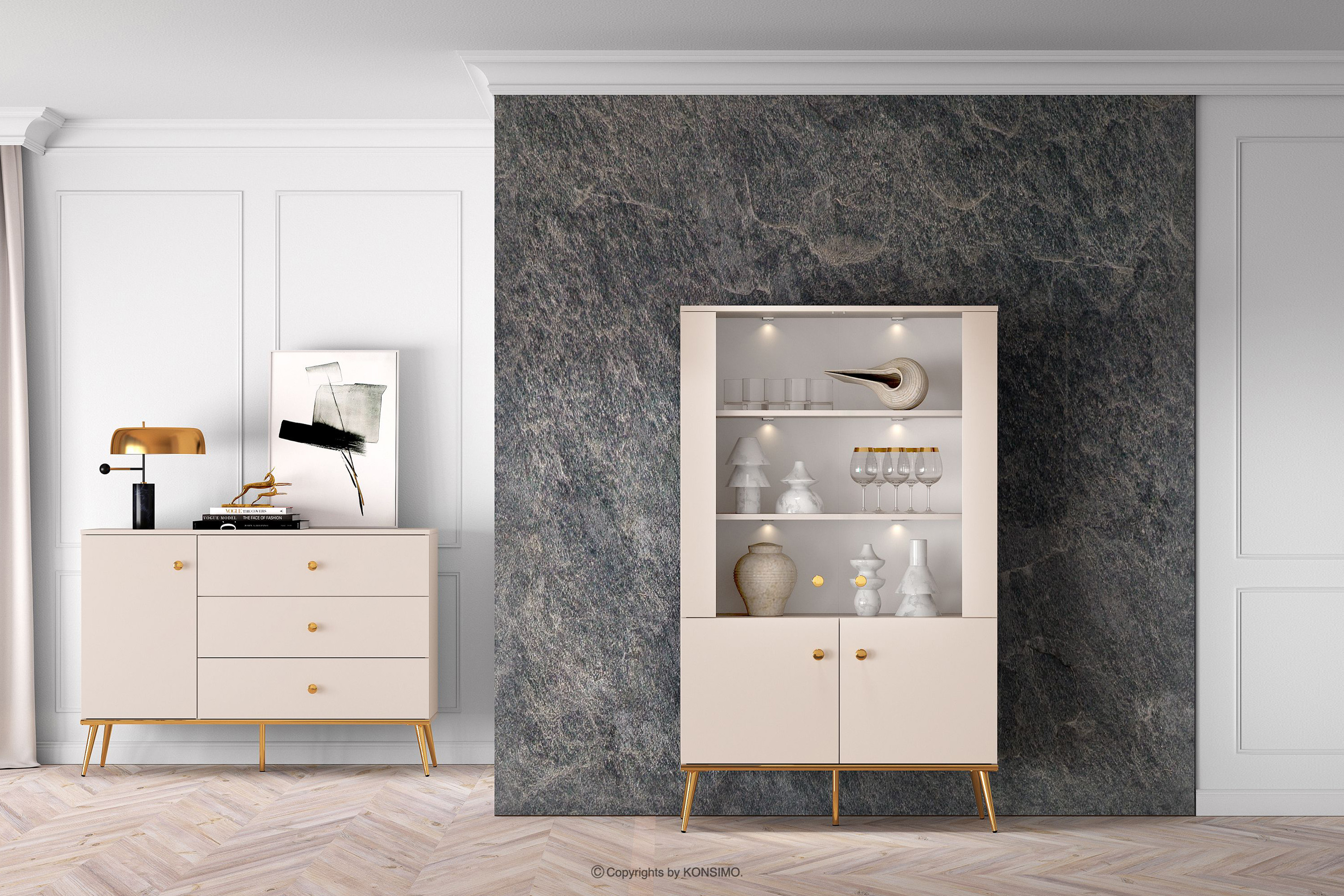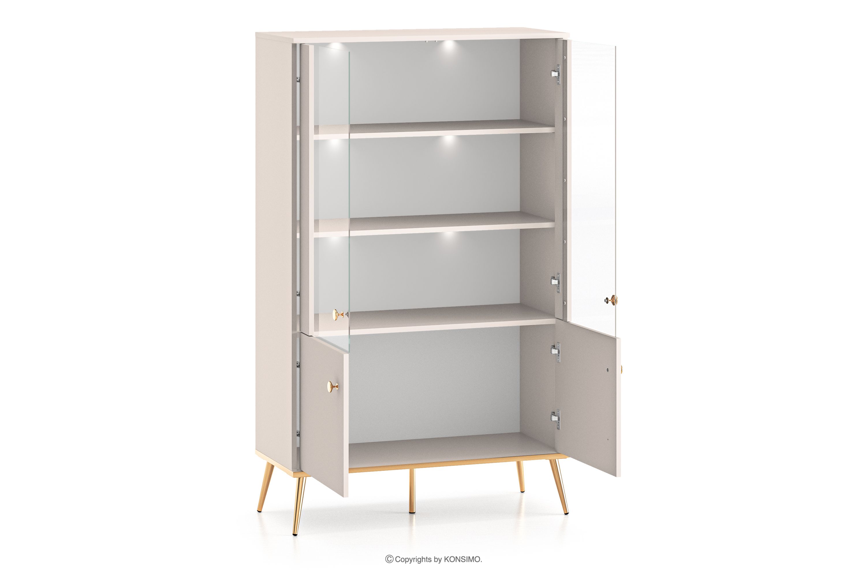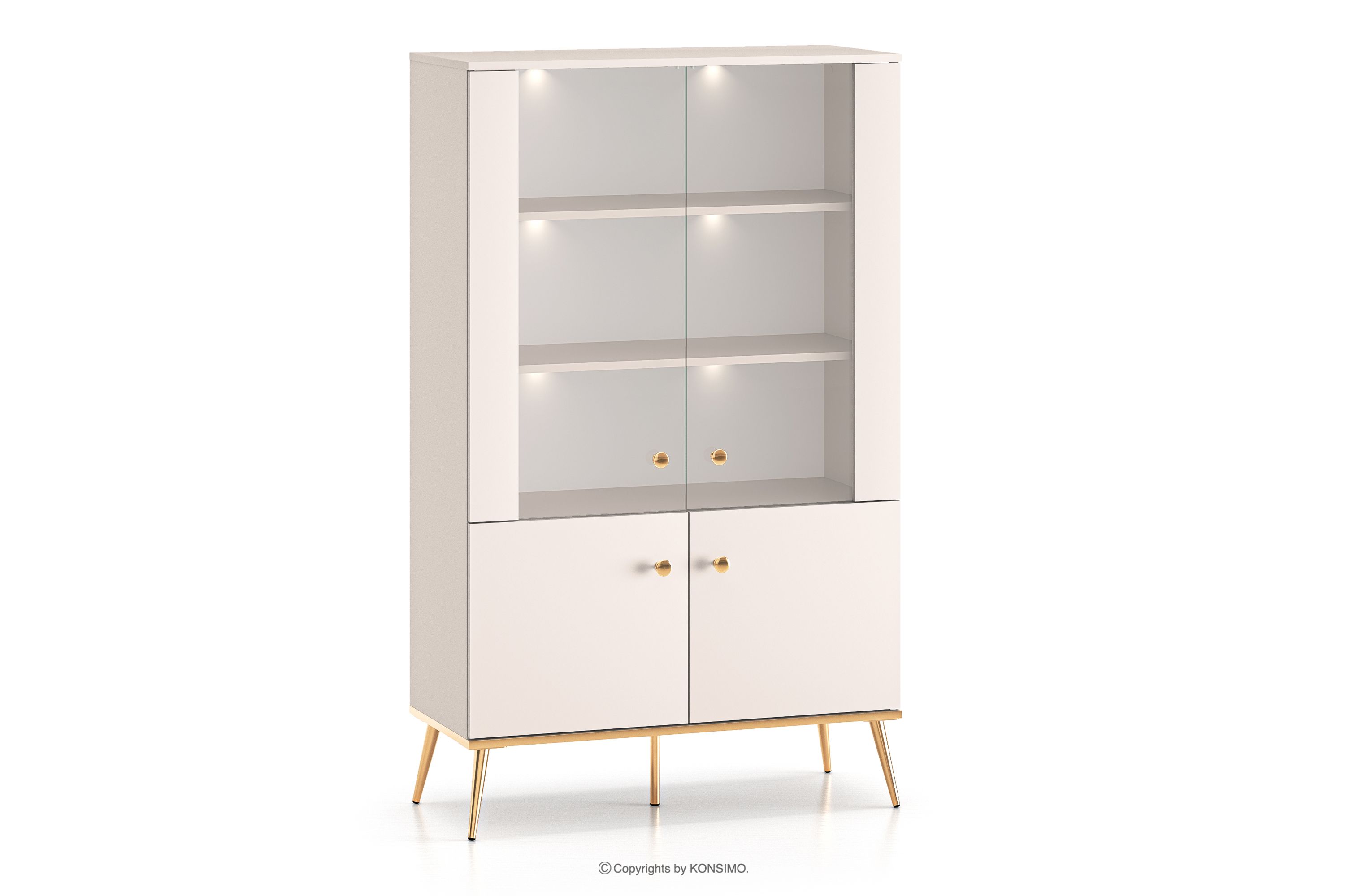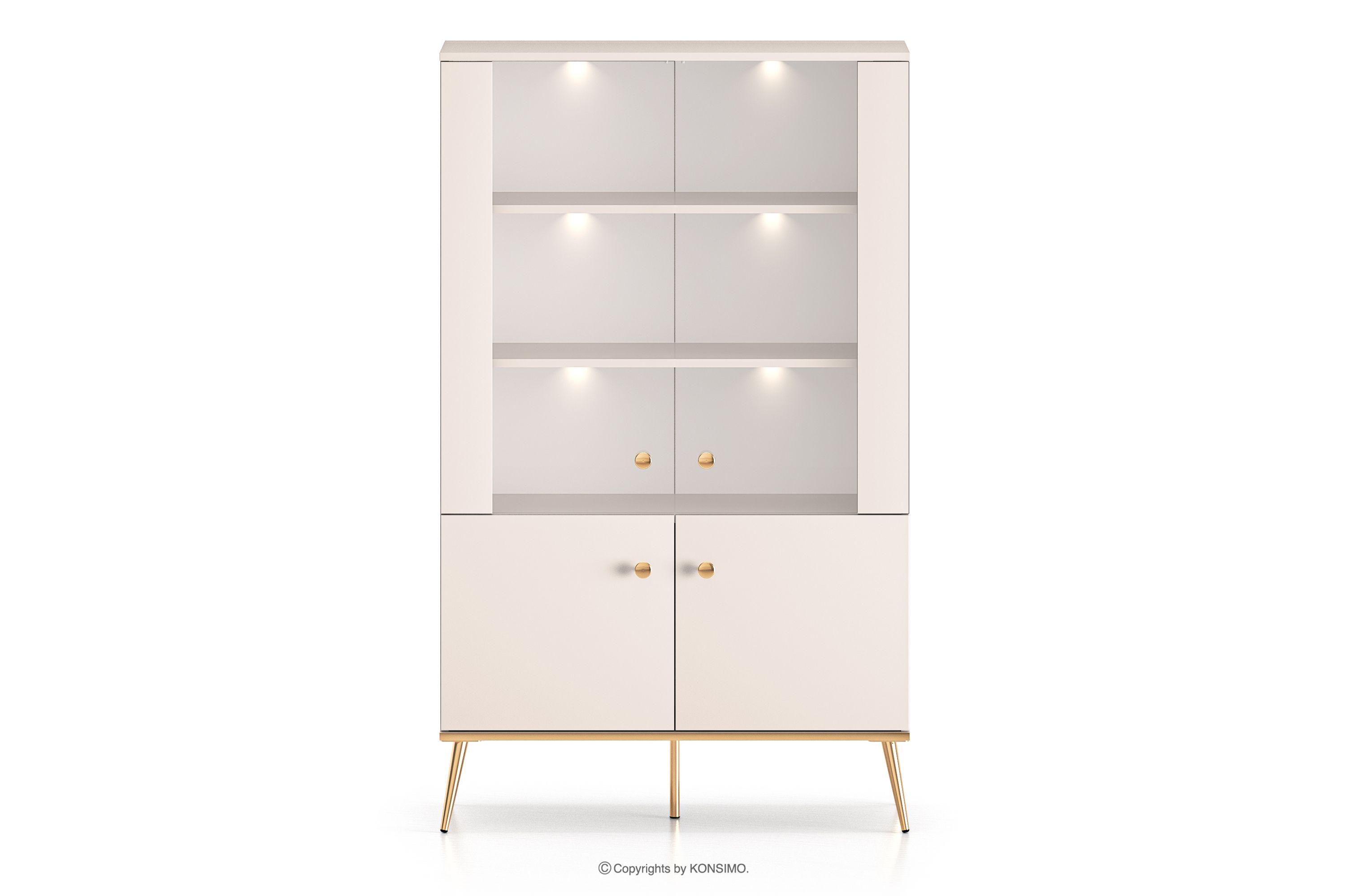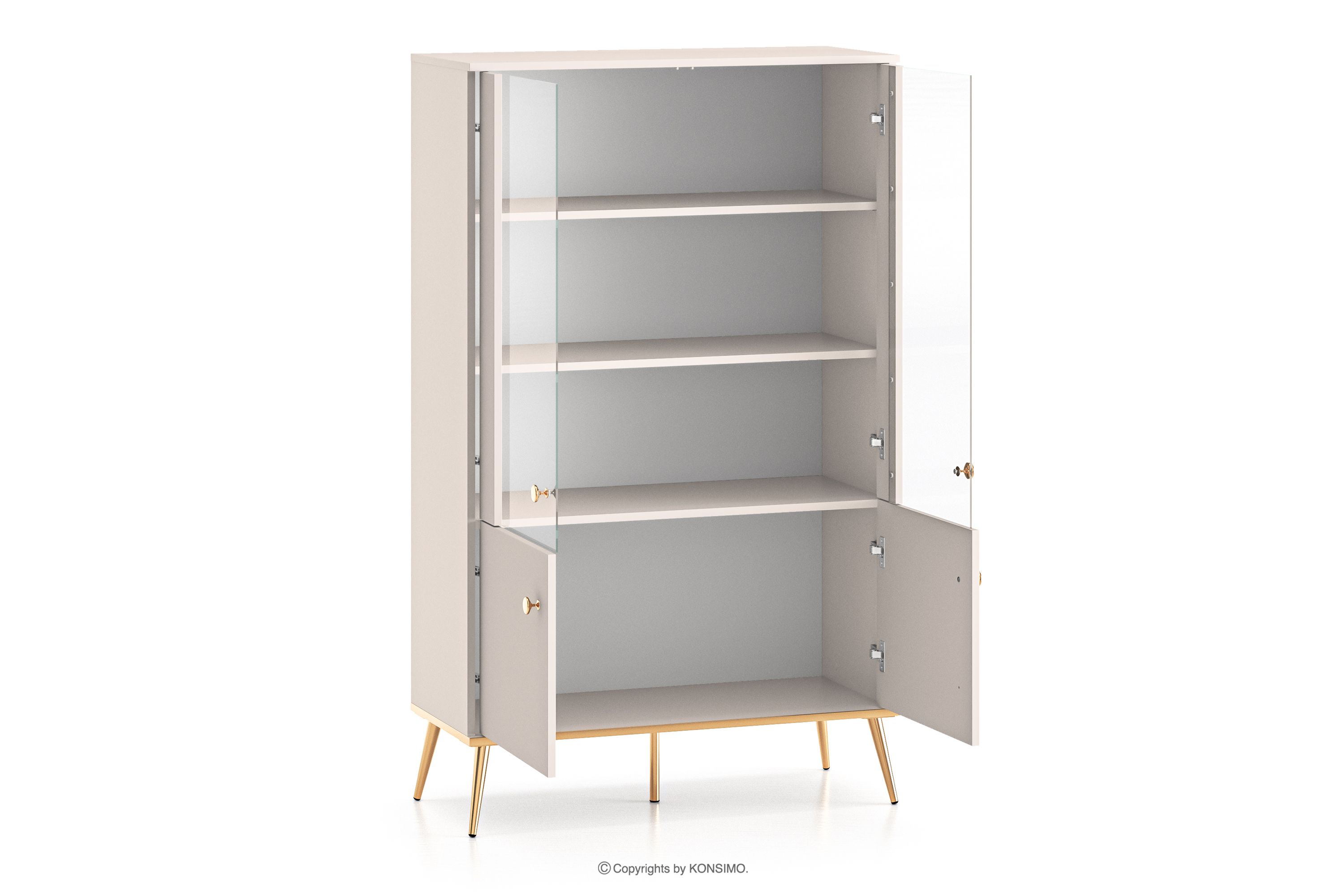 Duża witryna w stylu elegant kremowa zaprojektowana z myślą o osobach, które pragną wprowadzić do swoich wnętrz elementy klasy i luksusu. Metalowe uchwyty w kolorze złota oraz złote nóżki to detale, które podkreślają elegancję mebli i nadają im luksusowego charakteru. Płyta laminowana jest znana ze swojej odporności na uszkodzenia mechaniczne, zarysowania oraz działanie wilgoci, dzięki czemu meble zachowują swój pierwotny wygląd przez wiele lat.