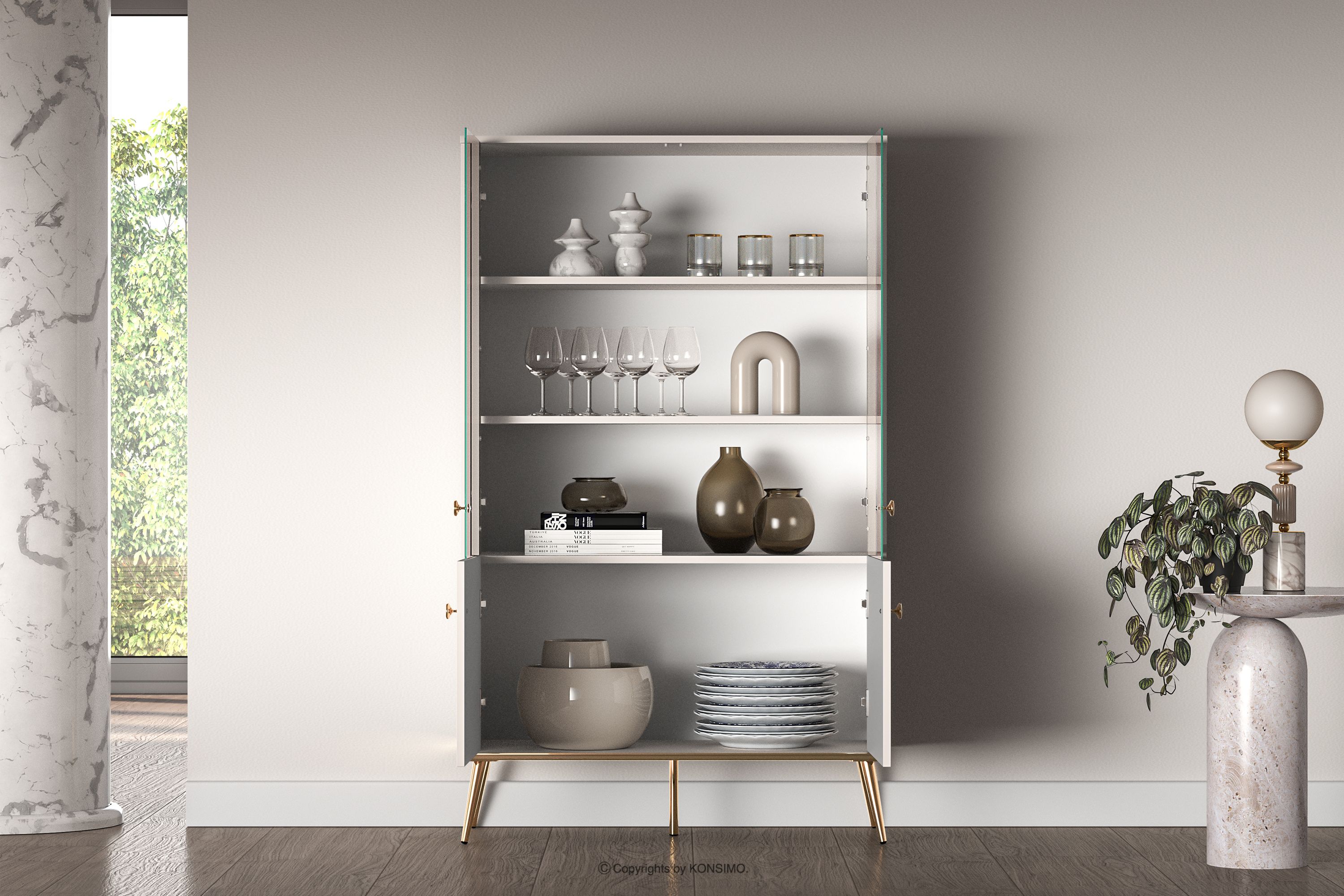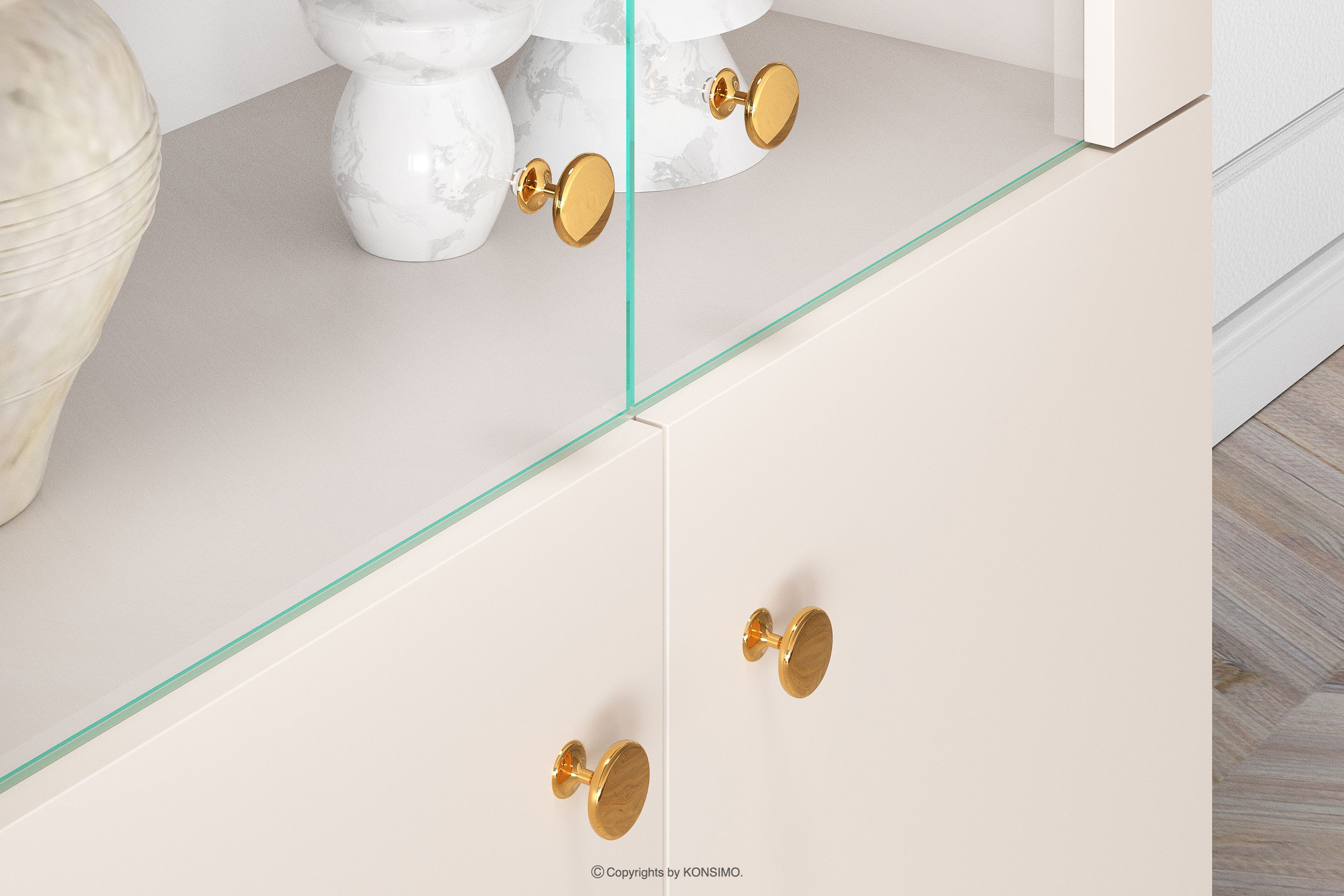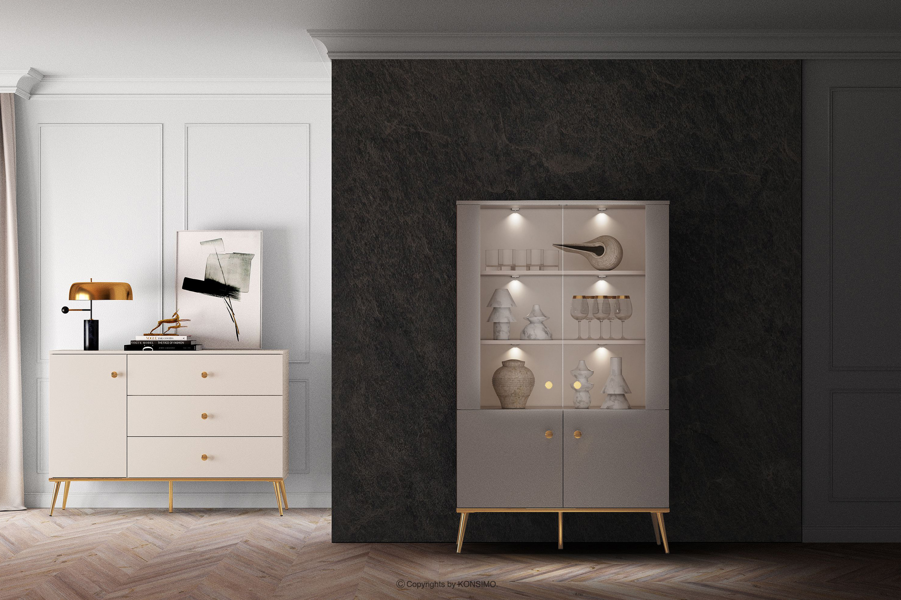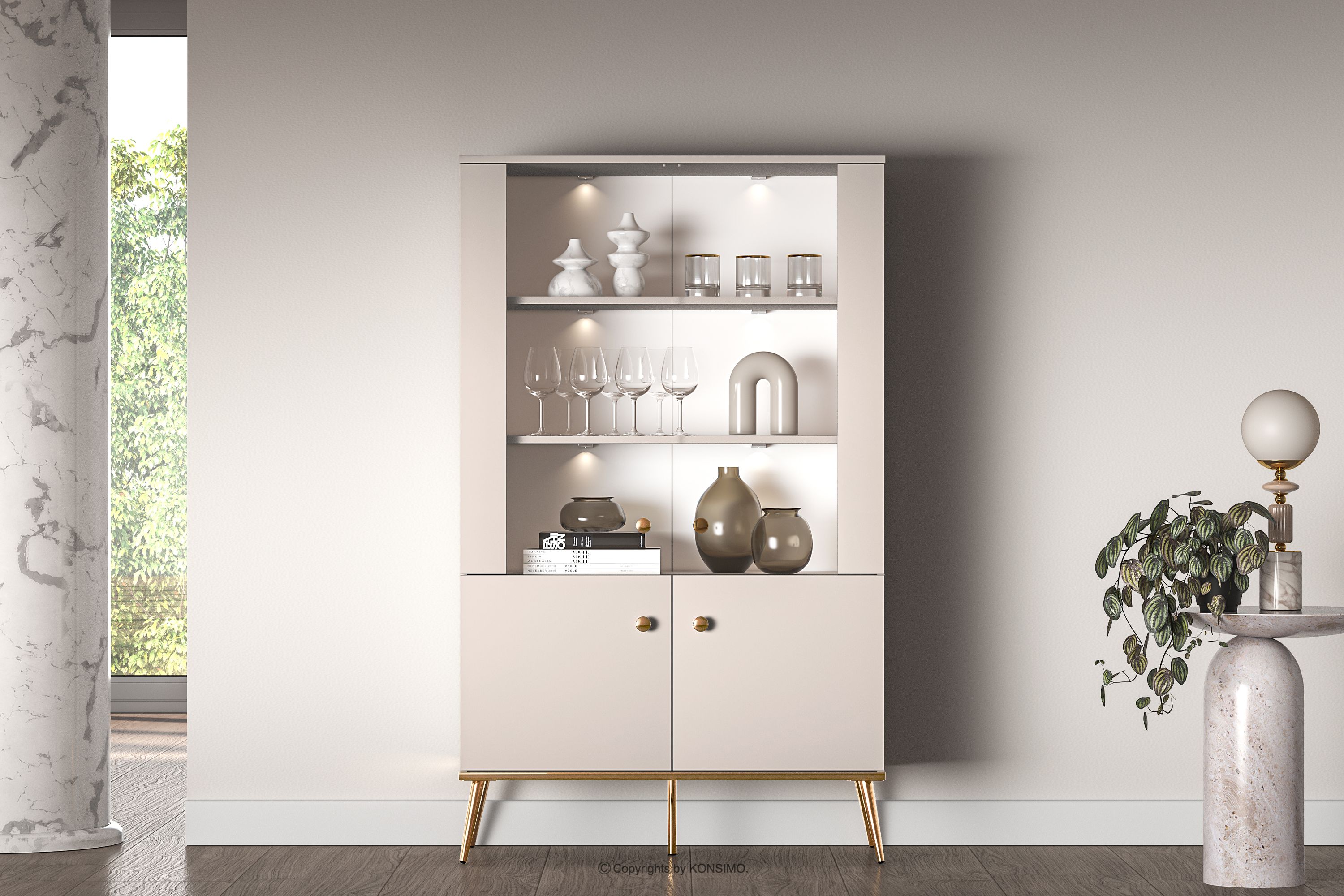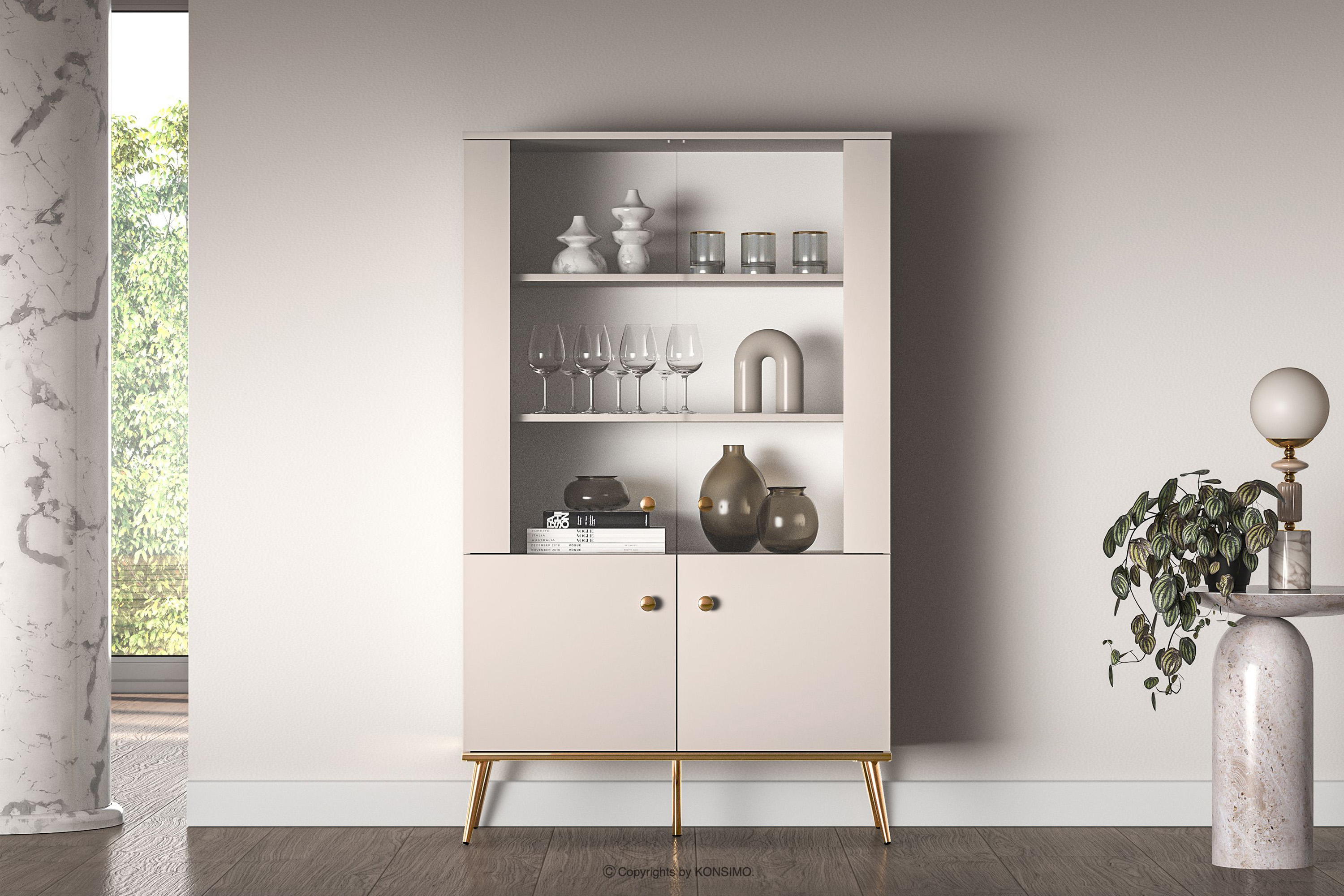 Duża witryna w stylu elegant kremowa zaprojektowana z myślą o osobach, które pragną wprowadzić do swoich wnętrz elementy klasy i luksusu. Metalowe uchwyty w kolorze złota oraz złote nóżki to detale, które podkreślają elegancję mebli i nadają im luksusowego charakteru. Płyta laminowana jest znana ze swojej odporności na uszkodzenia mechaniczne, zarysowania oraz działanie wilgoci, dzięki czemu meble zachowują swój pierwotny wygląd przez wiele lat.