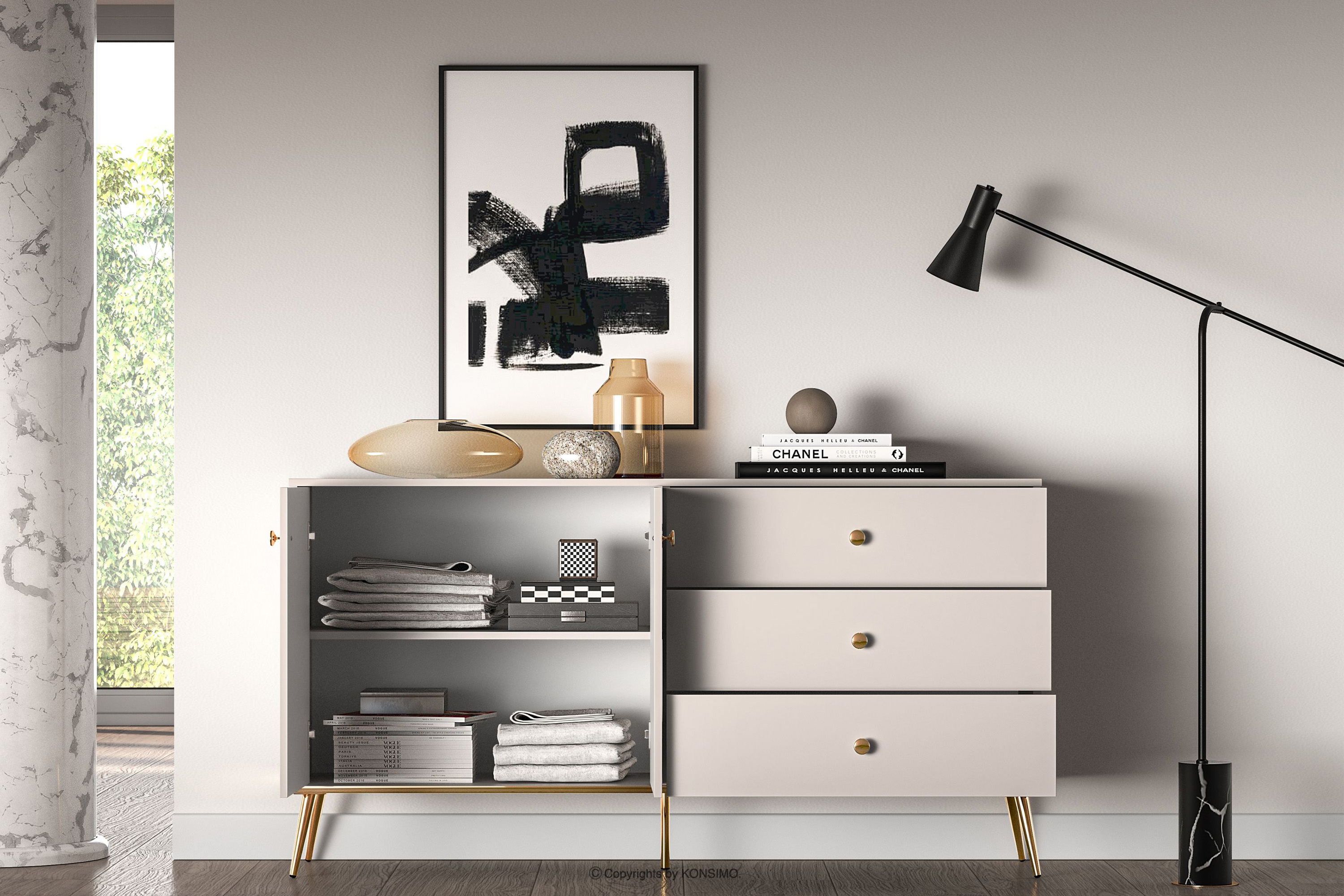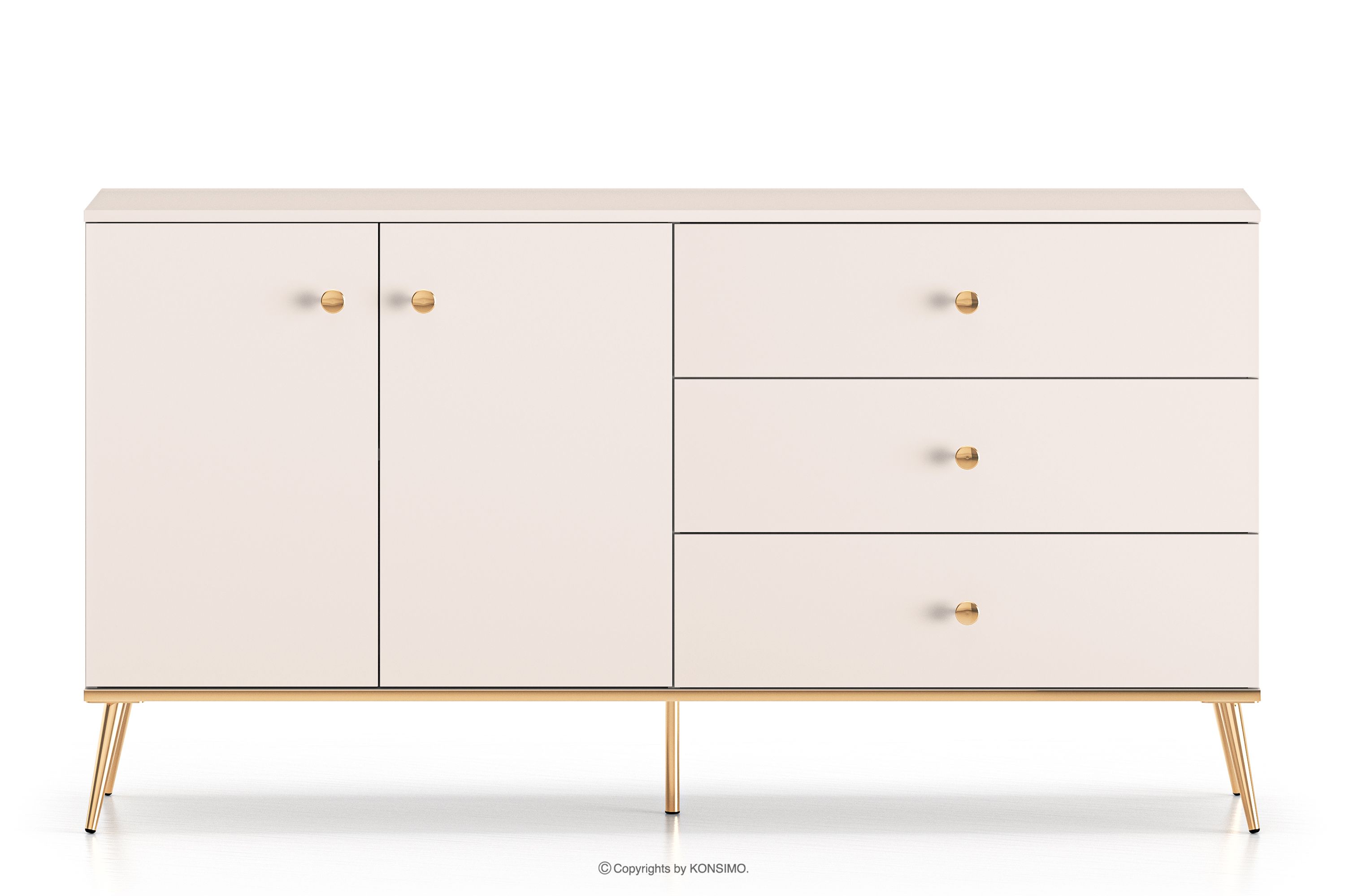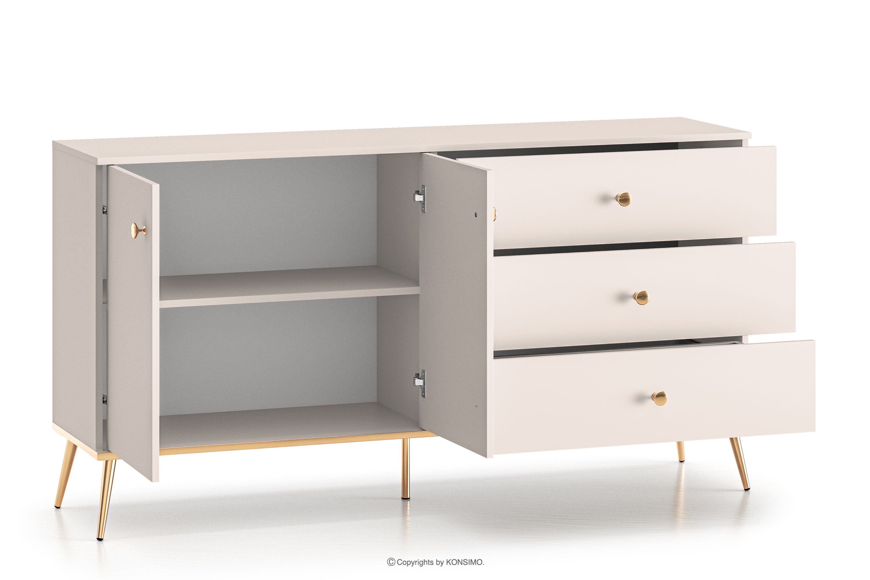 Szeroka komoda w stylu elegant kremowa zaprojektowana z myślą o osobach, które pragną wprowadzić do swoich wnętrz elementy klasy i luksusu. Metalowe uchwyty w kolorze złota oraz złote nóżki to detale, które podkreślają elegancję mebli i nadają im luksusowego charakteru. Płyta laminowana jest znana ze swojej odporności na uszkodzenia mechaniczne, zarysowania oraz działanie wilgoci, dzięki czemu meble zachowują swój pierwotny wygląd przez wiele lat.