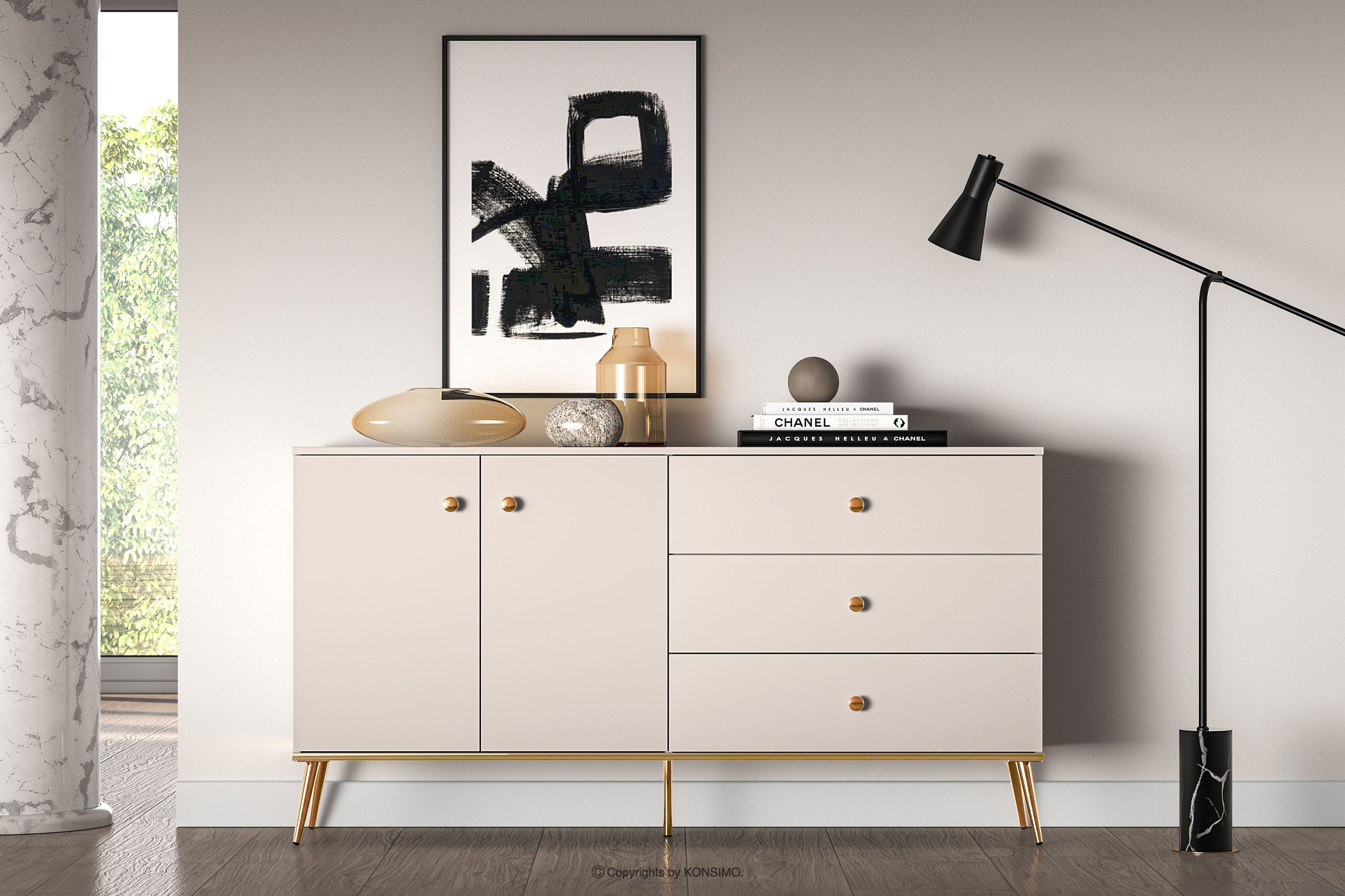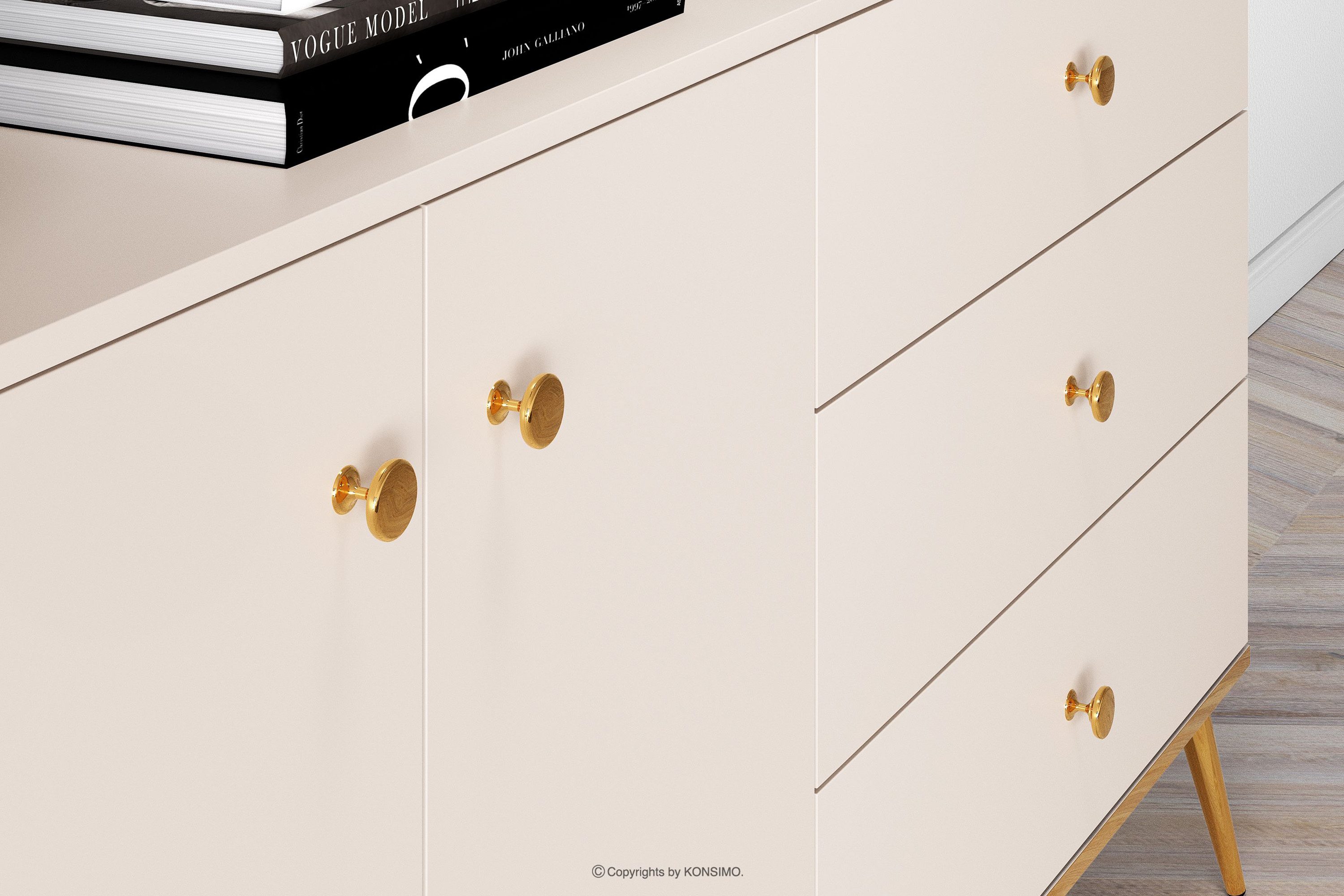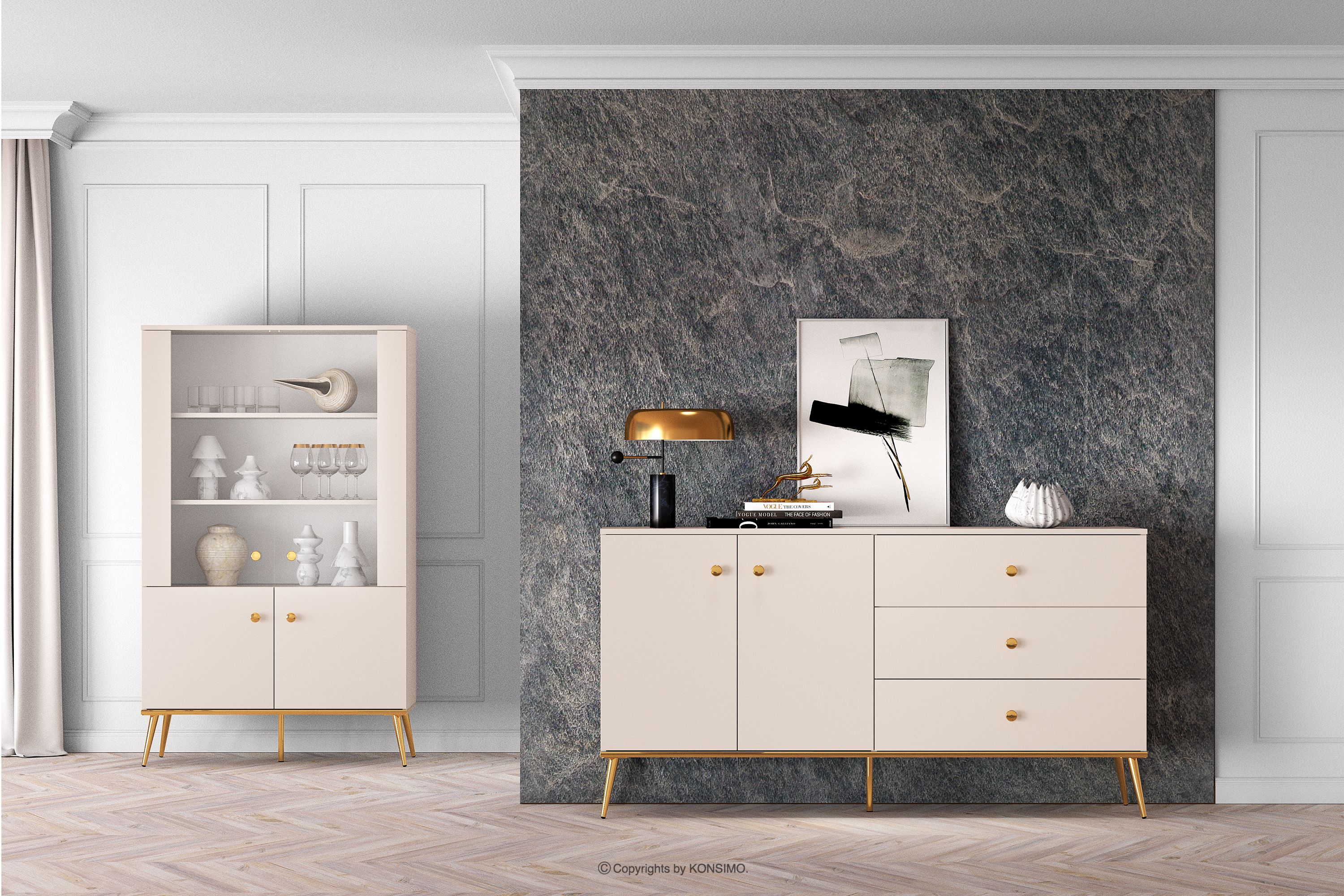 Szeroka komoda w stylu elegant kremowa zaprojektowana z myślą o osobach, które pragną wprowadzić do swoich wnętrz elementy klasy i luksusu. Metalowe uchwyty w kolorze złota oraz złote nóżki to detale, które podkreślają elegancję mebli i nadają im luksusowego charakteru. Płyta laminowana jest znana ze swojej odporności na uszkodzenia mechaniczne, zarysowania oraz działanie wilgoci, dzięki czemu meble zachowują swój pierwotny wygląd przez wiele lat.