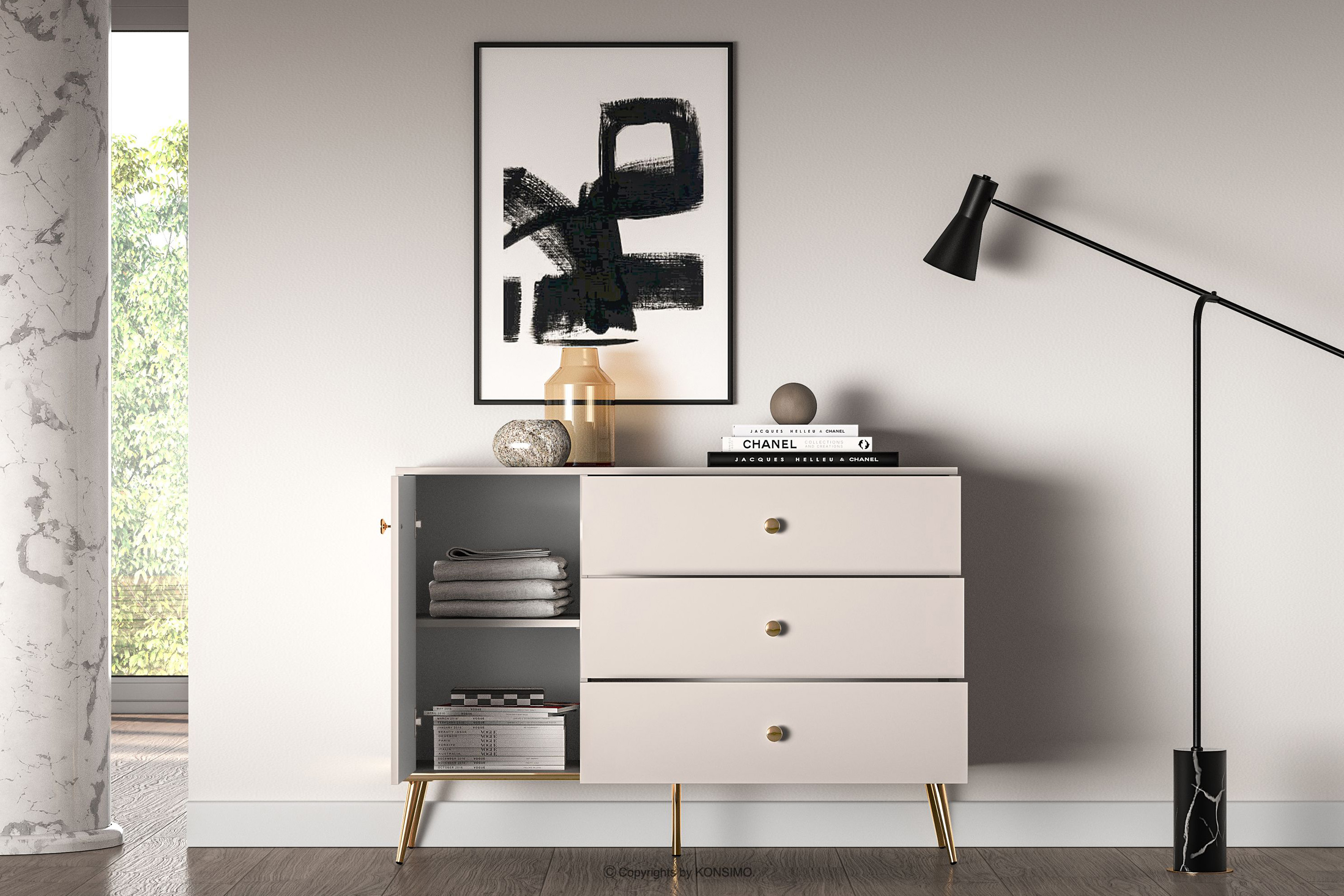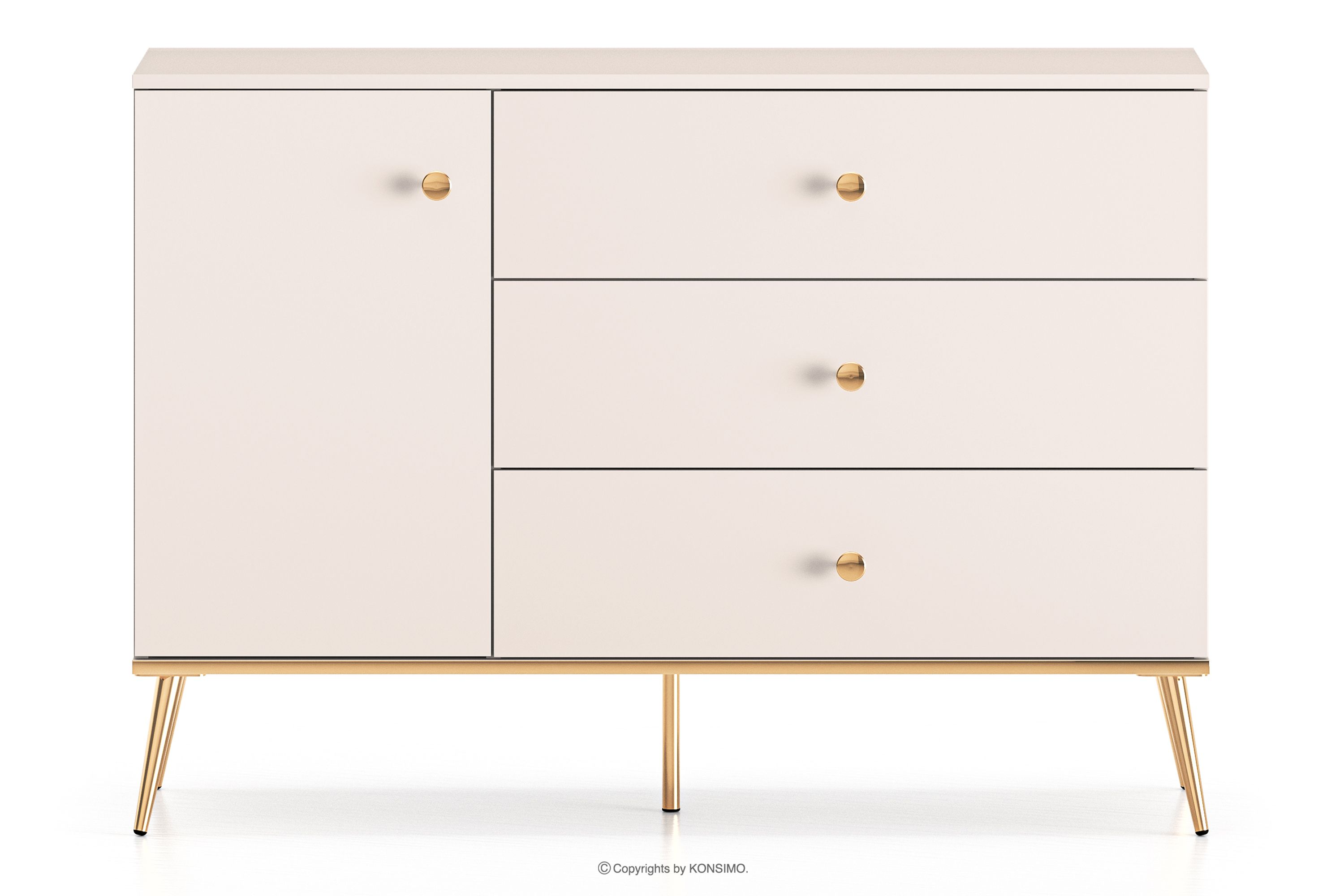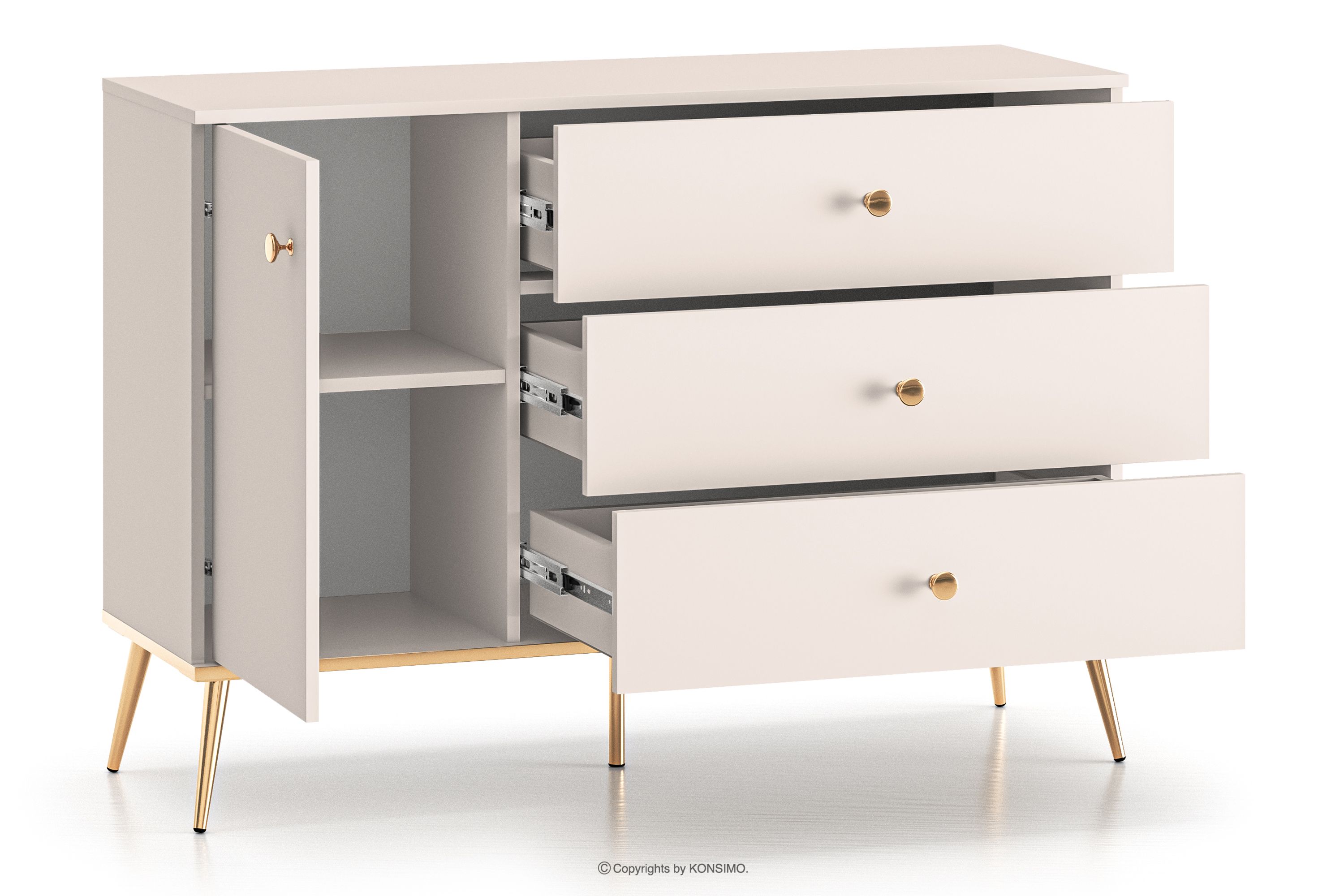 Komoda w stylu elegant kremowa zaprojektowana z myślą o osobach, które pragną wprowadzić do swoich wnętrz elementy klasy i luksusu. Metalowe uchwyty w kolorze złota oraz złote nóżki to detale, które podkreślają elegancję mebli i nadają im luksusowego charakteru. Płyta laminowana jest znana ze swojej odporności na uszkodzenia mechaniczne, zarysowania oraz działanie wilgoci, dzięki czemu meble zachowują swój pierwotny wygląd przez wiele lat.