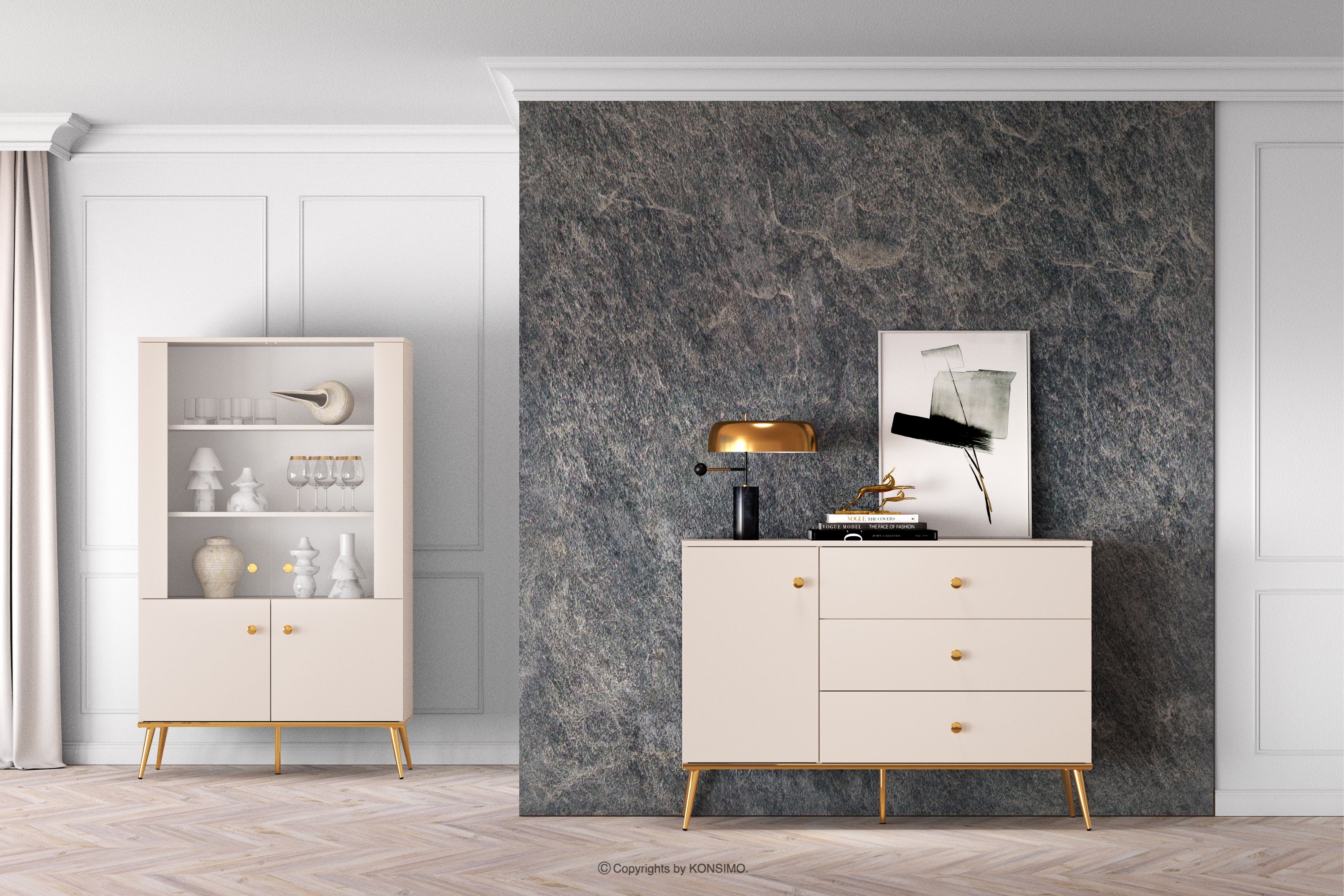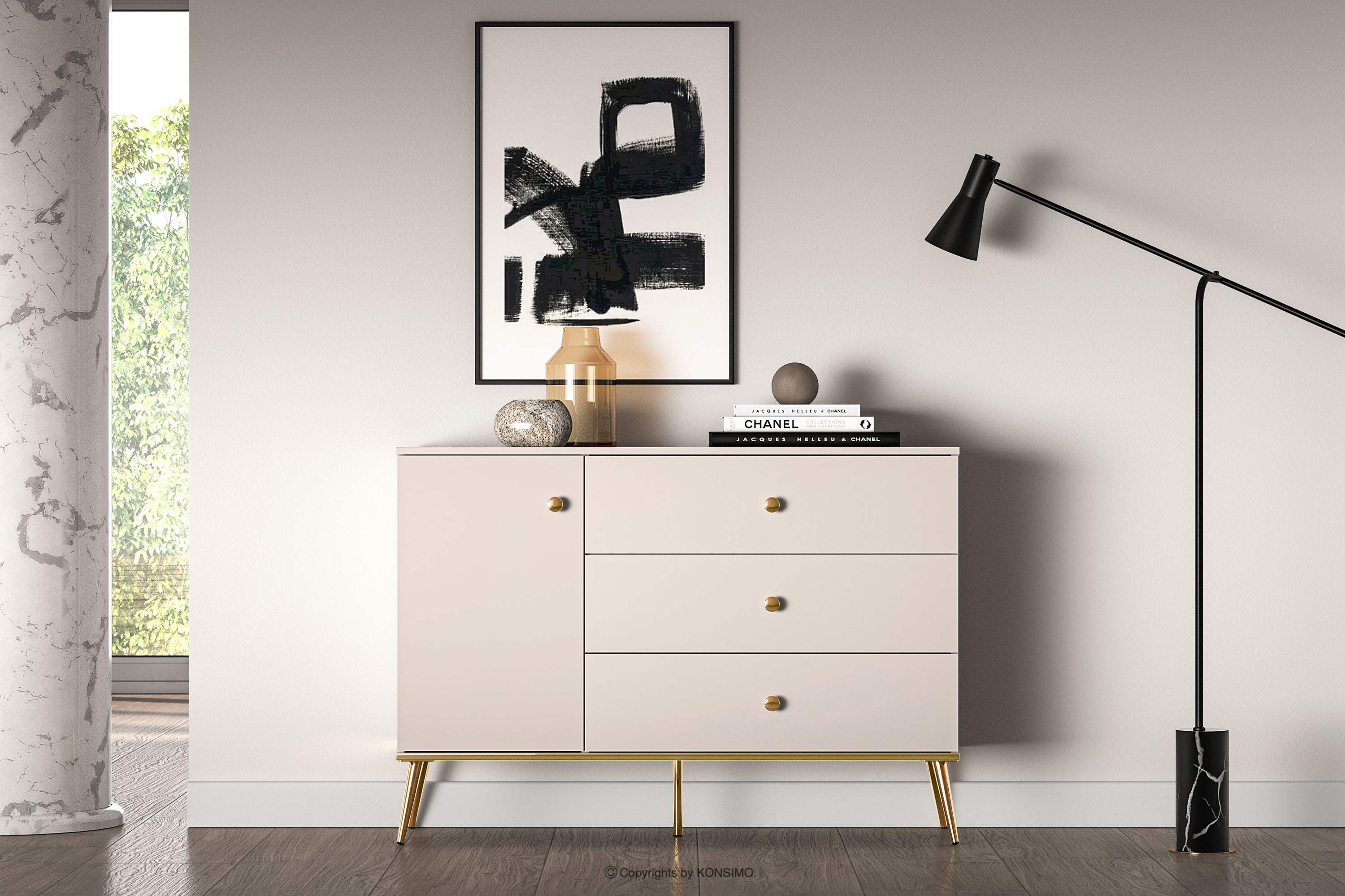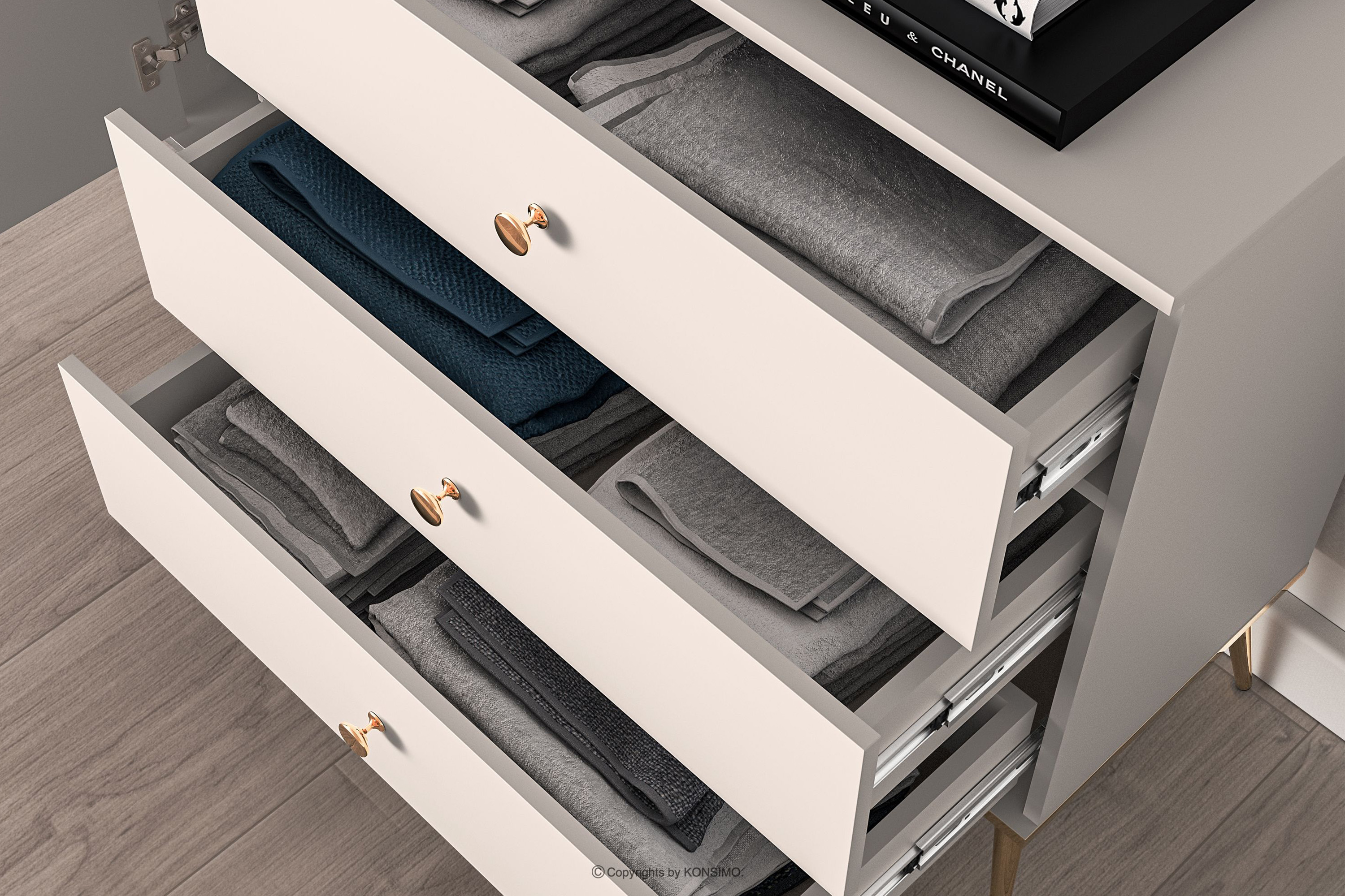 Komoda w stylu elegant kremowa zaprojektowana z myślą o osobach, które pragną wprowadzić do swoich wnętrz elementy klasy i luksusu. Metalowe uchwyty w kolorze złota oraz złote nóżki to detale, które podkreślają elegancję mebli i nadają im luksusowego charakteru. Płyta laminowana jest znana ze swojej odporności na uszkodzenia mechaniczne, zarysowania oraz działanie wilgoci, dzięki czemu meble zachowują swój pierwotny wygląd przez wiele lat.