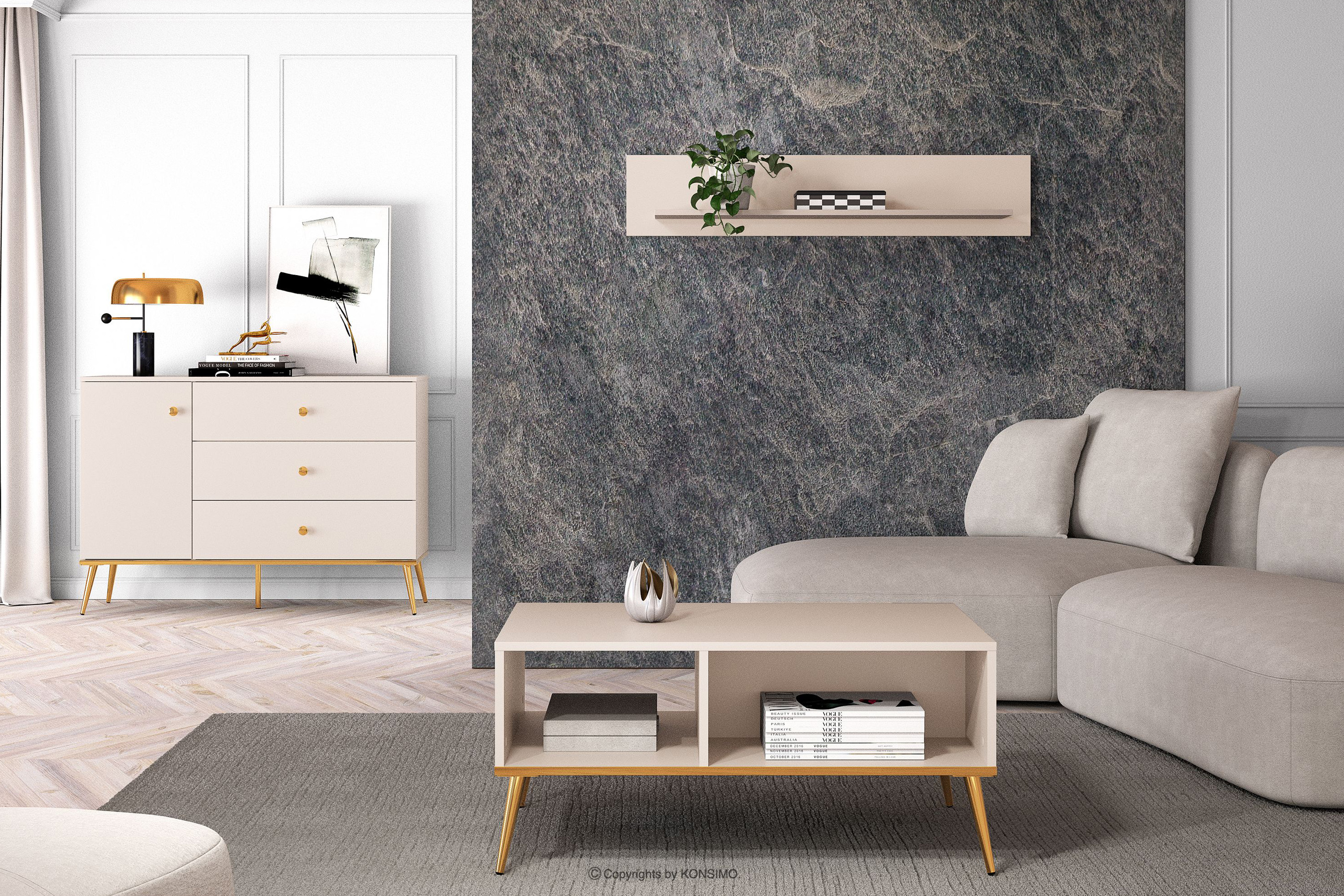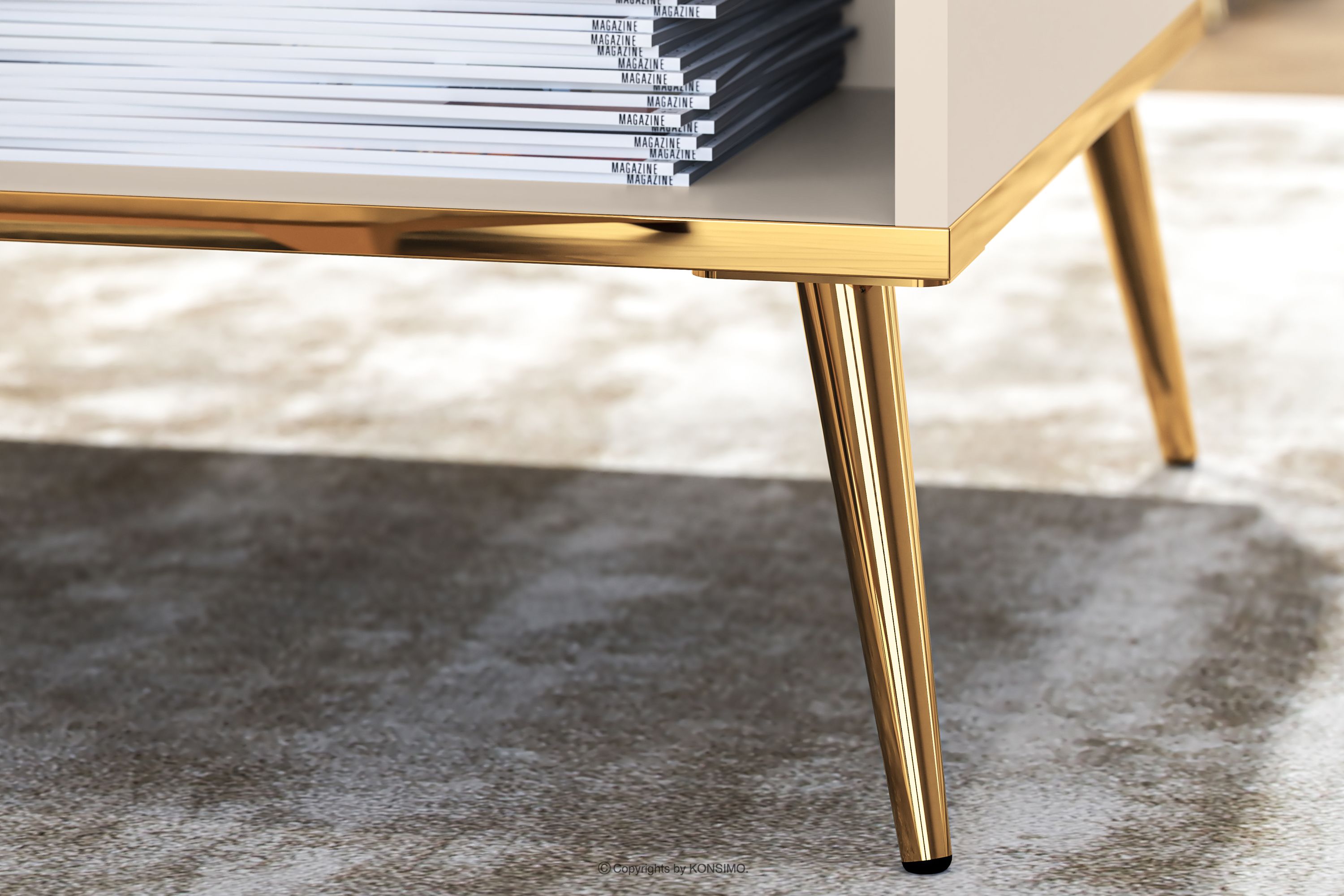 Stolik kawowy w stylu elegant kremowy zaprojektowana z myślą o osobach, które pragną wprowadzić do swoich wnętrz elementy klasy i luksusu. Metalowe złote nóżki to detale, które podkreślają elegancję mebli i nadają im luksusowego charakteru. Płyta laminowana jest znana ze swojej odporności na uszkodzenia mechaniczne, zarysowania oraz działanie wilgoci, dzięki czemu meble zachowują swój pierwotny wygląd przez wiele lat.